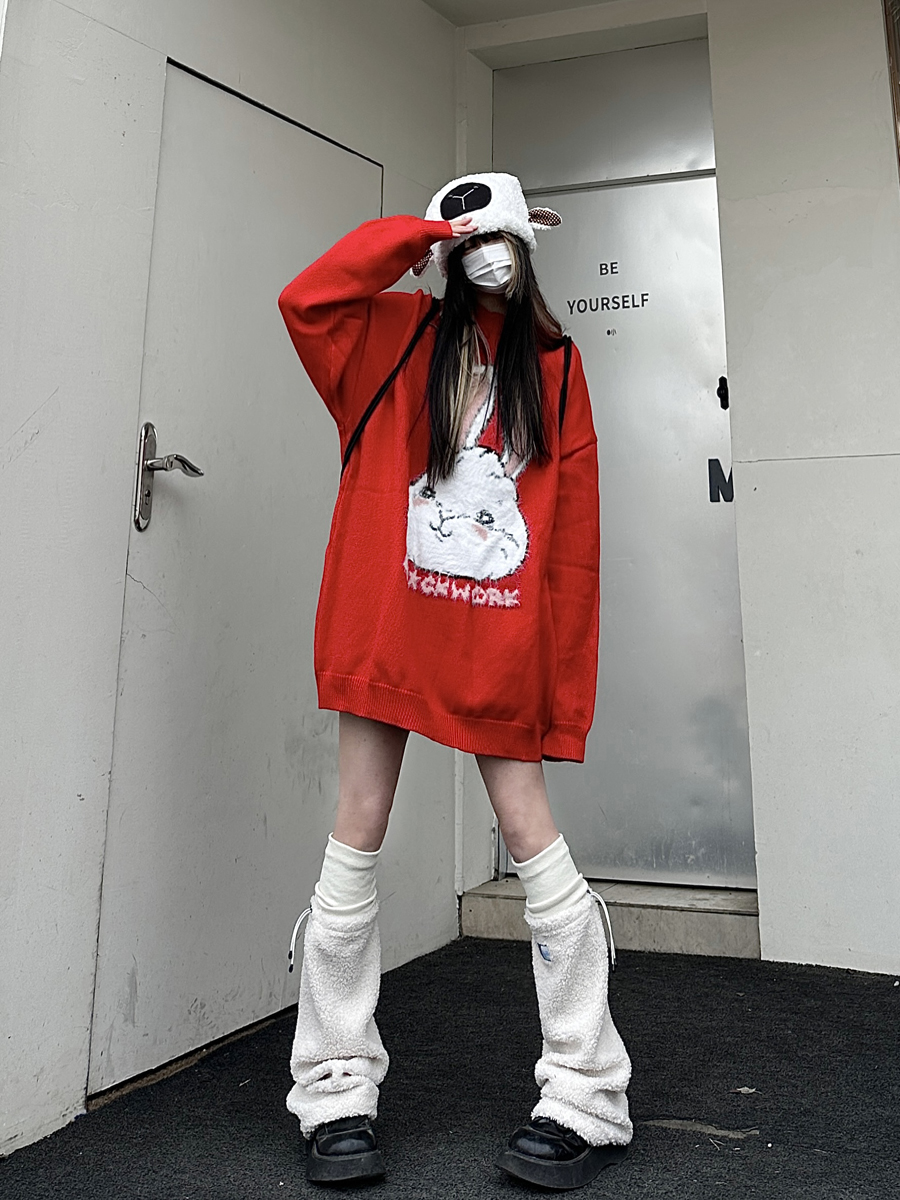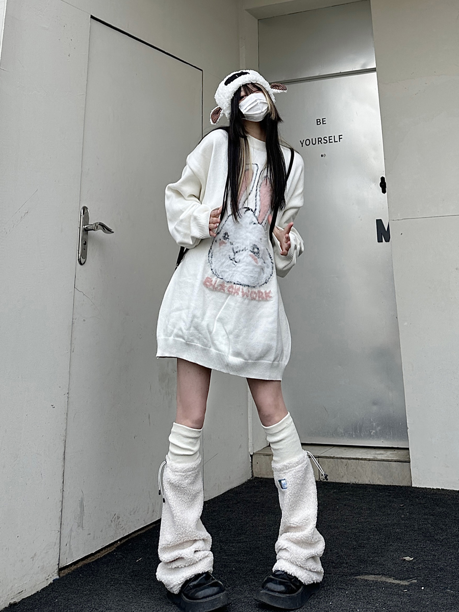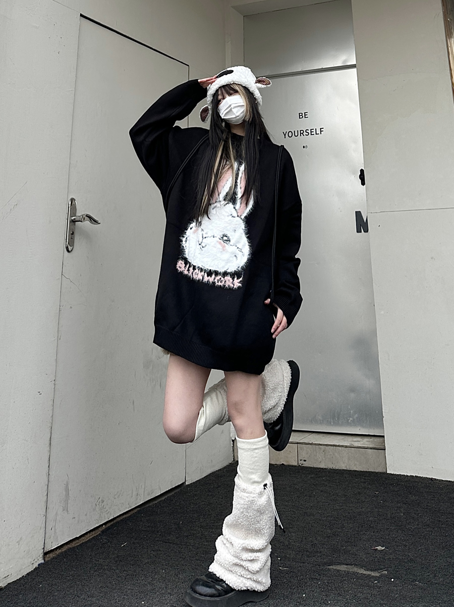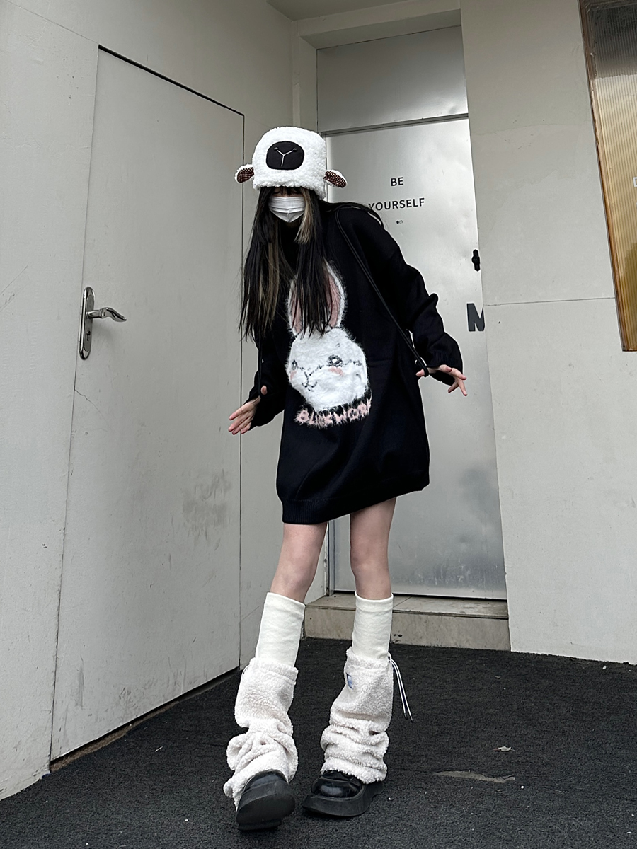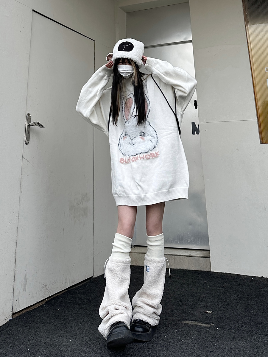 咖哩人原創新款毛絨兔子字母寬鬆圓領毛衣冬季百搭加厚長袖上衣