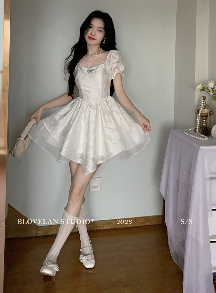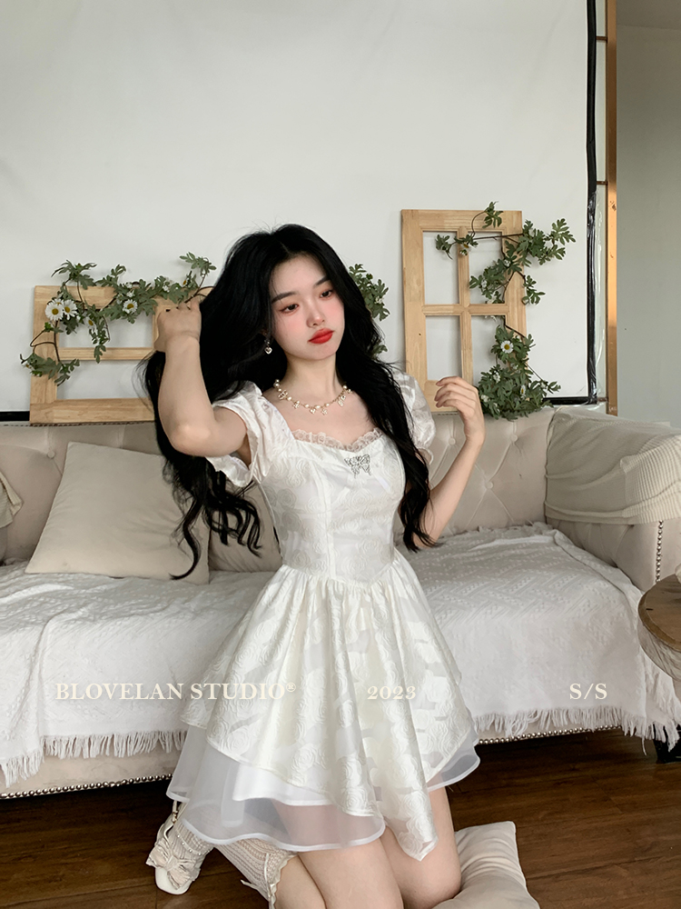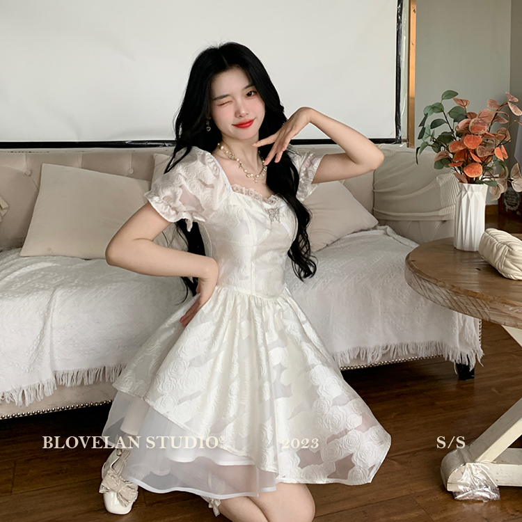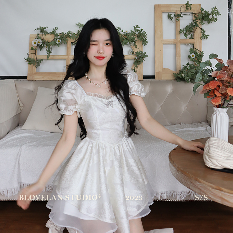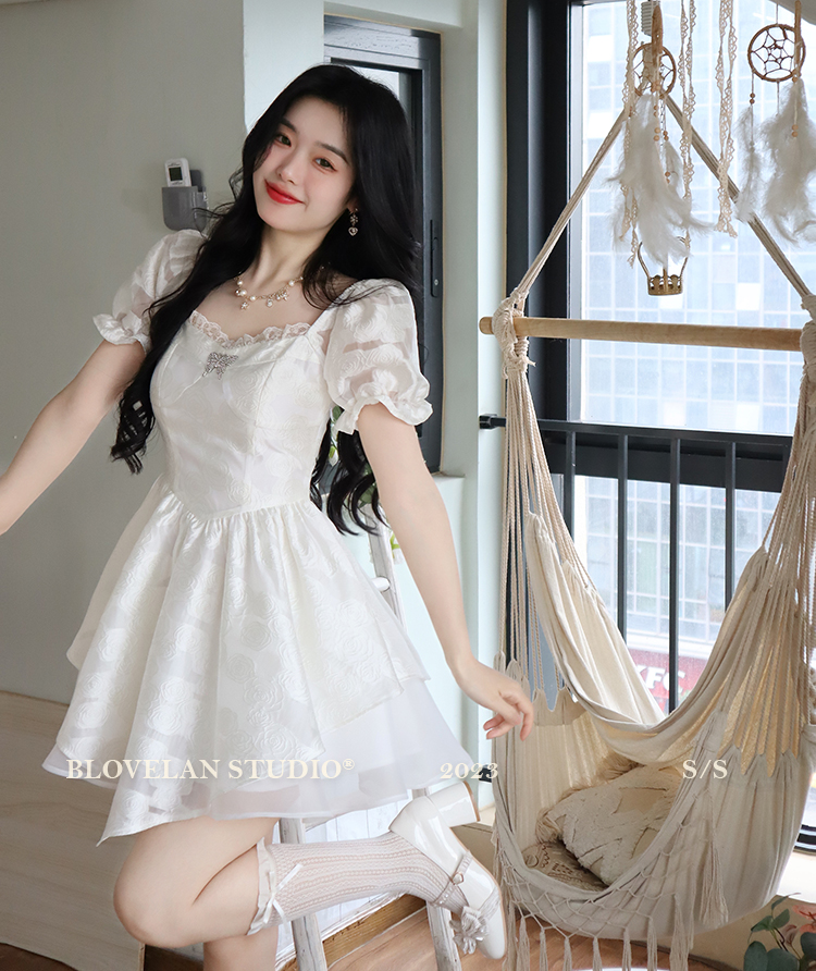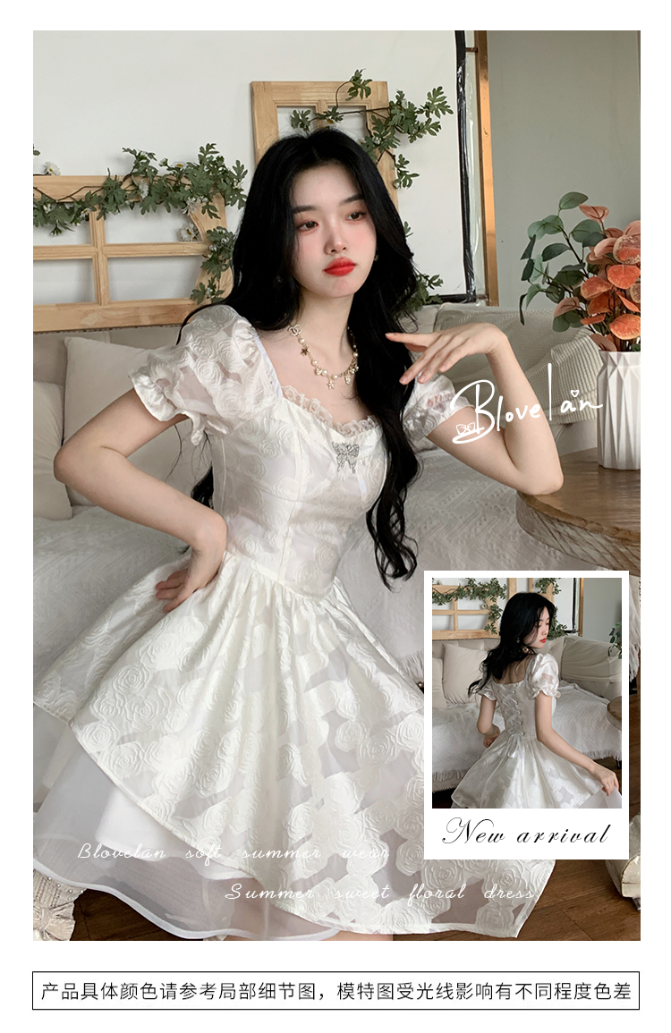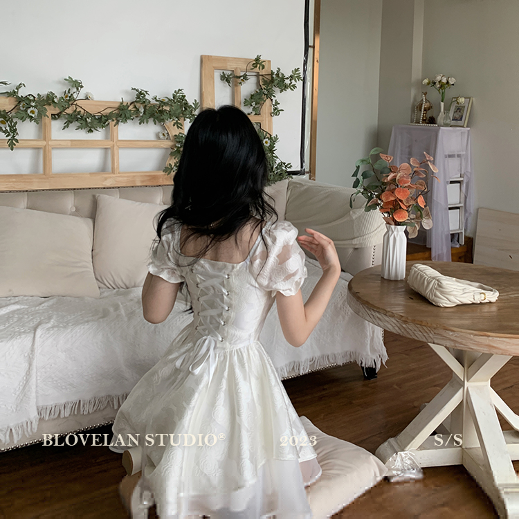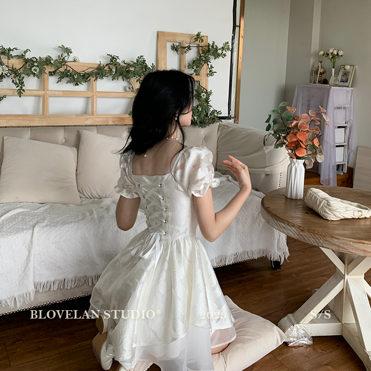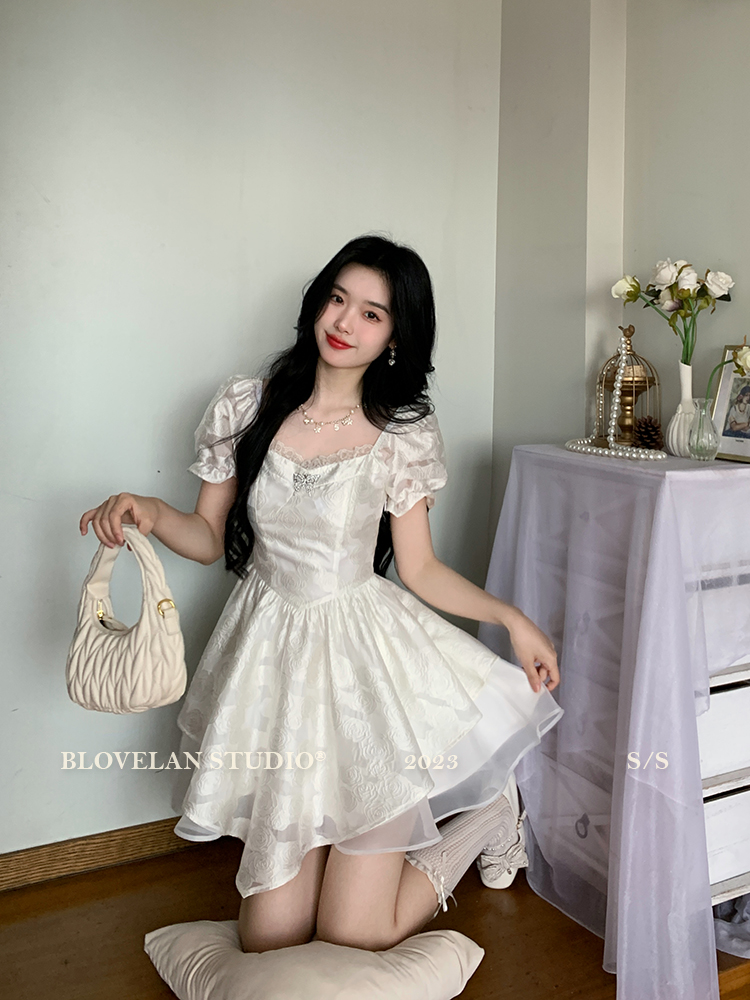 Blovelan綿綿芝士 甜美短裙方領提花蕾絲高腰泡泡袖洋裝女夏季