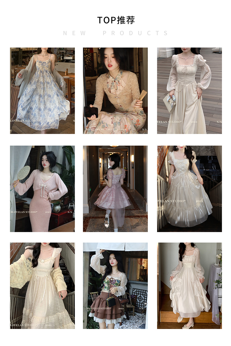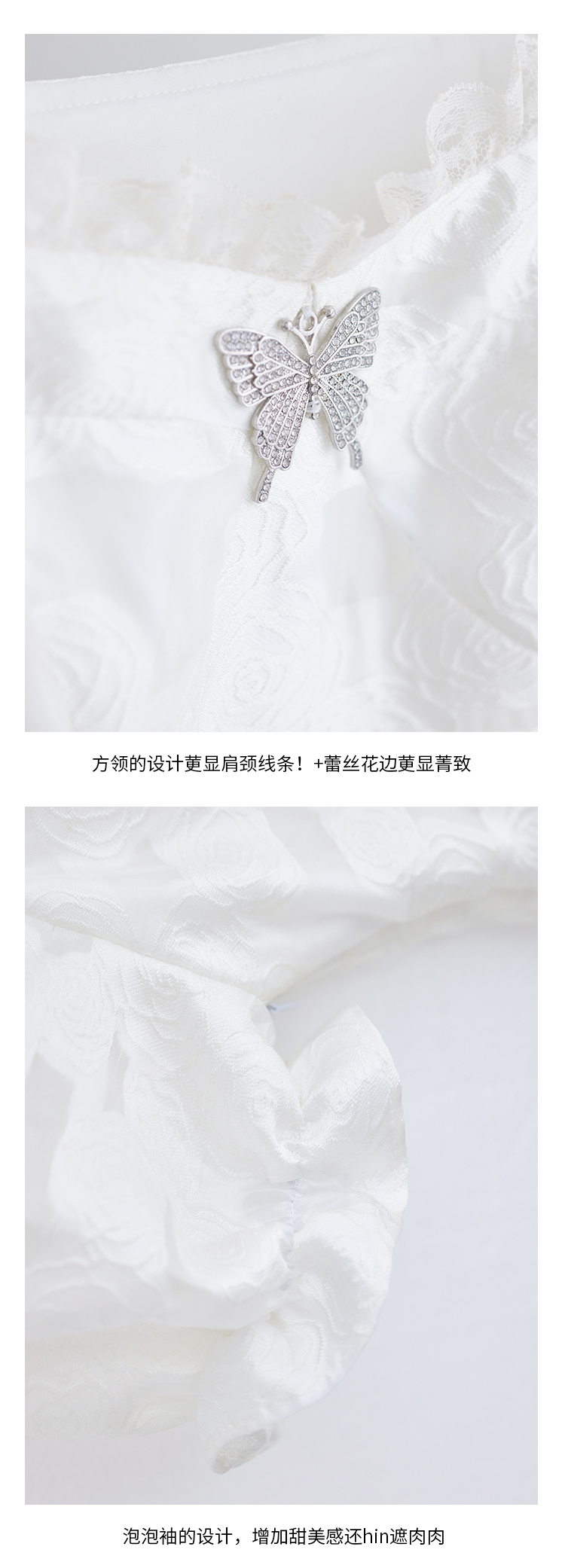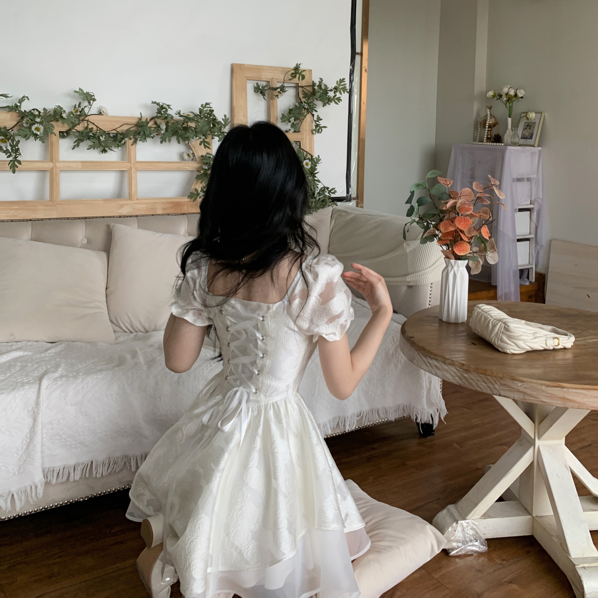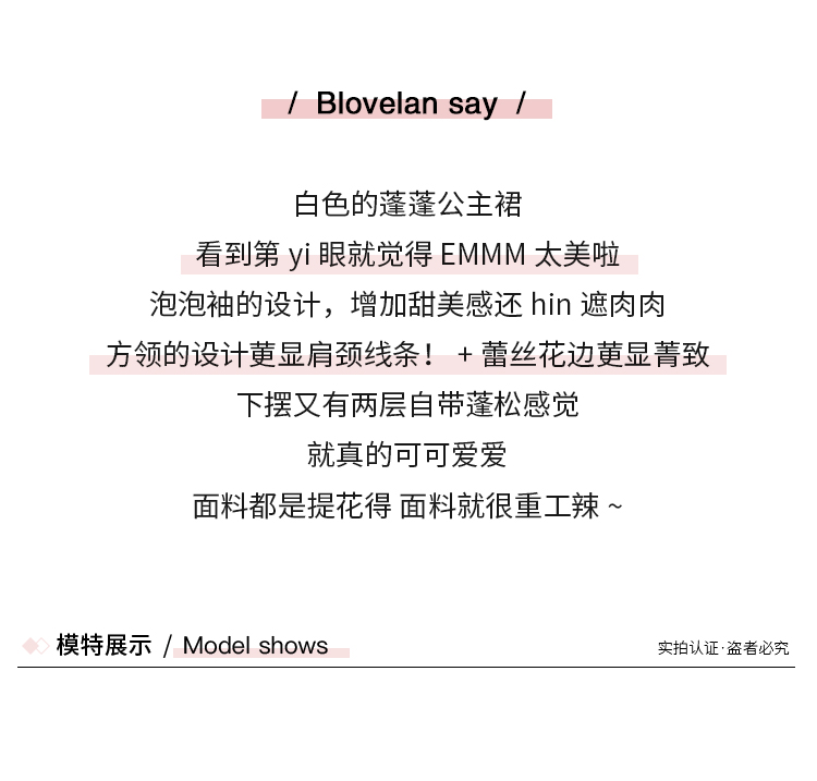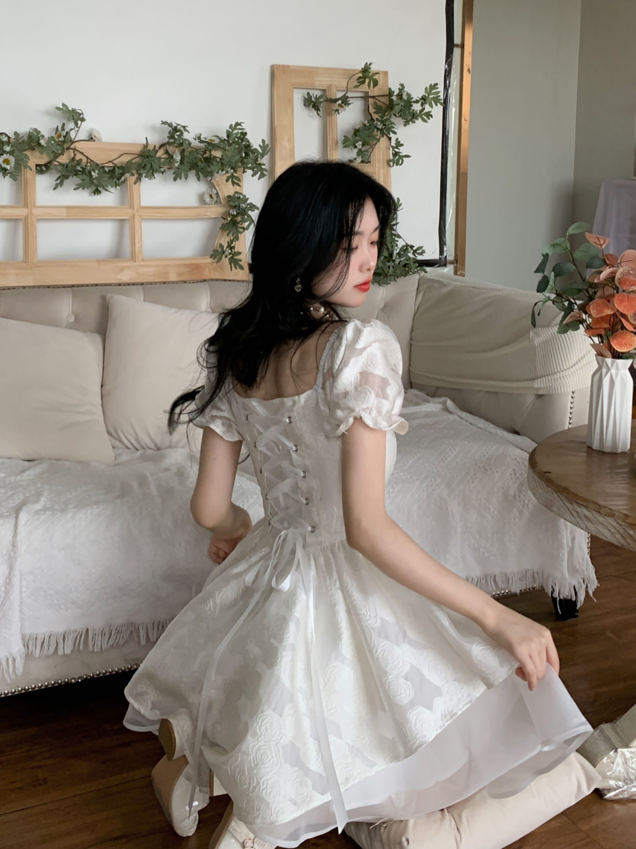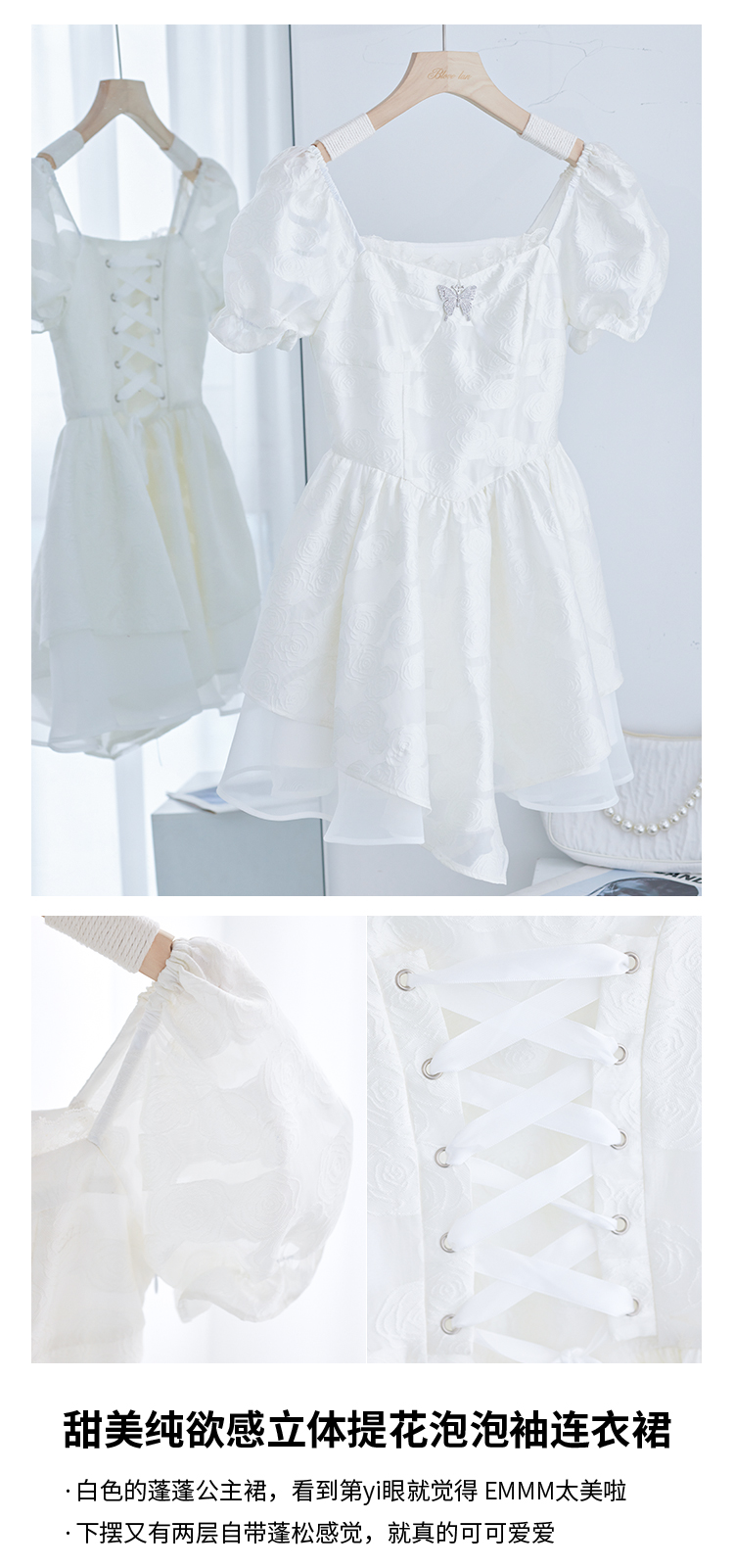 Blovelan綿綿芝士 甜美短裙方領提花蕾絲高腰泡泡袖洋裝女夏季