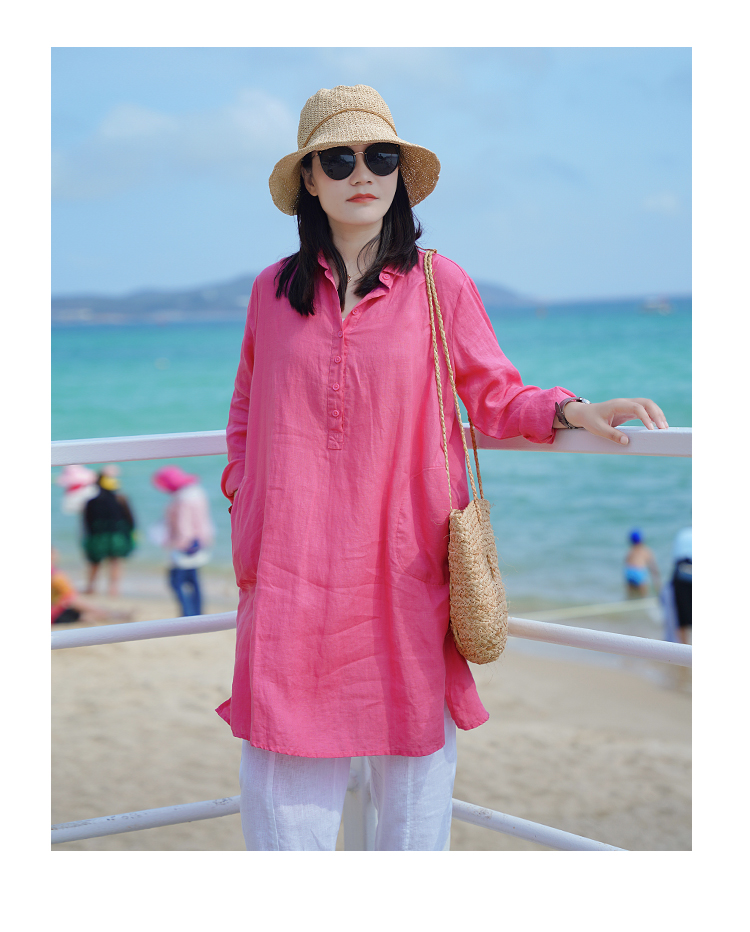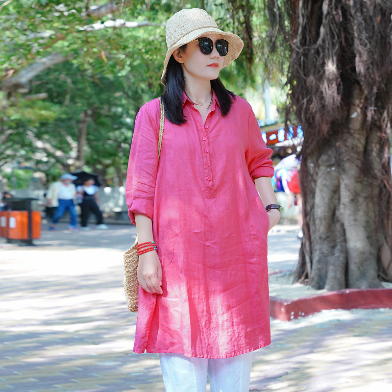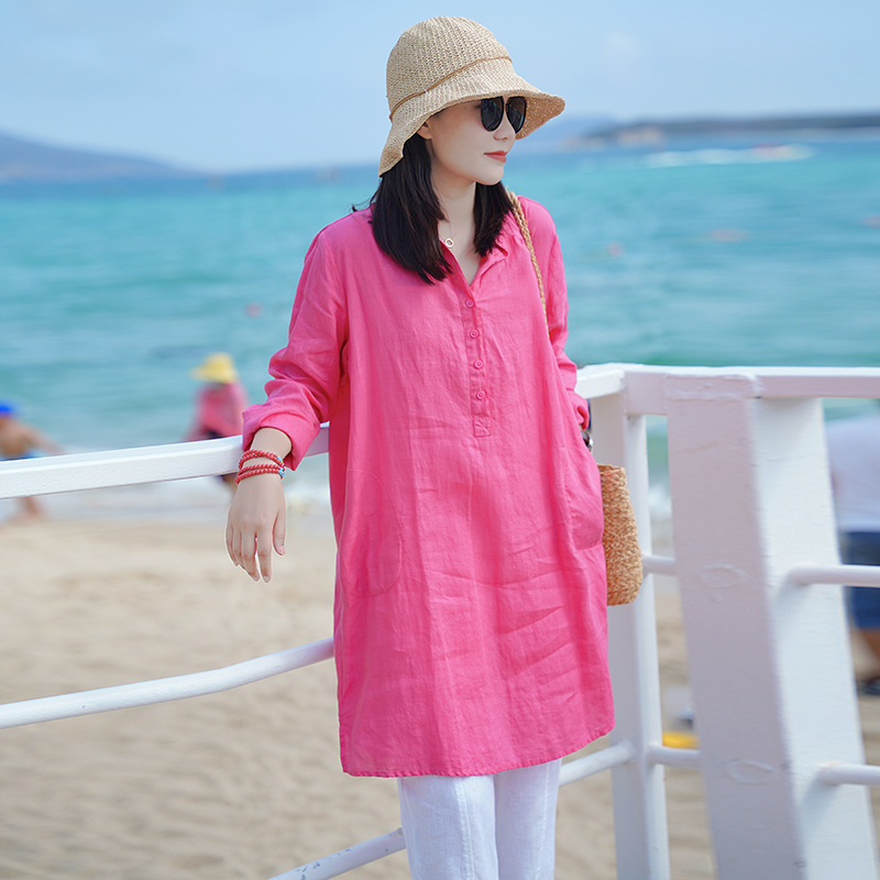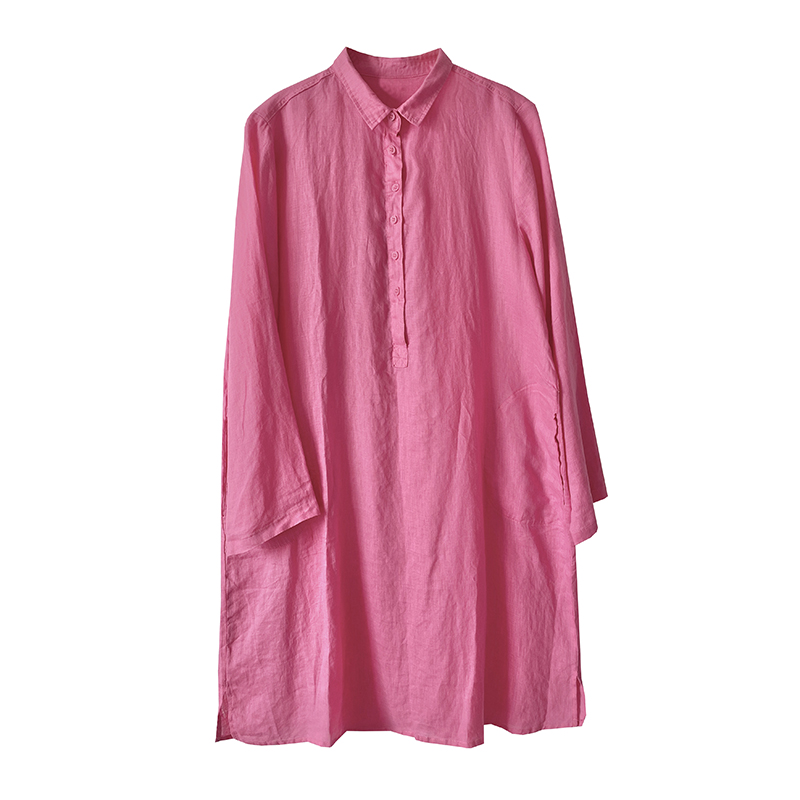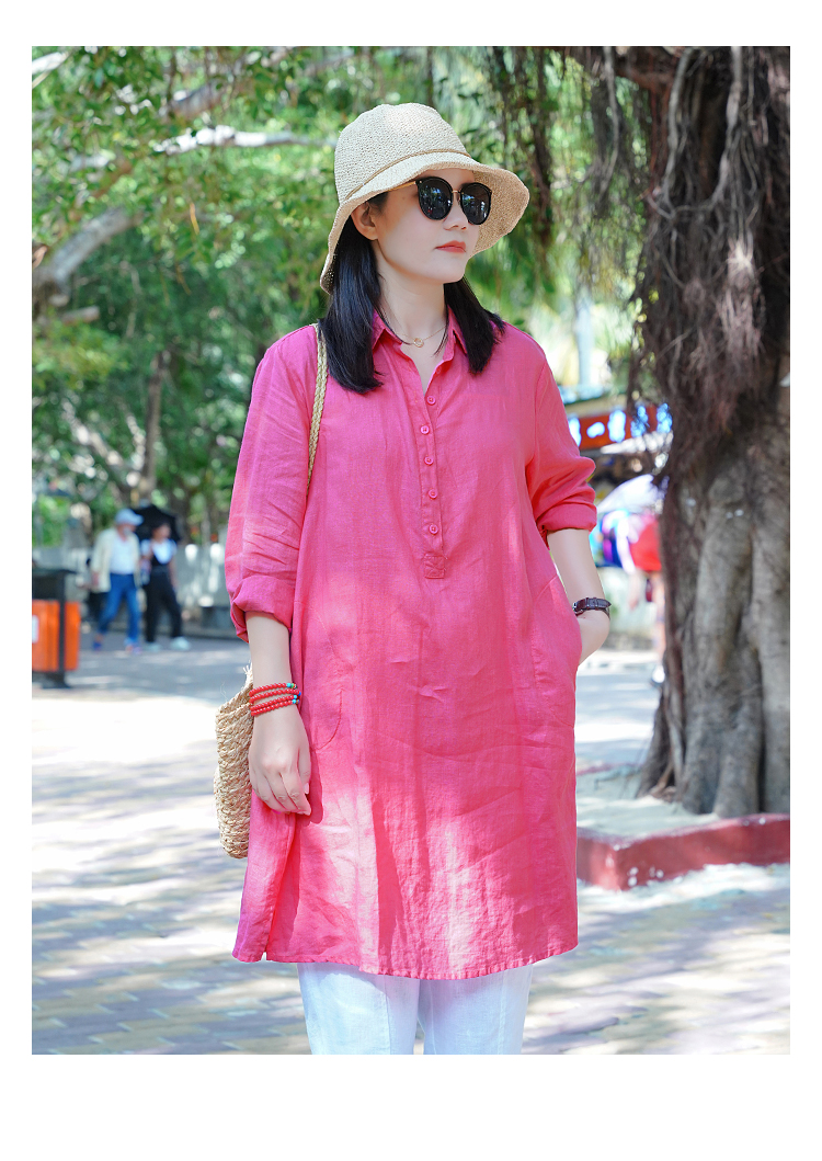簡單長久陪伴 水洗麻料 復古寬鬆polo領亞麻上衣女中長版棉麻襯衫