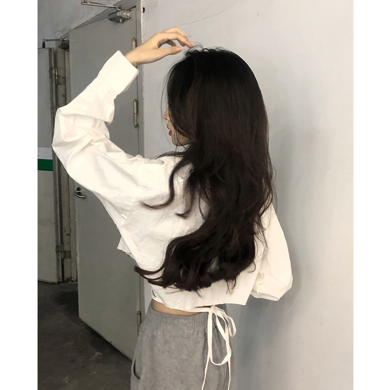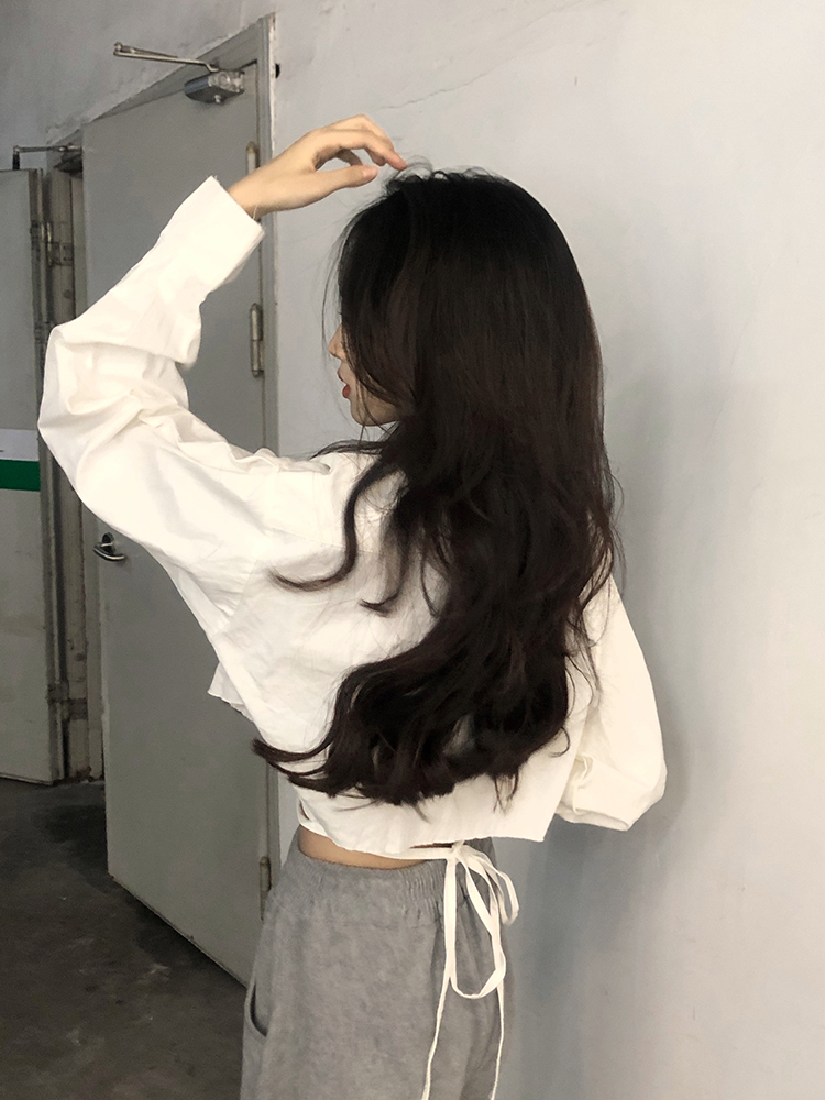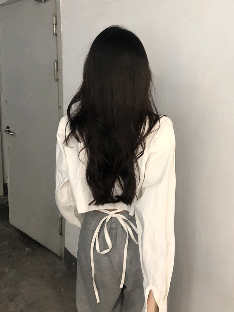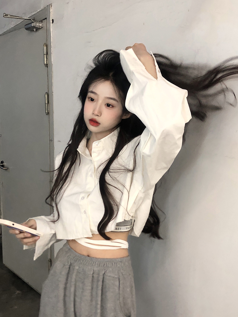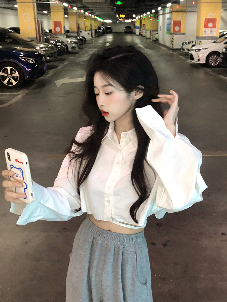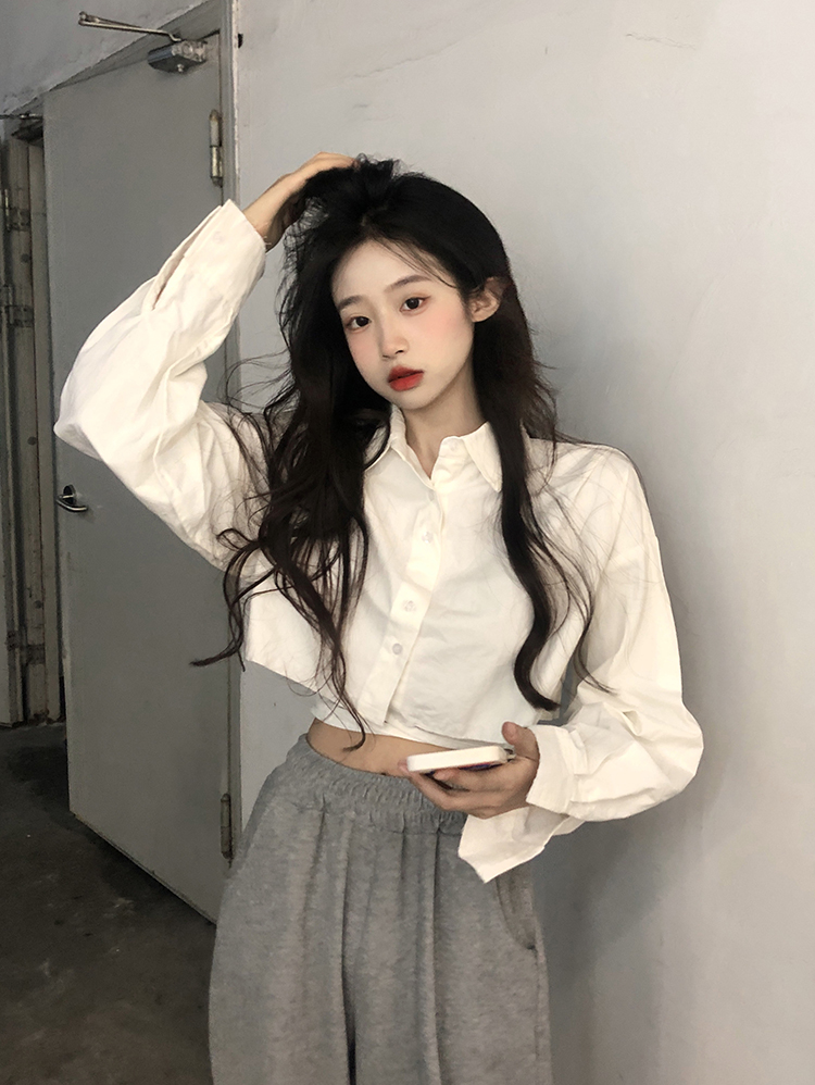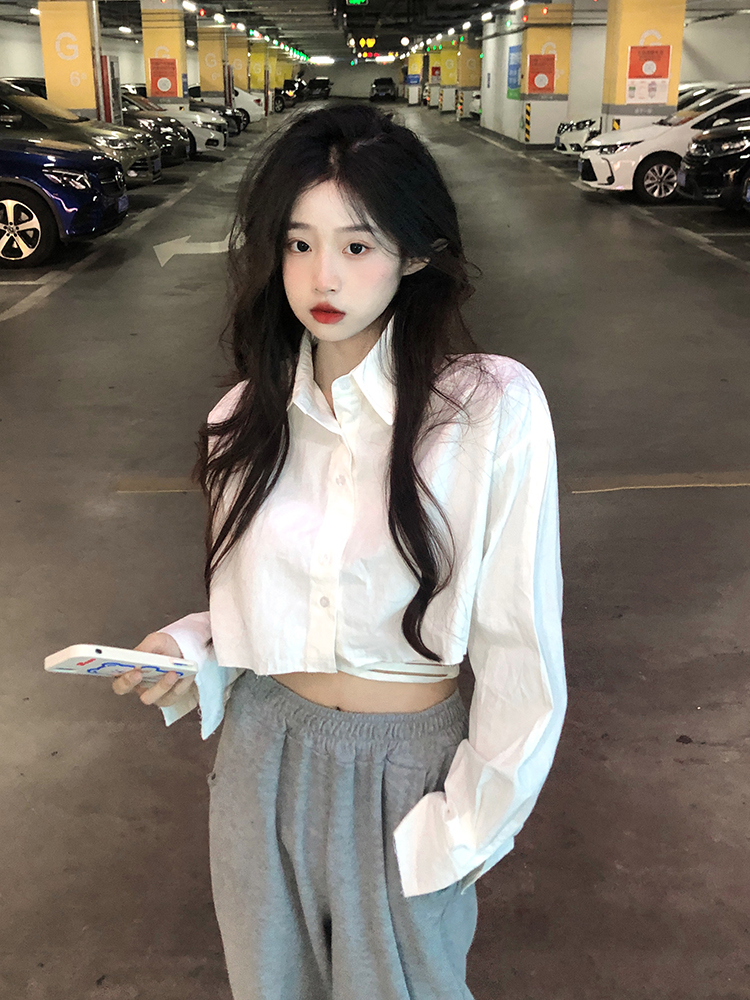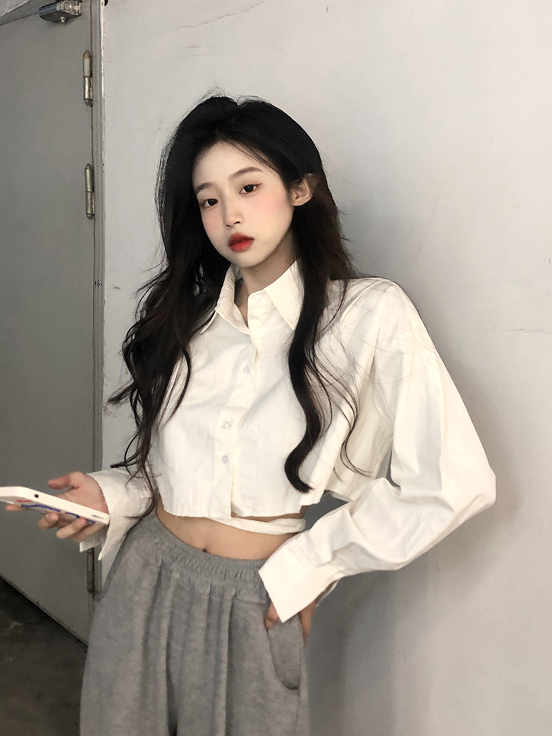 白色短款防曬襯衫女韓版POLO領寬鬆小個子甜辣獨特別致上衣外套春