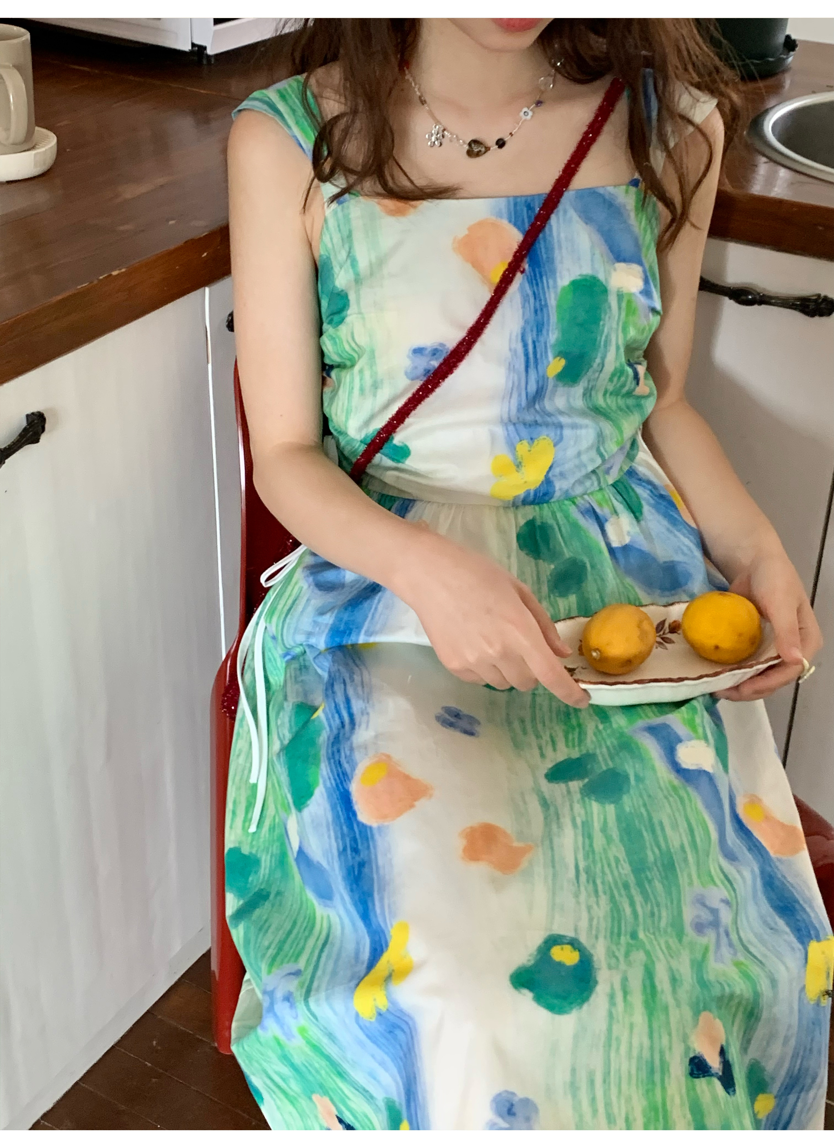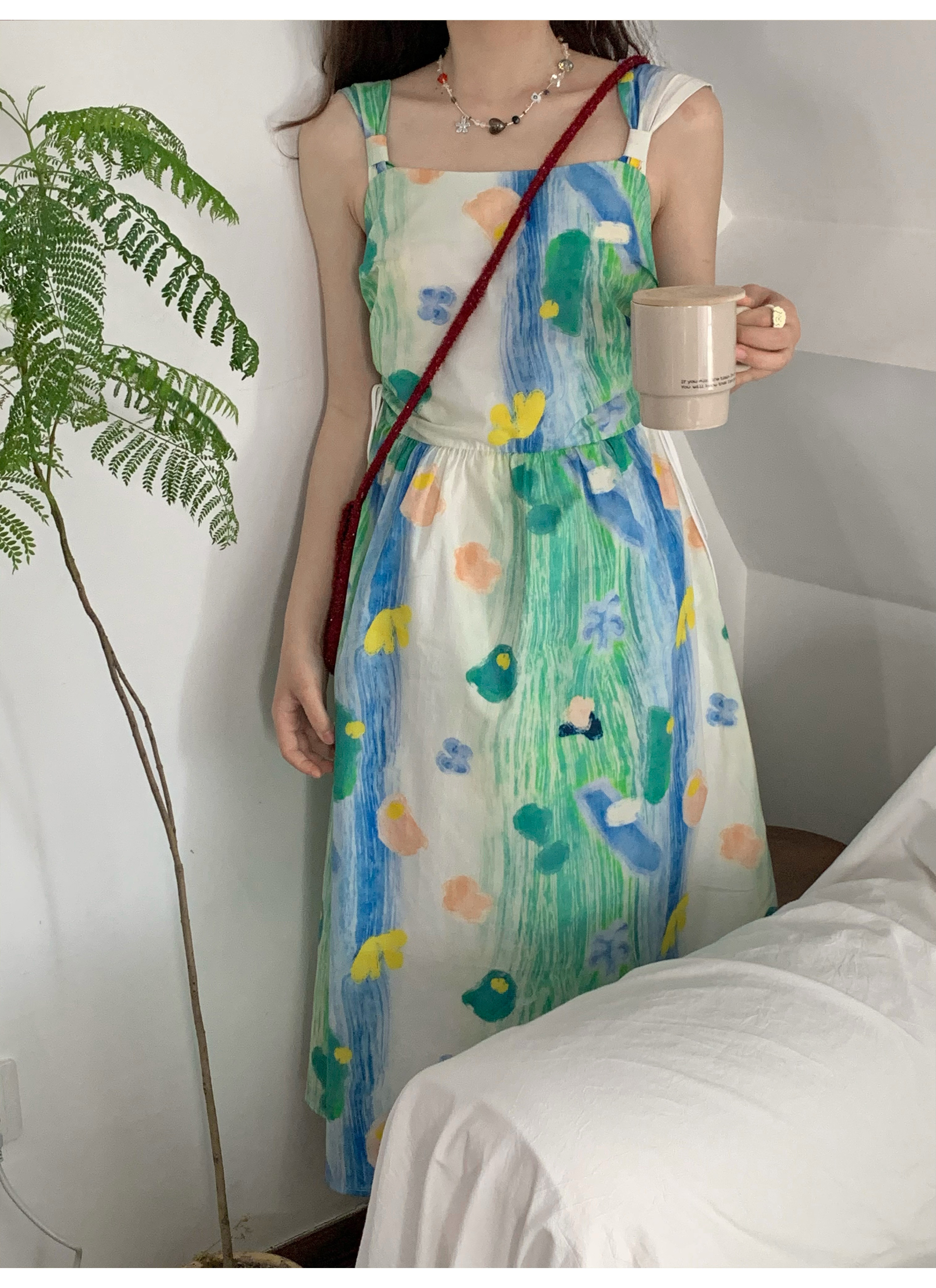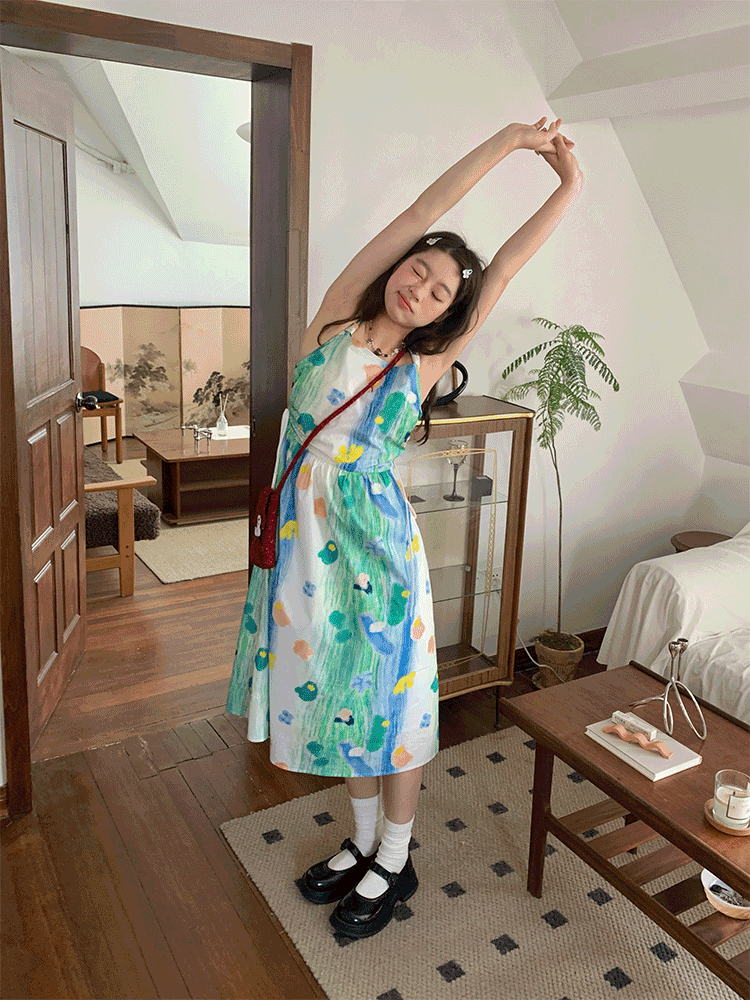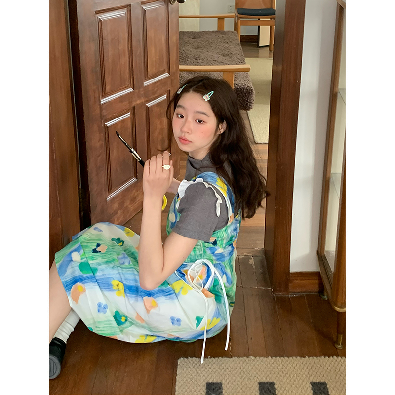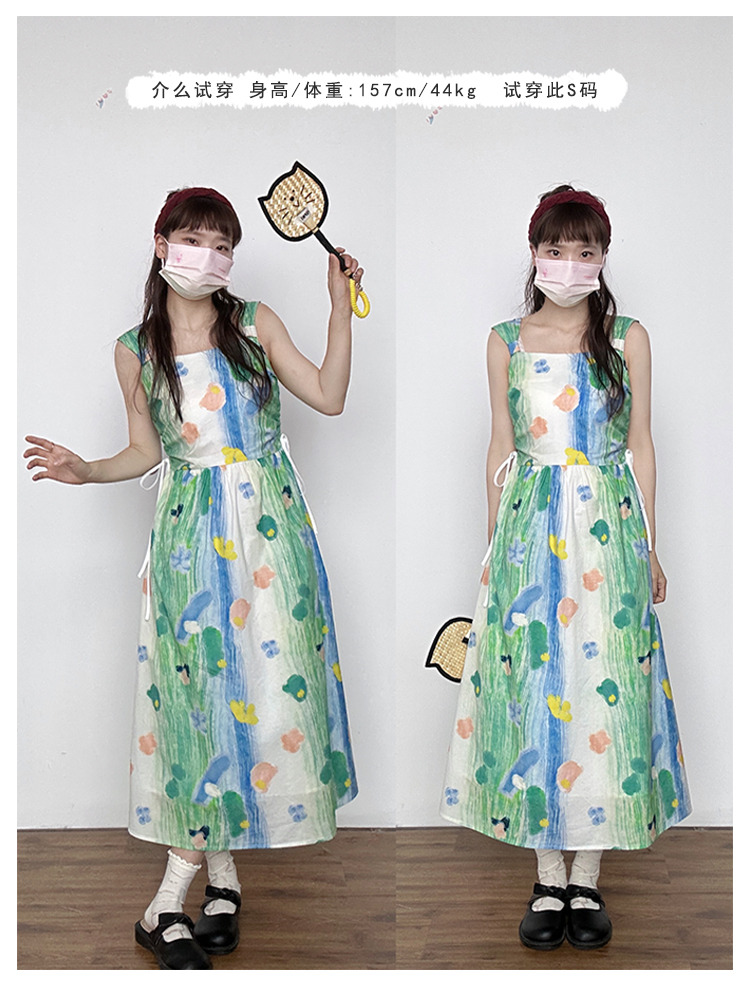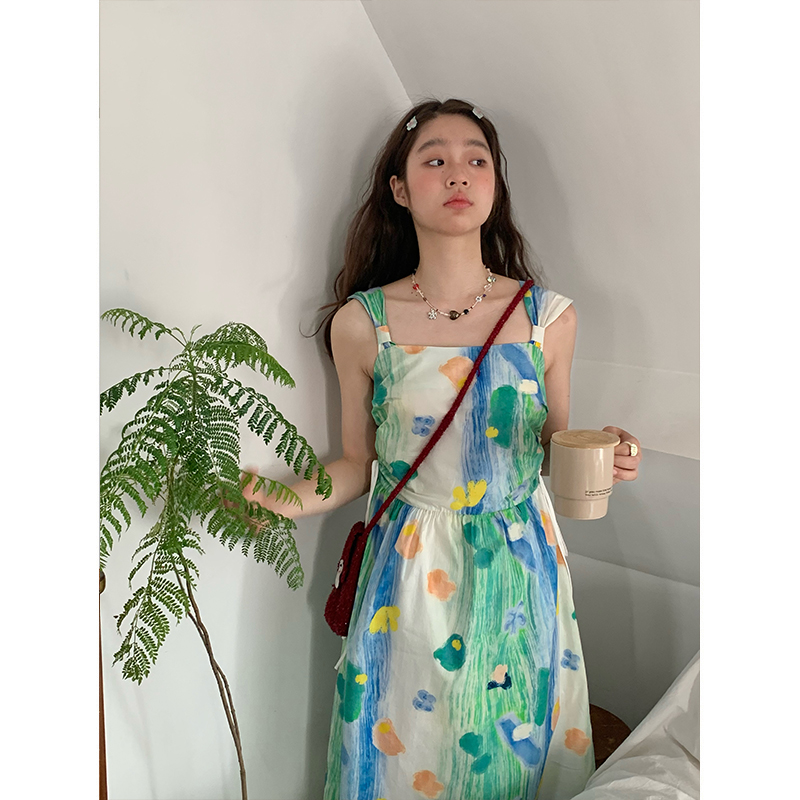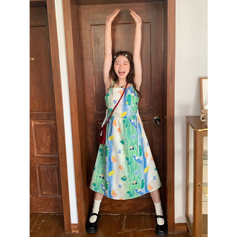 嘿山姥姥 油畫吊帶裙子女夏季新款甜美少女顯瘦抱嬰袋中長裙