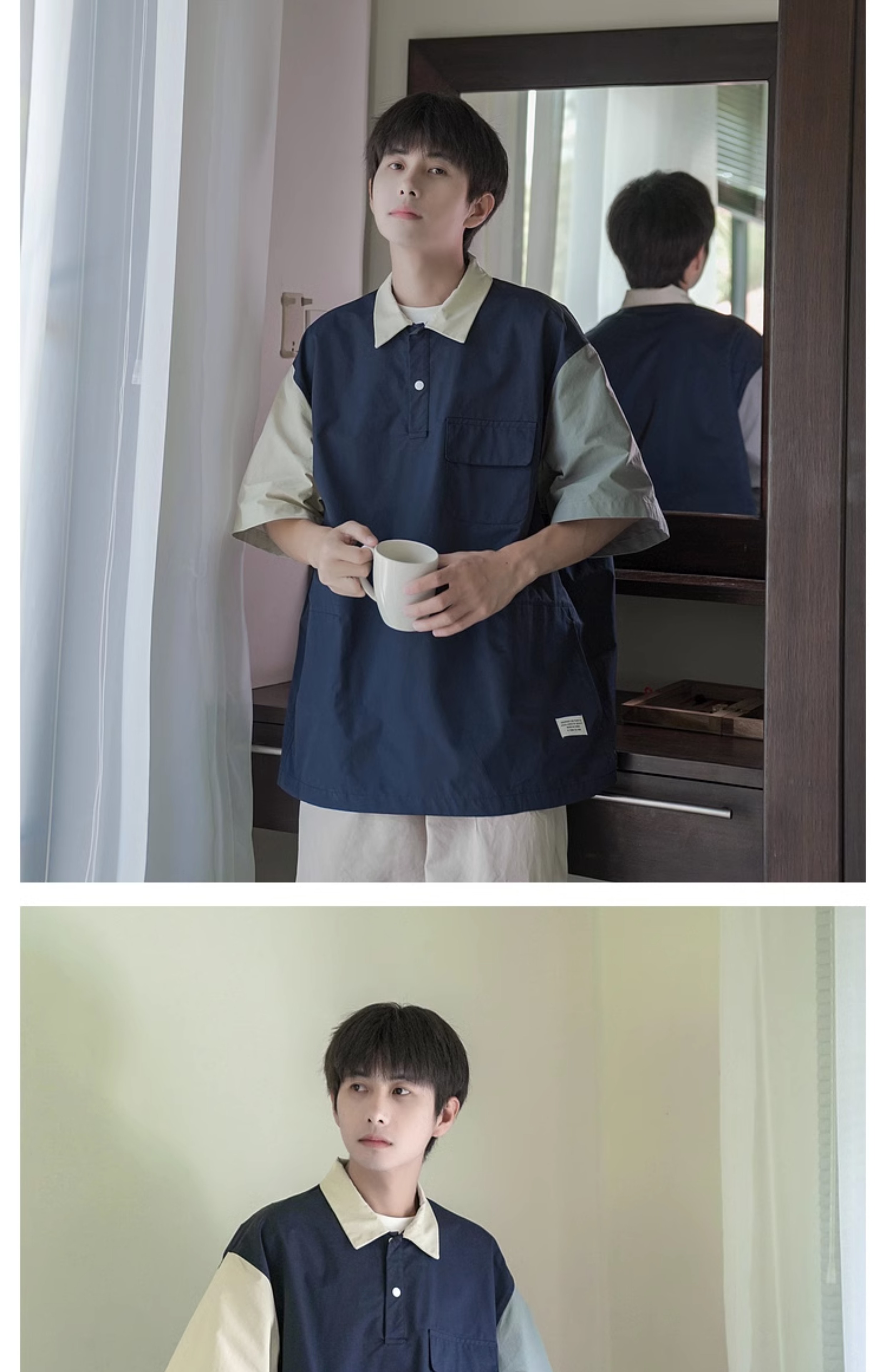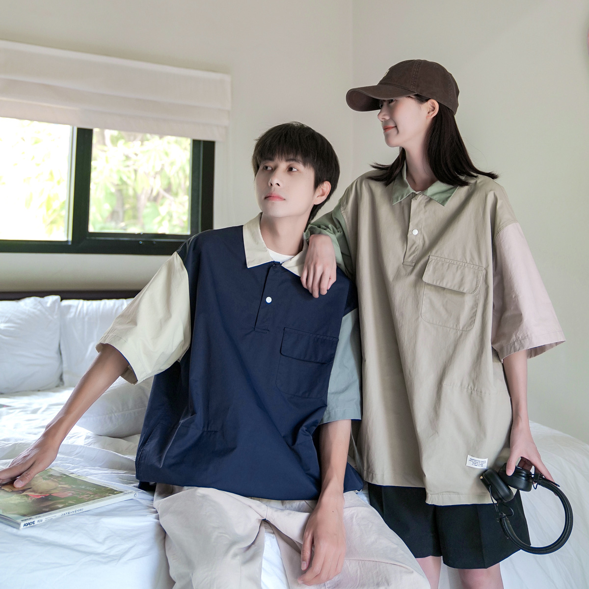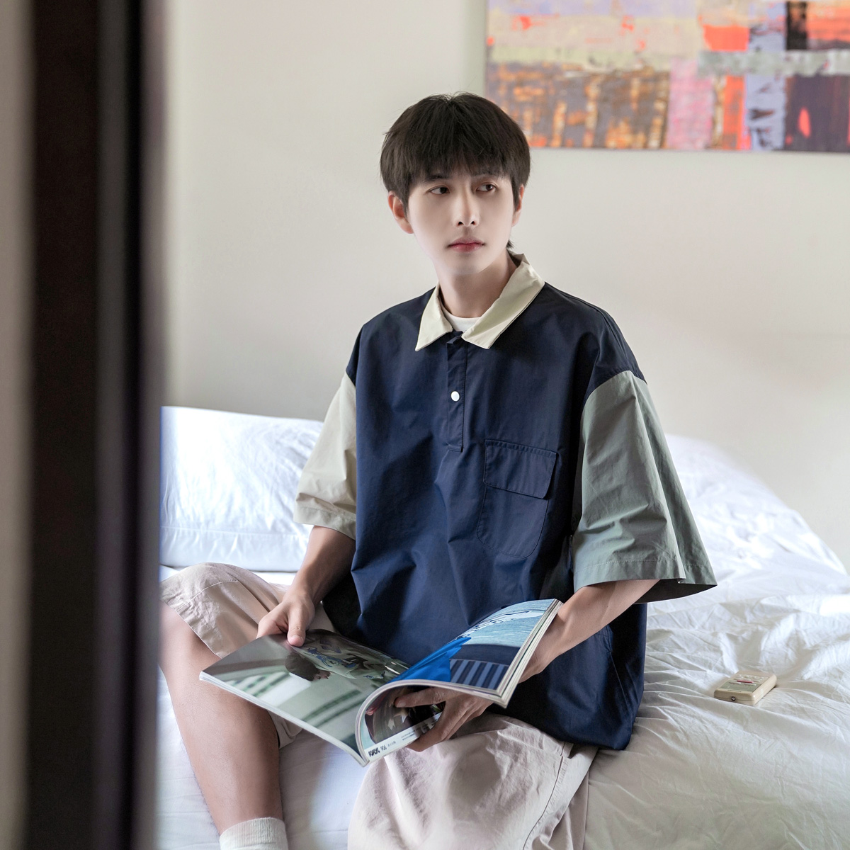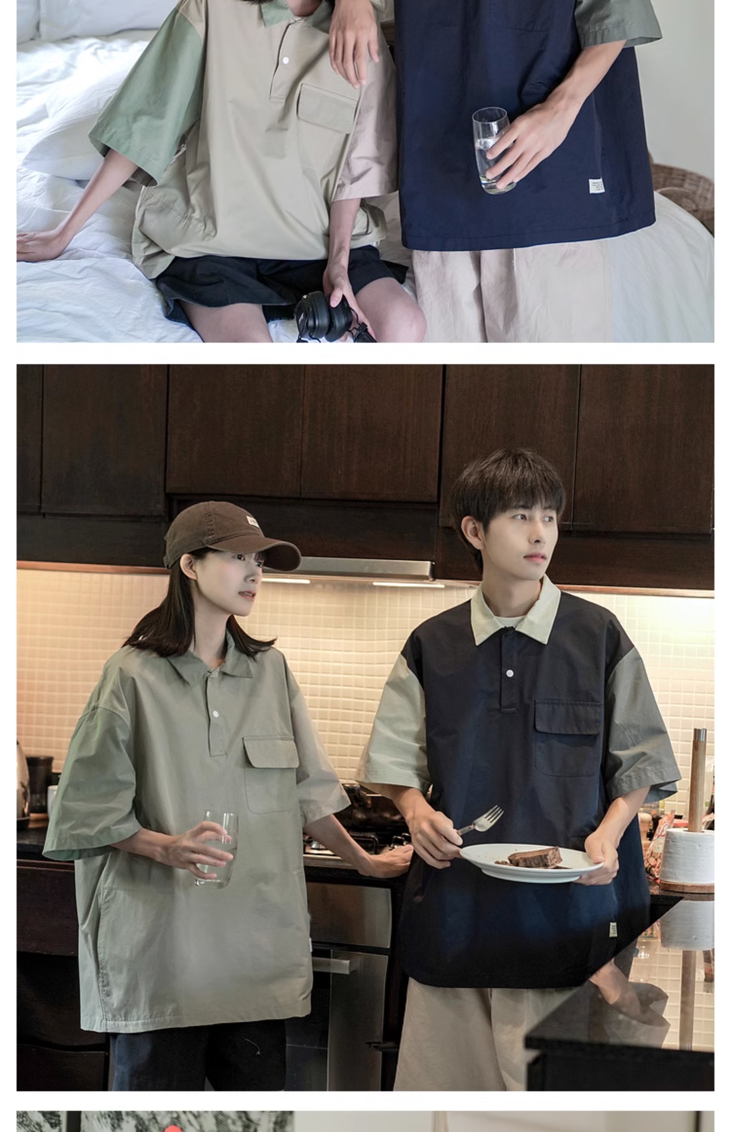 @港仔文藝男 美式拼接短袖polo衫男夏季寬鬆撞色襯衫領工裝短袖
