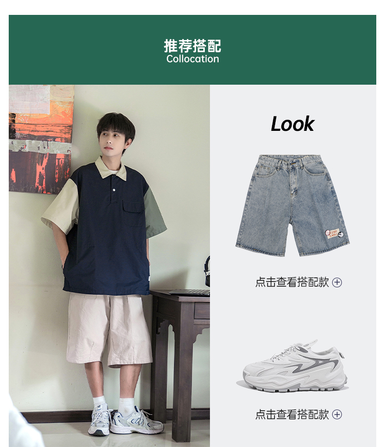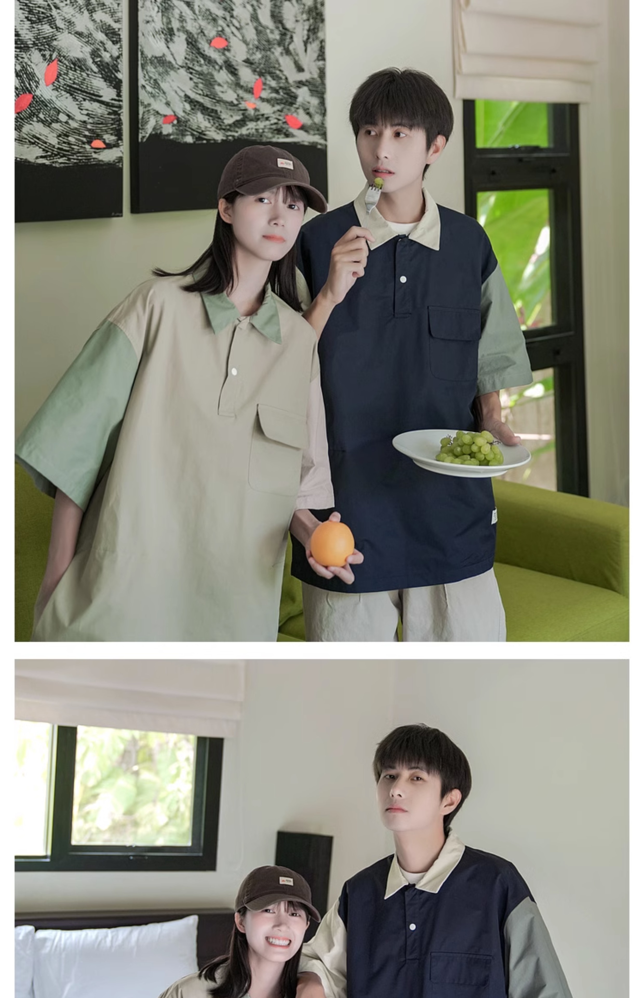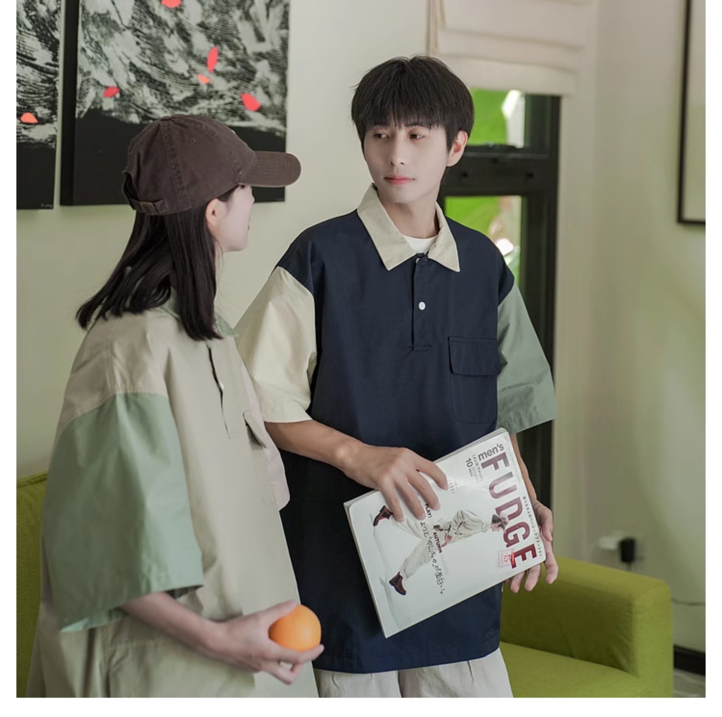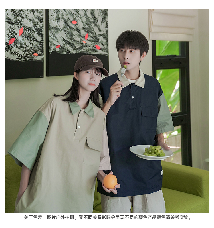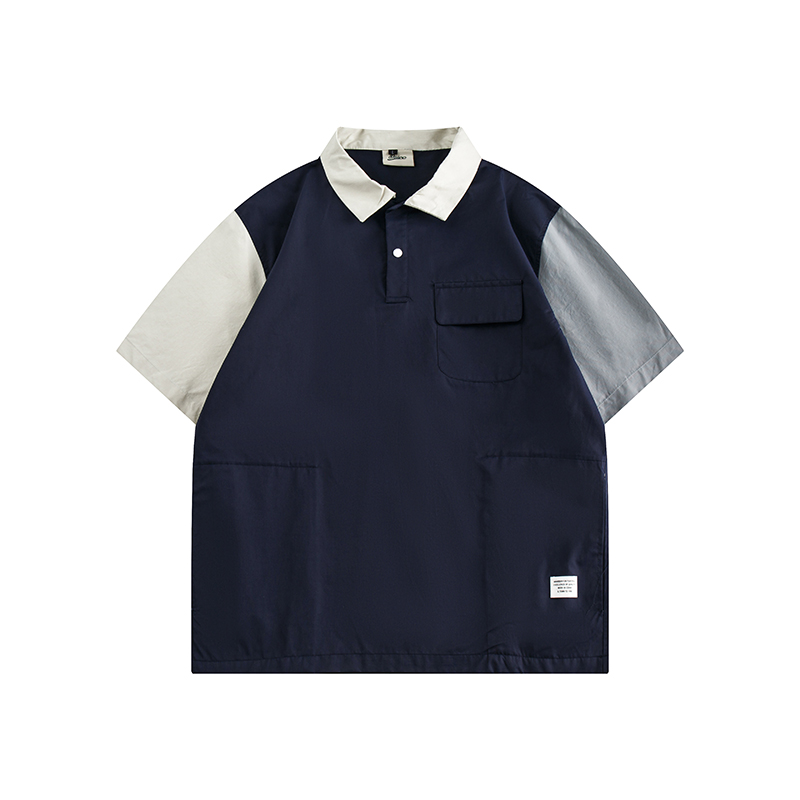 @港仔文藝男 美式拼接短袖polo衫男夏季寬鬆撞色襯衫領工裝短袖