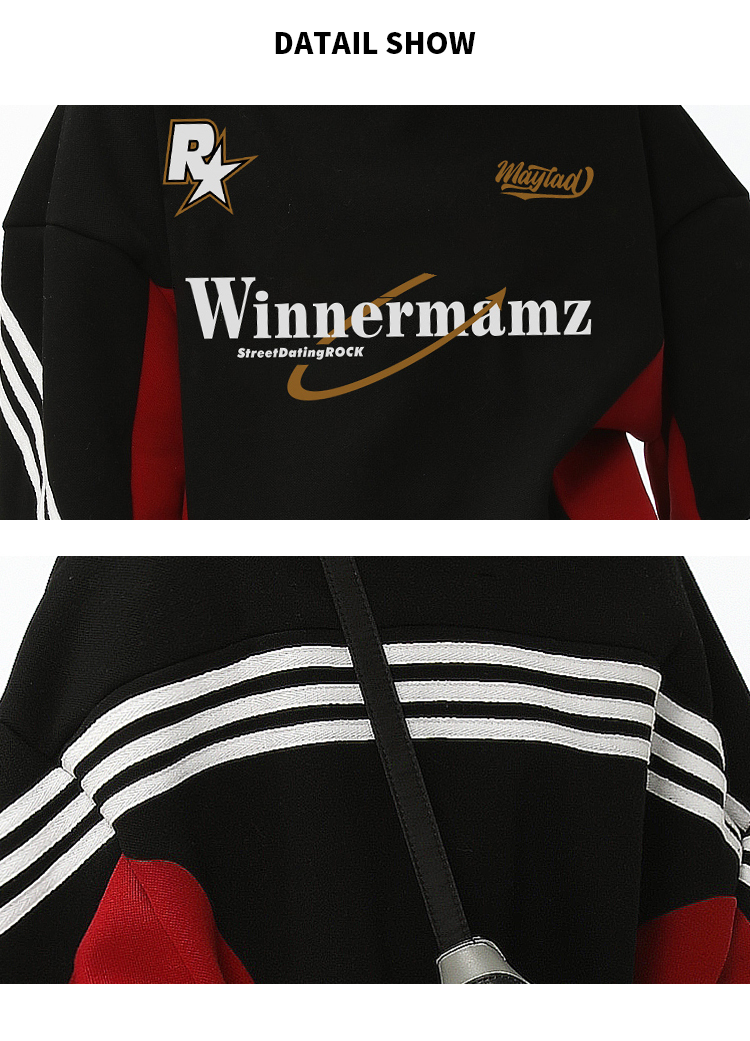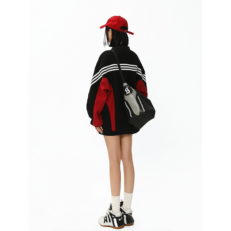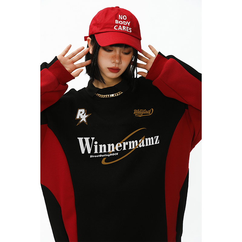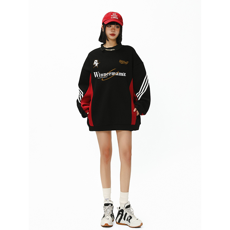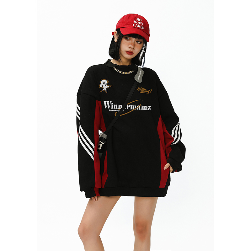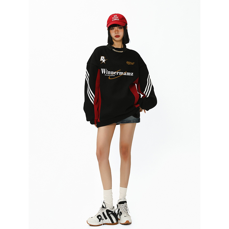 2023新款撞色插肩上衣美式復古衛衣女大尺碼寬鬆外套春秋惡女風穿搭