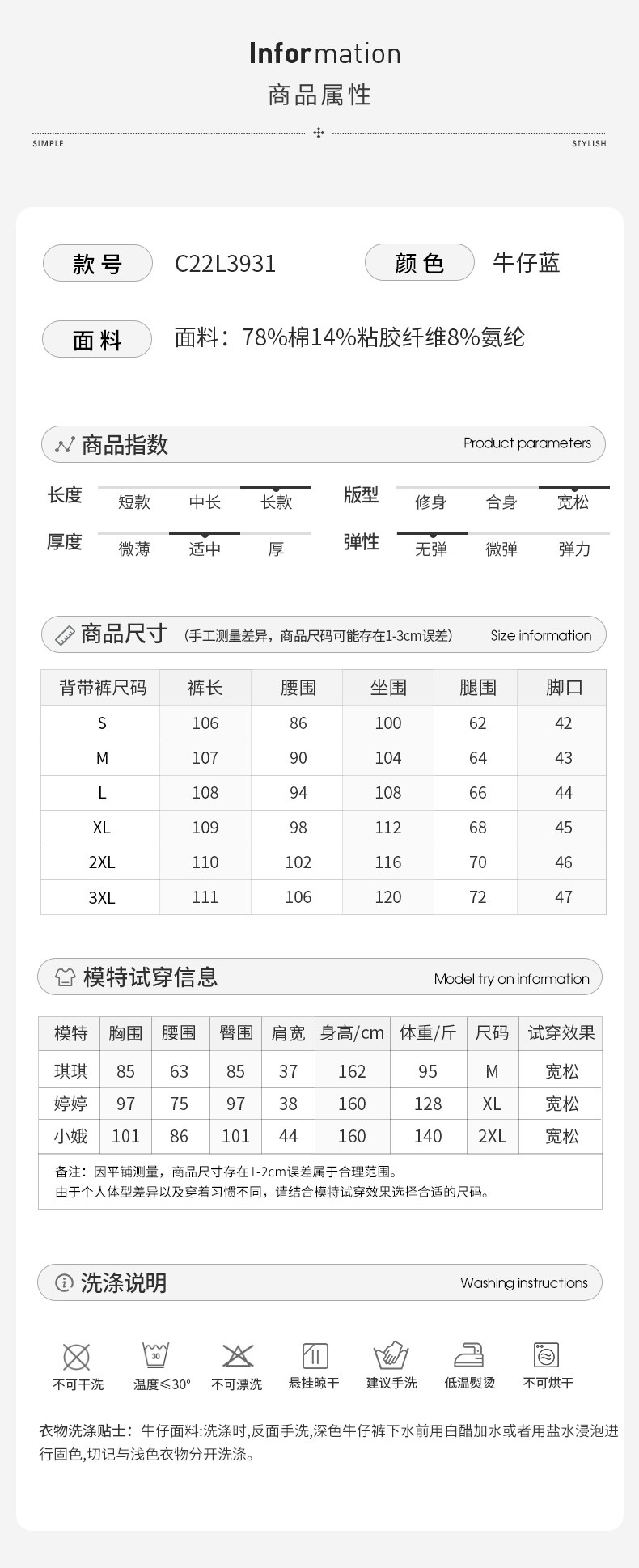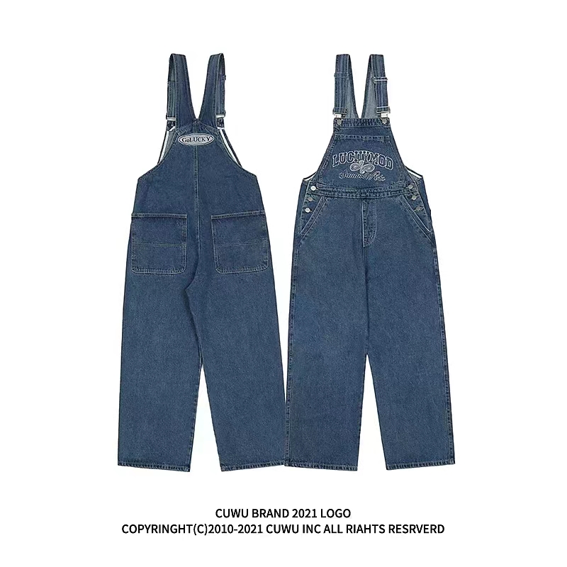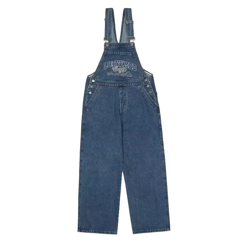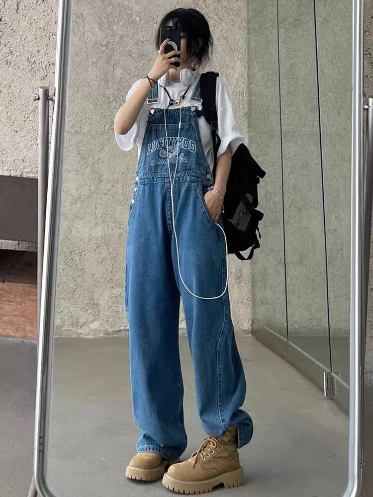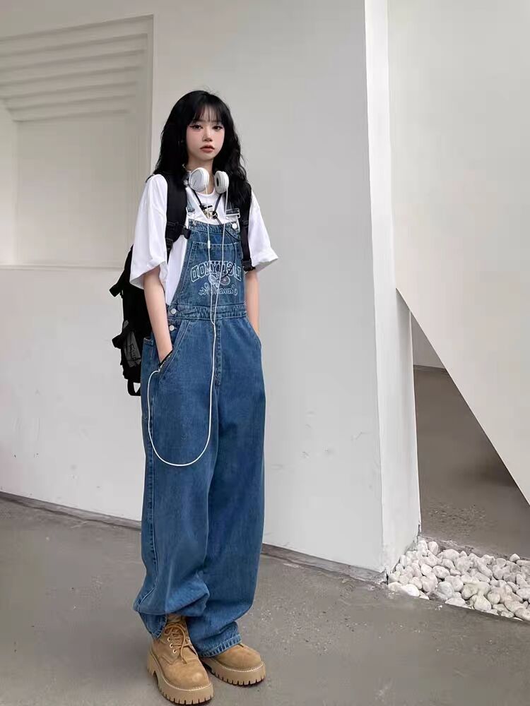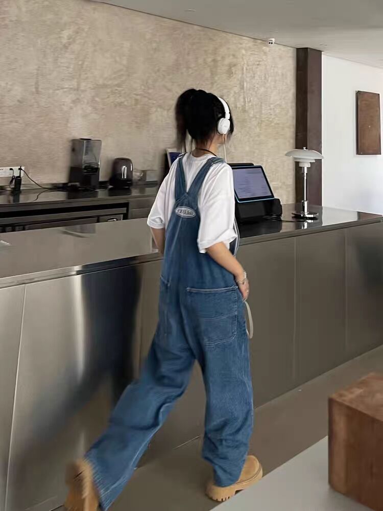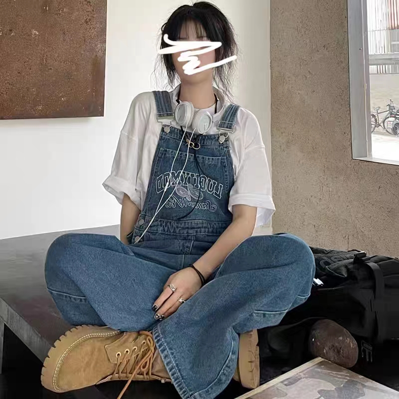 美式復古牛仔抱嬰袋褲女春季新款百搭寬鬆顯瘦直筒寬褲學生連身褲