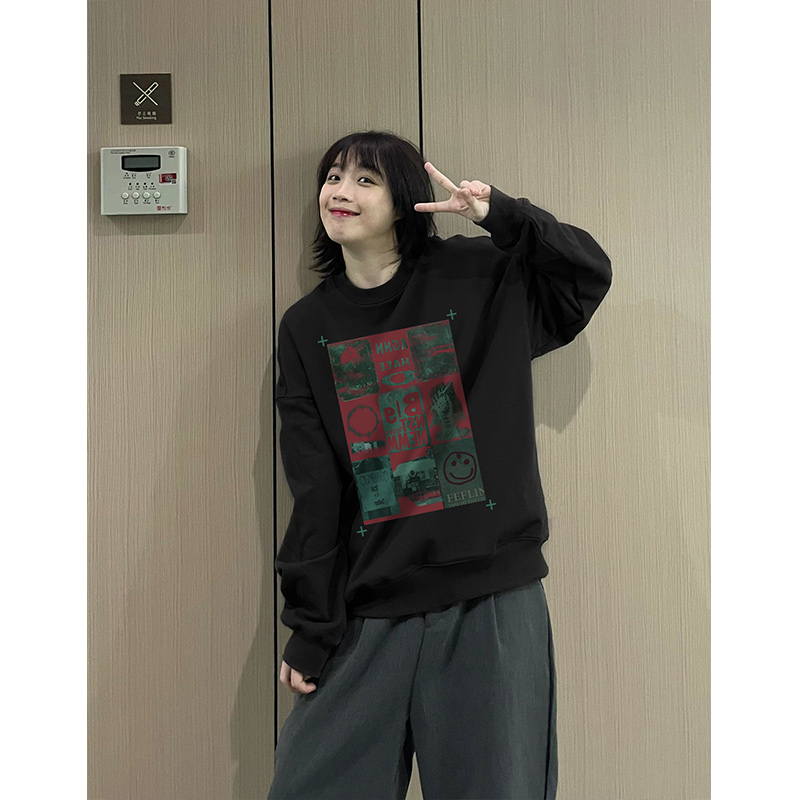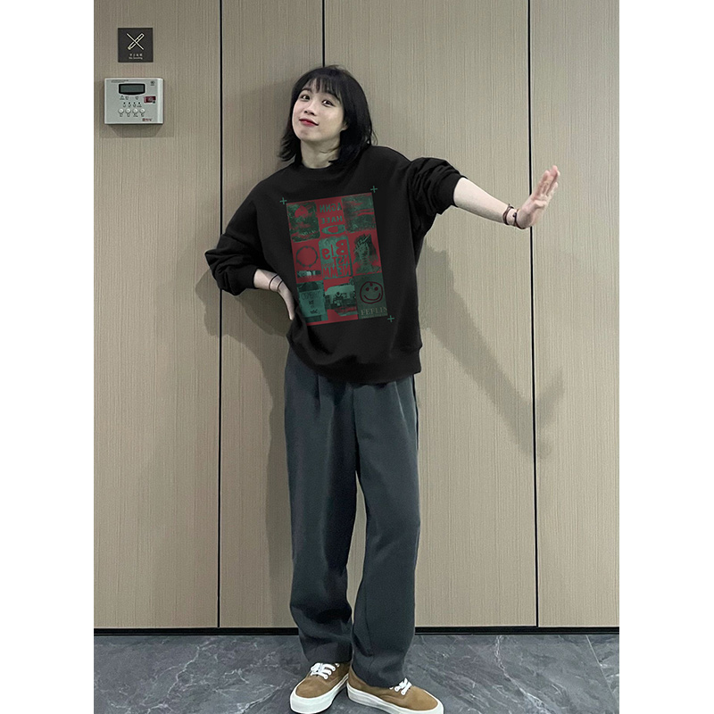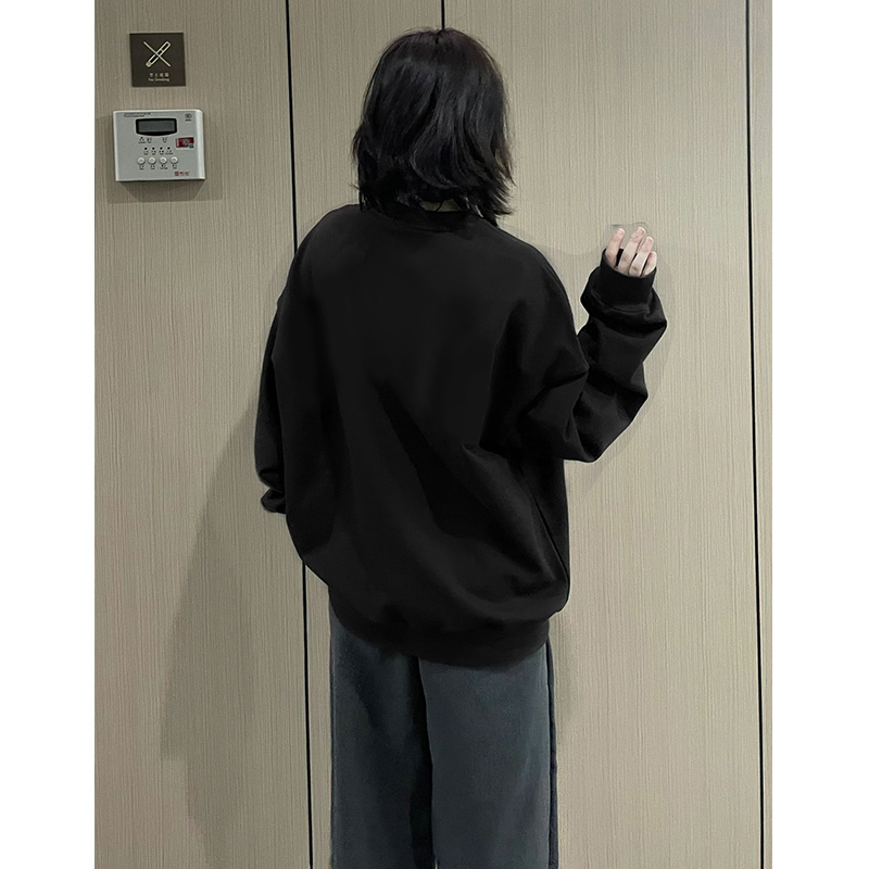 復古黑色圓領oversize衛衣女春秋2023新款加絨加厚小個子疊穿上衣