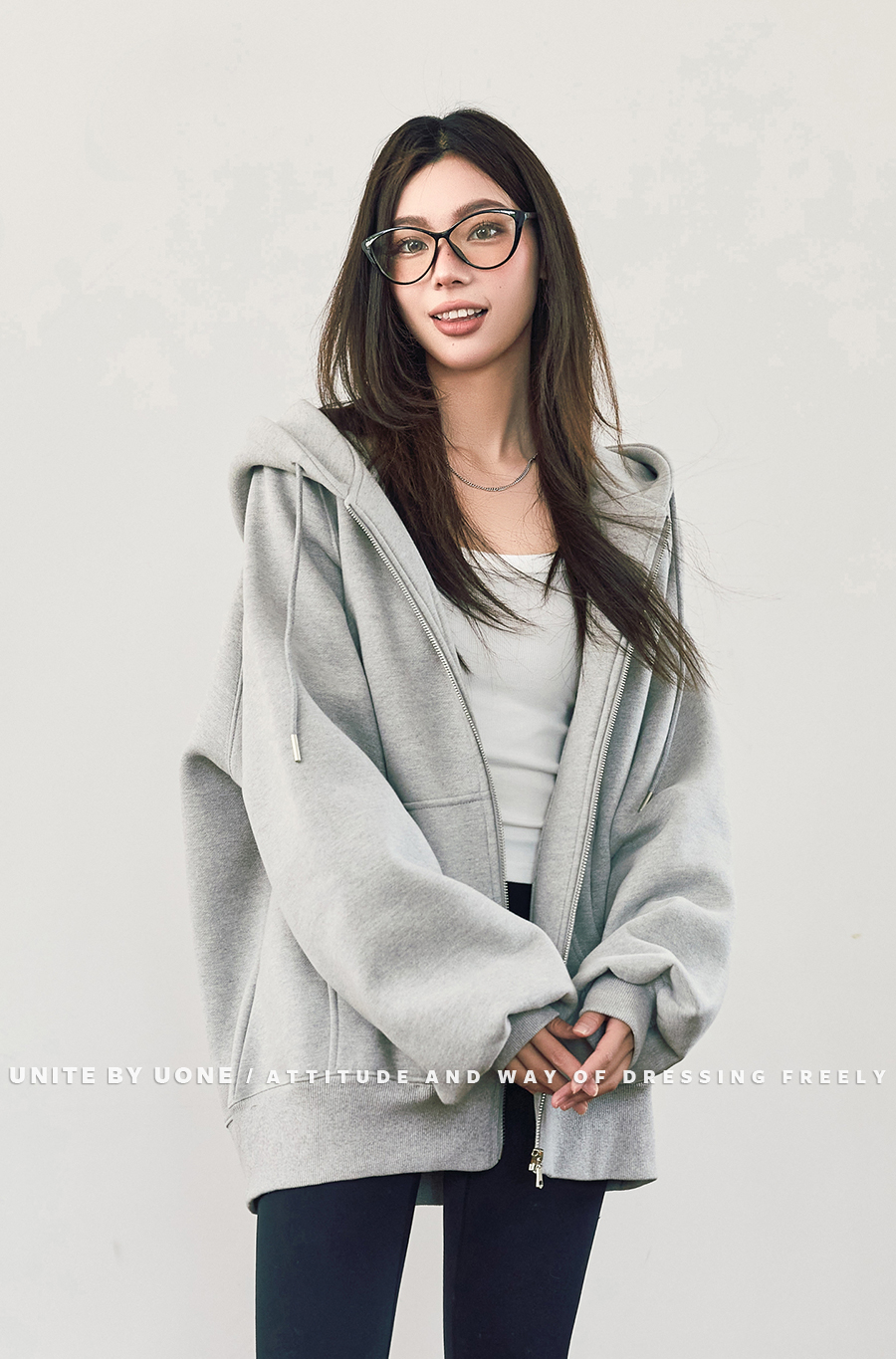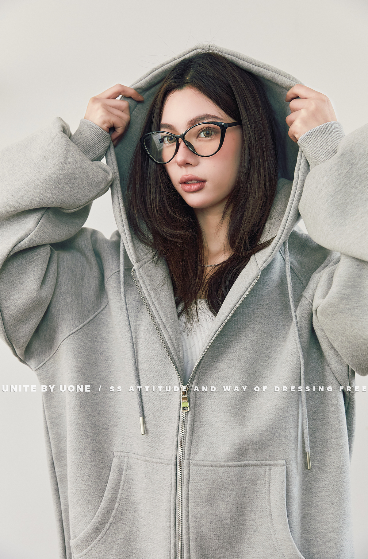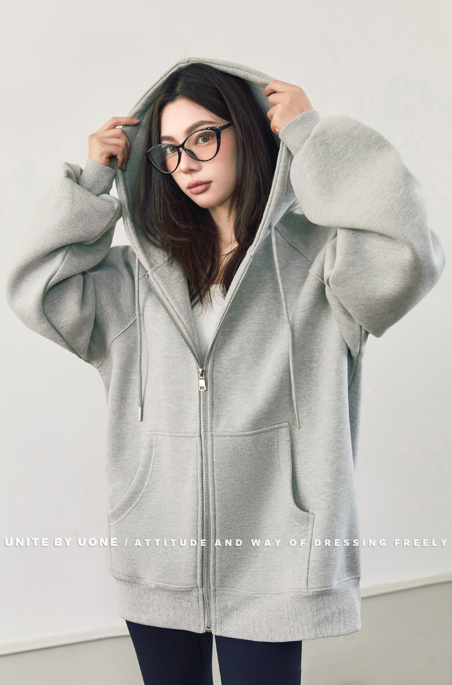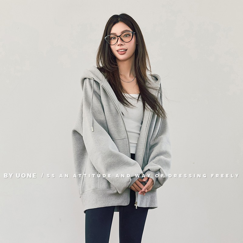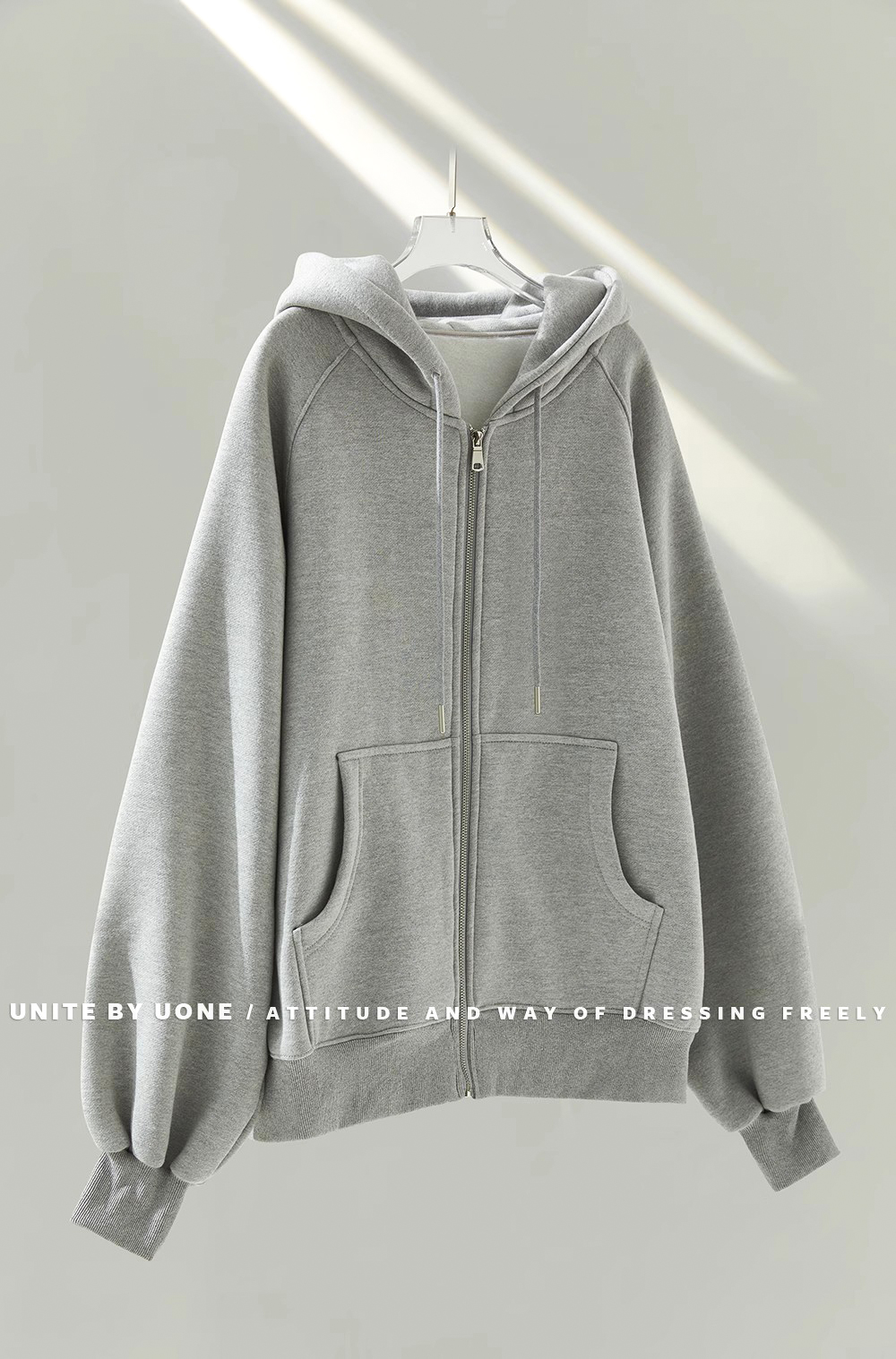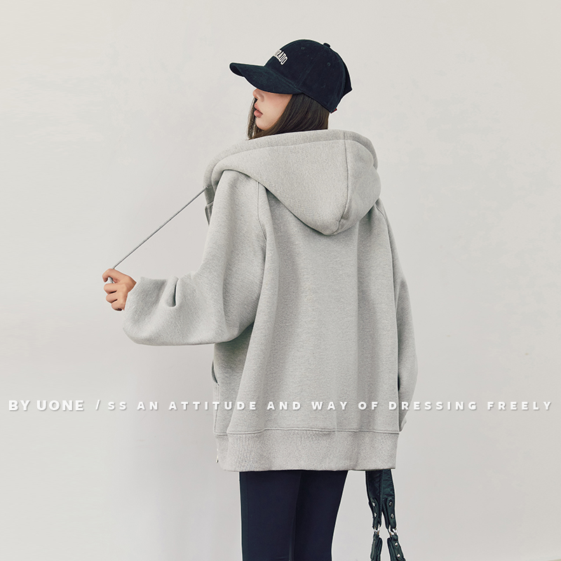 2023秋冬加絨連帽灰色開衫拉鍊衛衣女外套oversize寬鬆慵懶風上衣