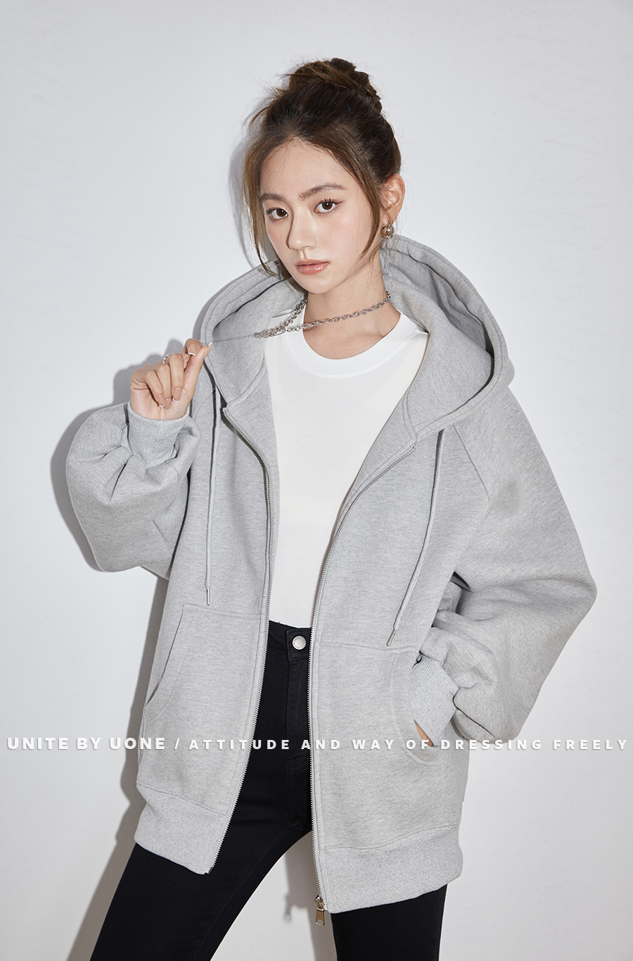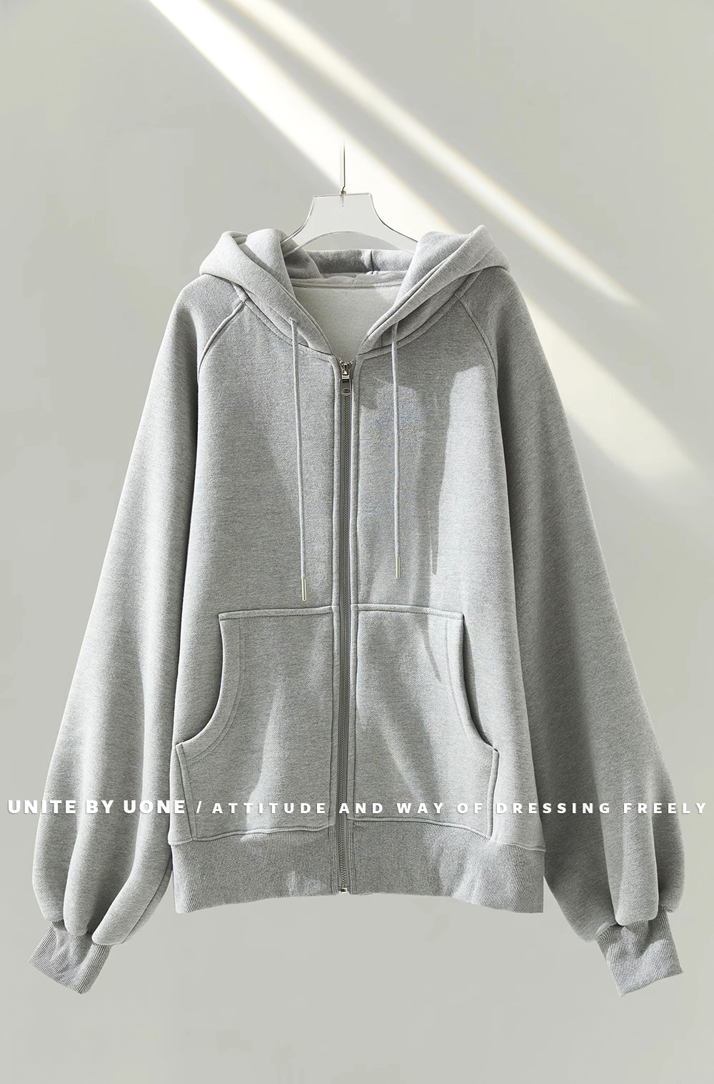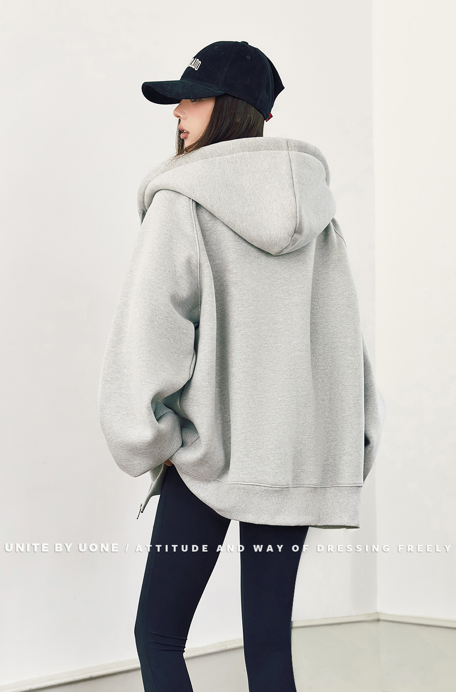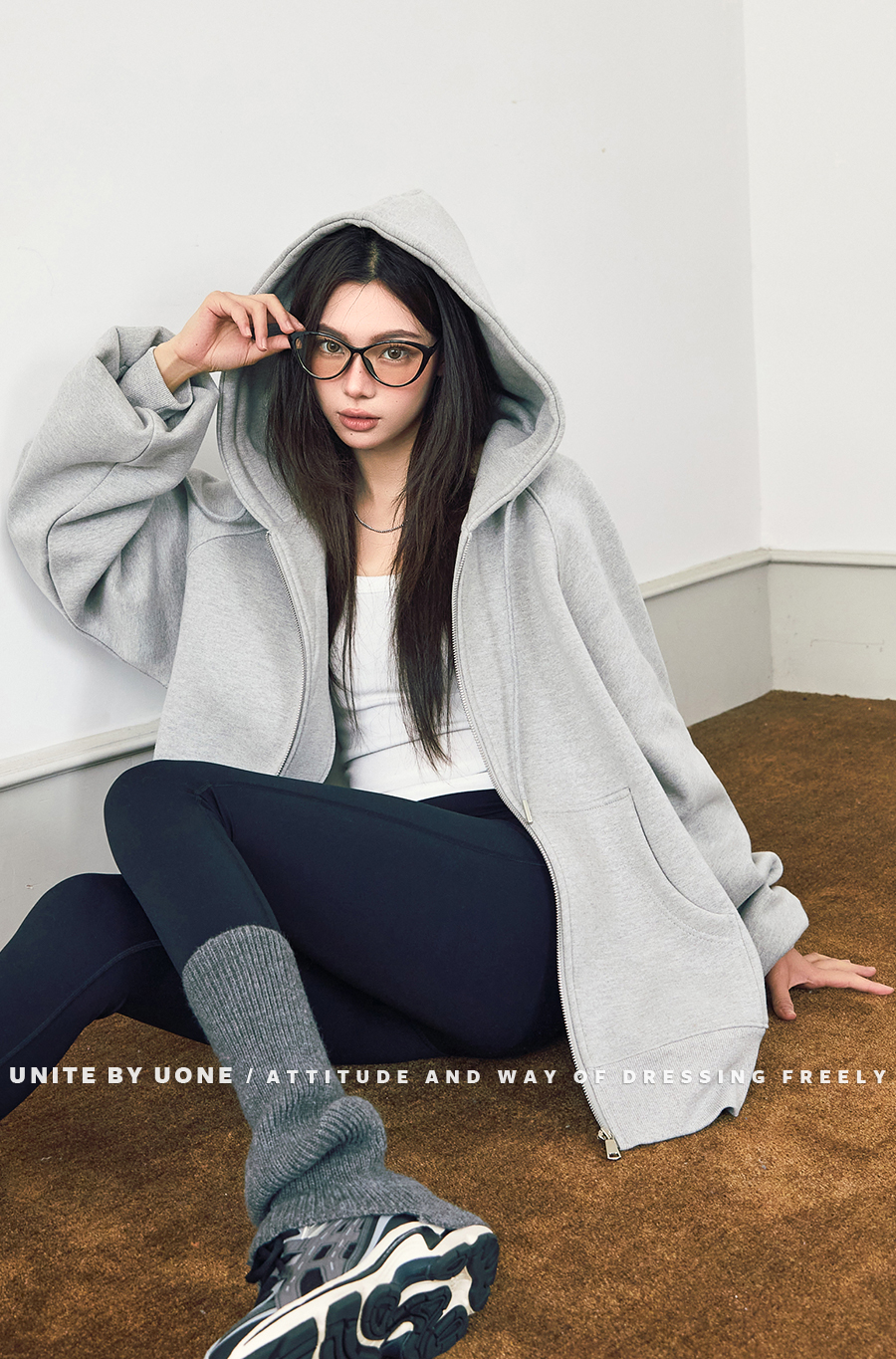 2023秋冬加絨連帽灰色開衫拉鍊衛衣女外套oversize寬鬆慵懶風上衣