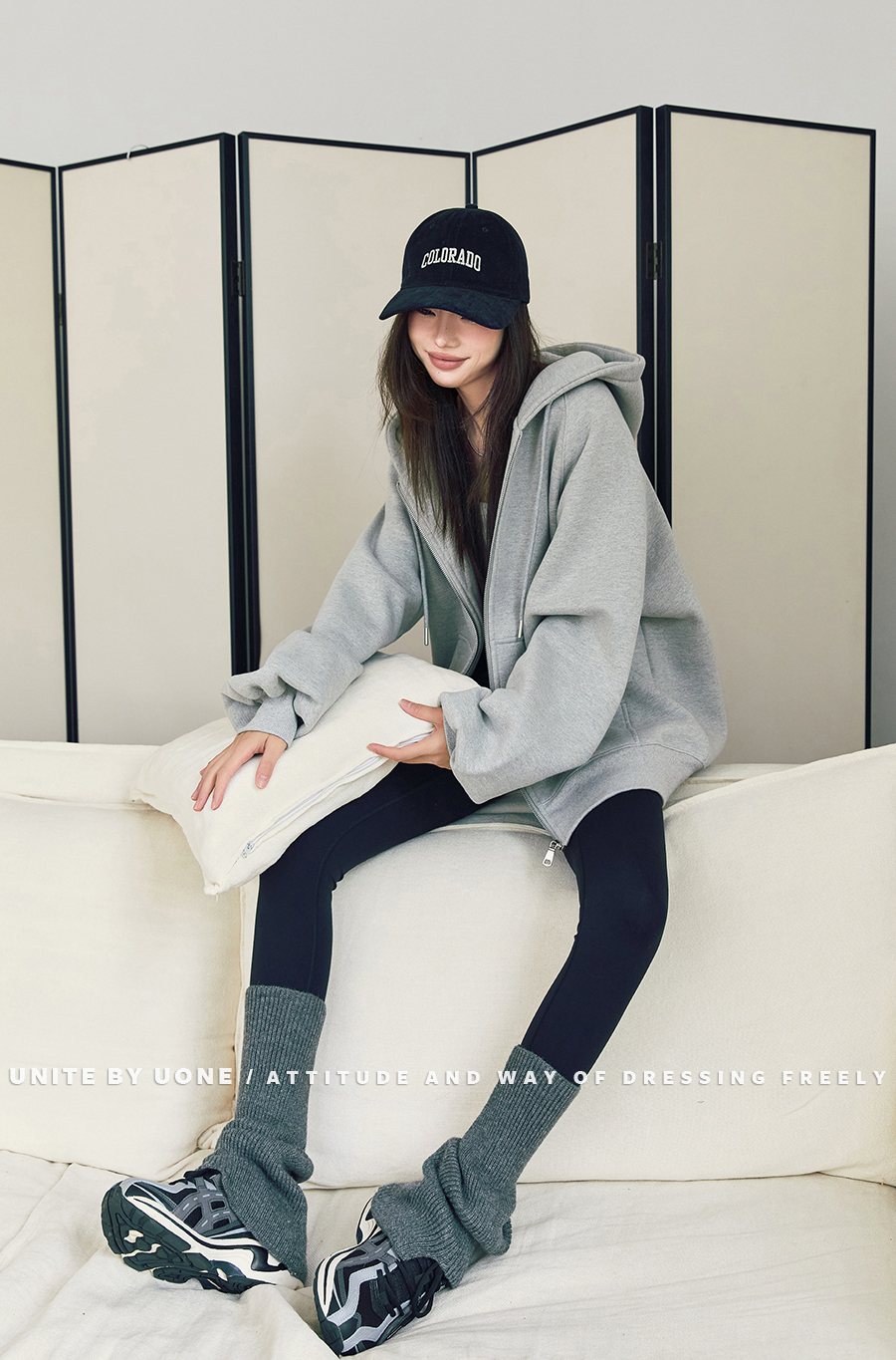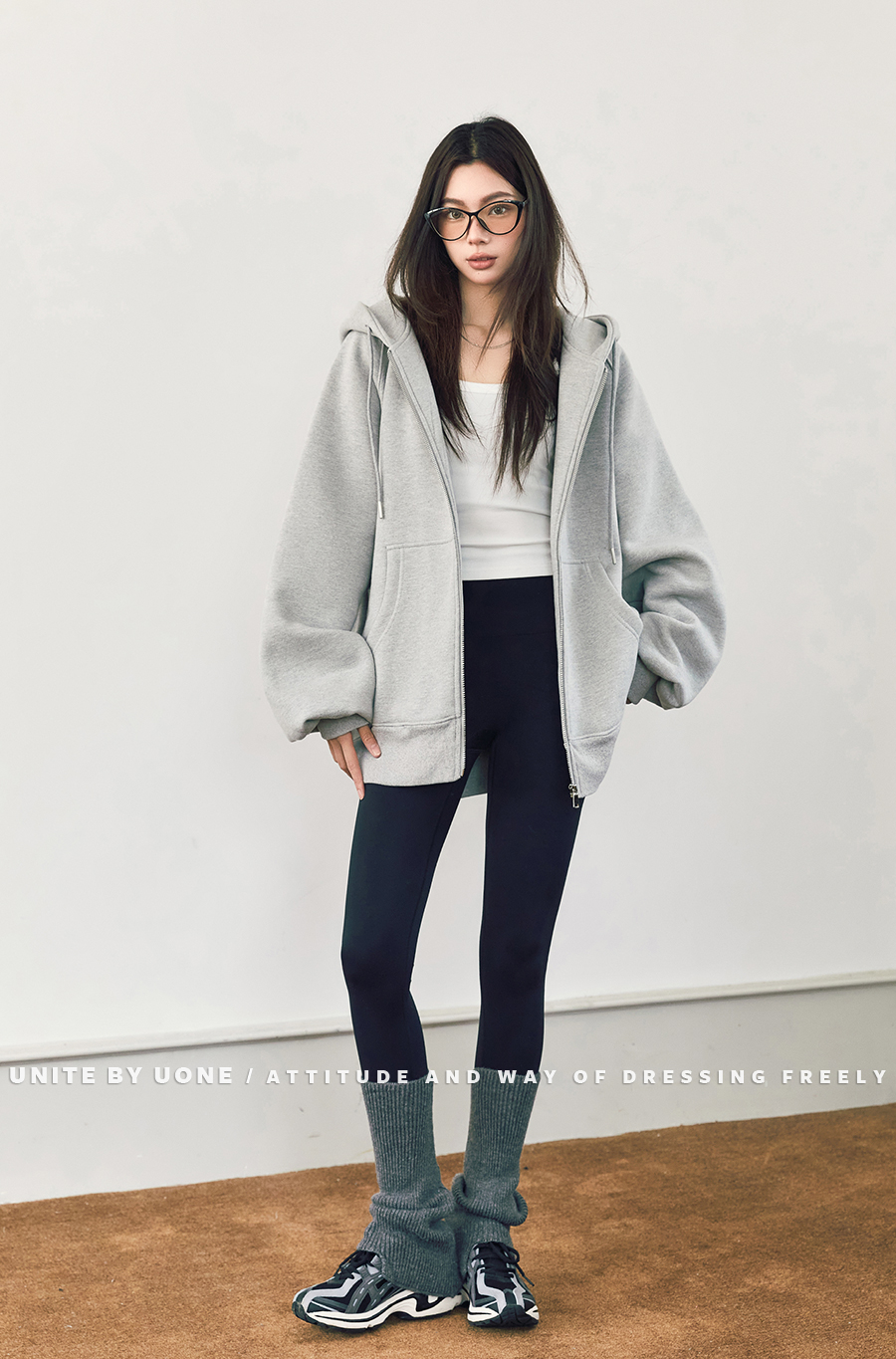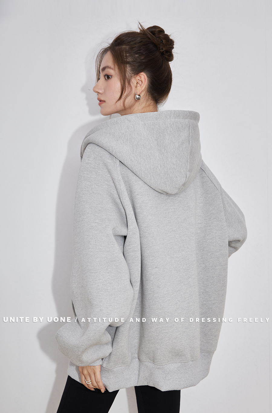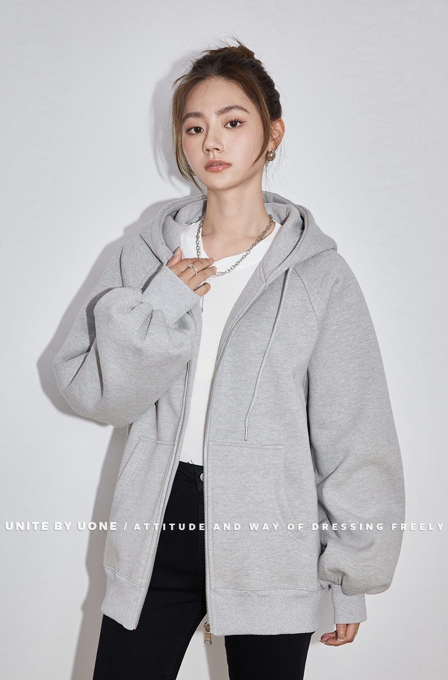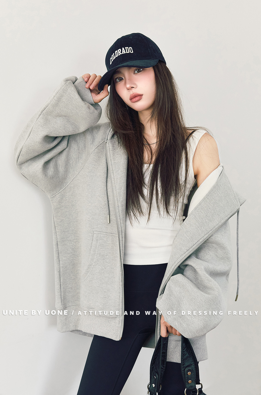 2023秋冬加絨連帽灰色開衫拉鍊衛衣女外套oversize寬鬆慵懶風上衣