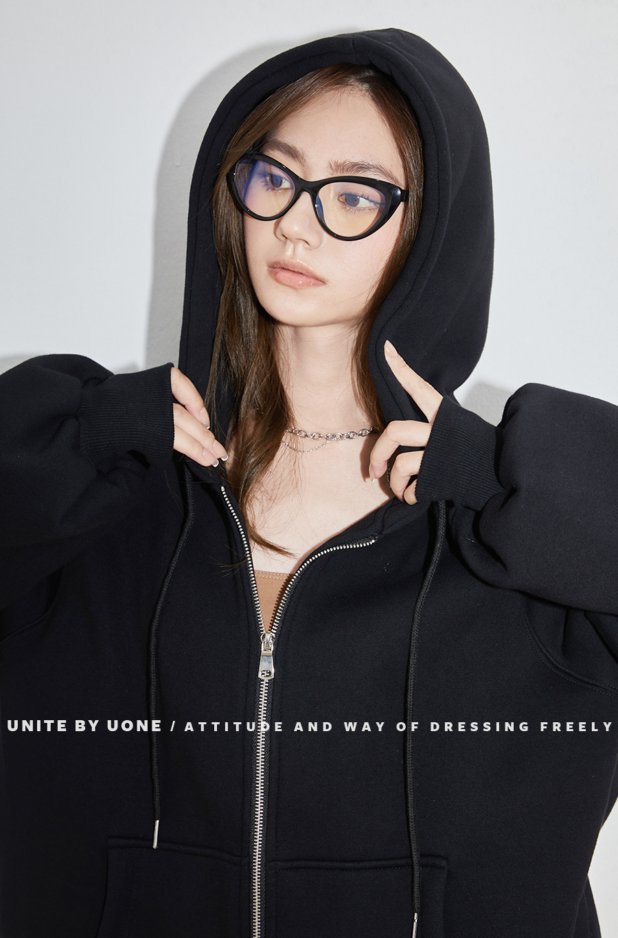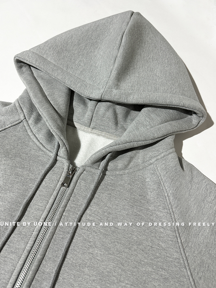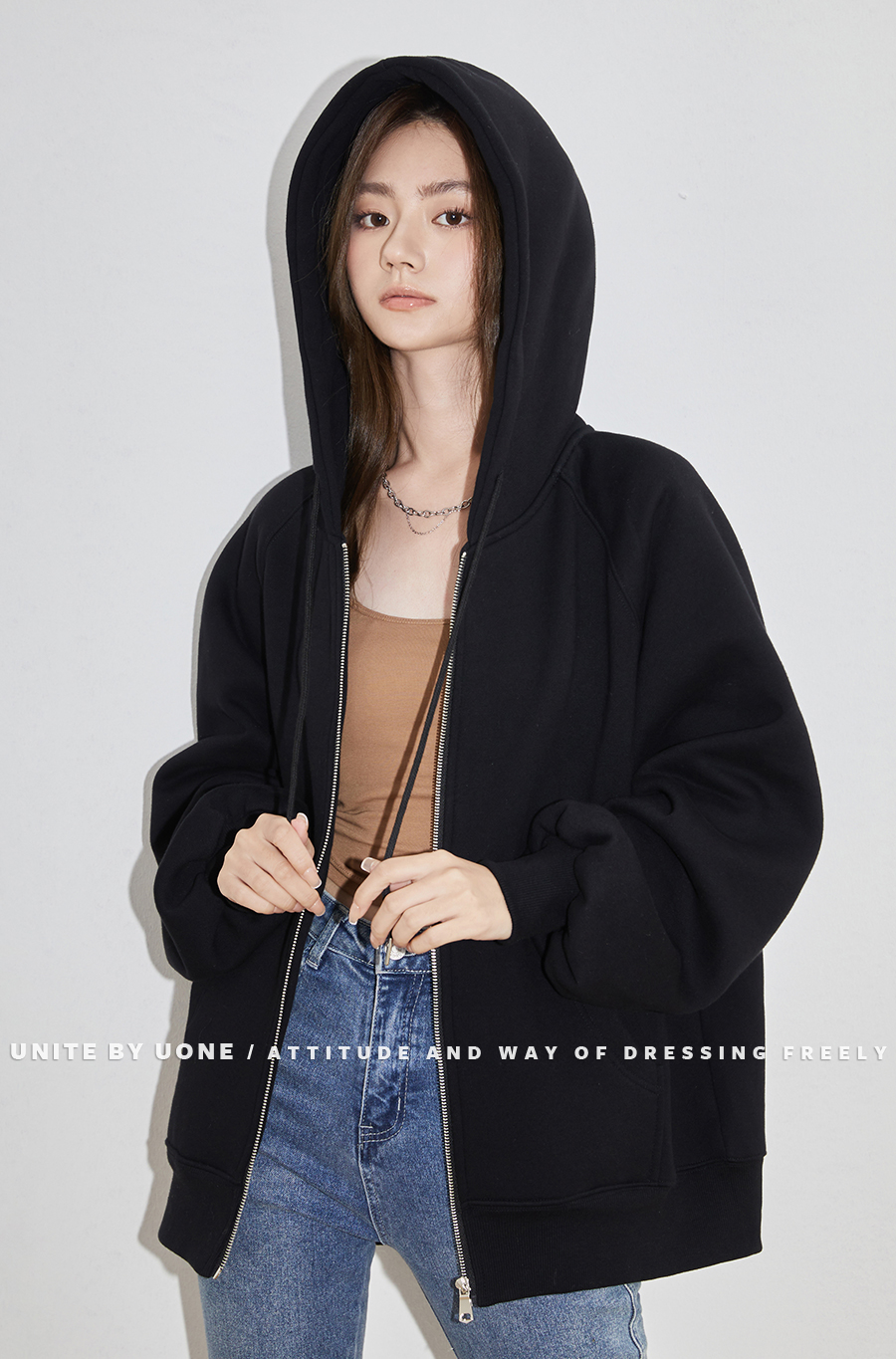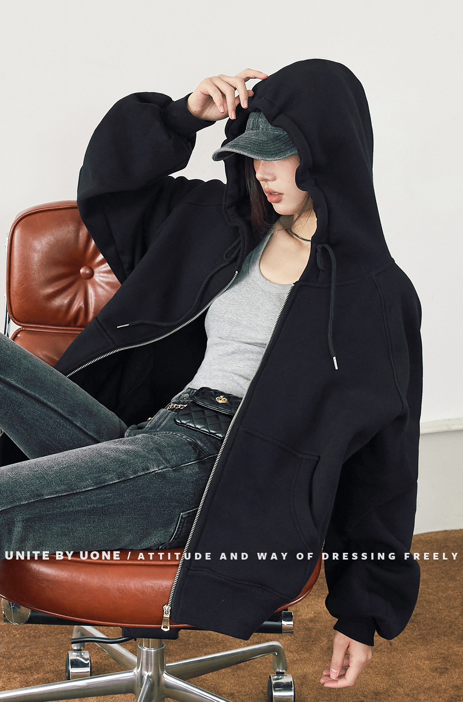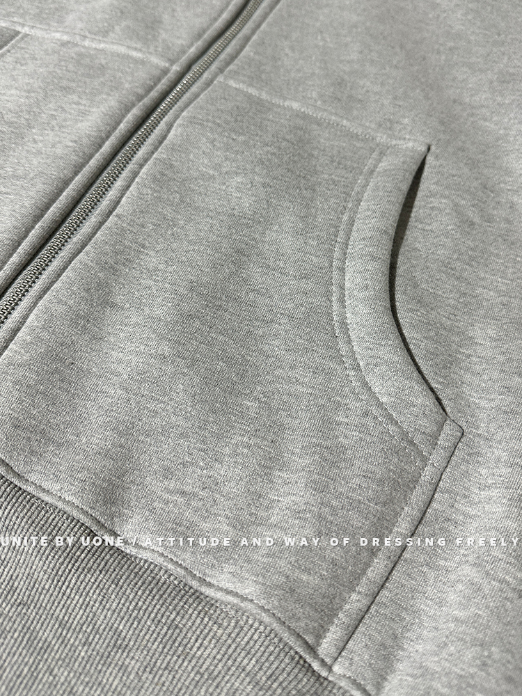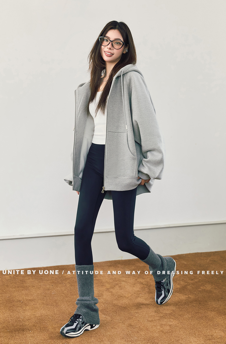2023秋冬加絨連帽灰色開衫拉鍊衛衣女外套oversize寬鬆慵懶風上衣