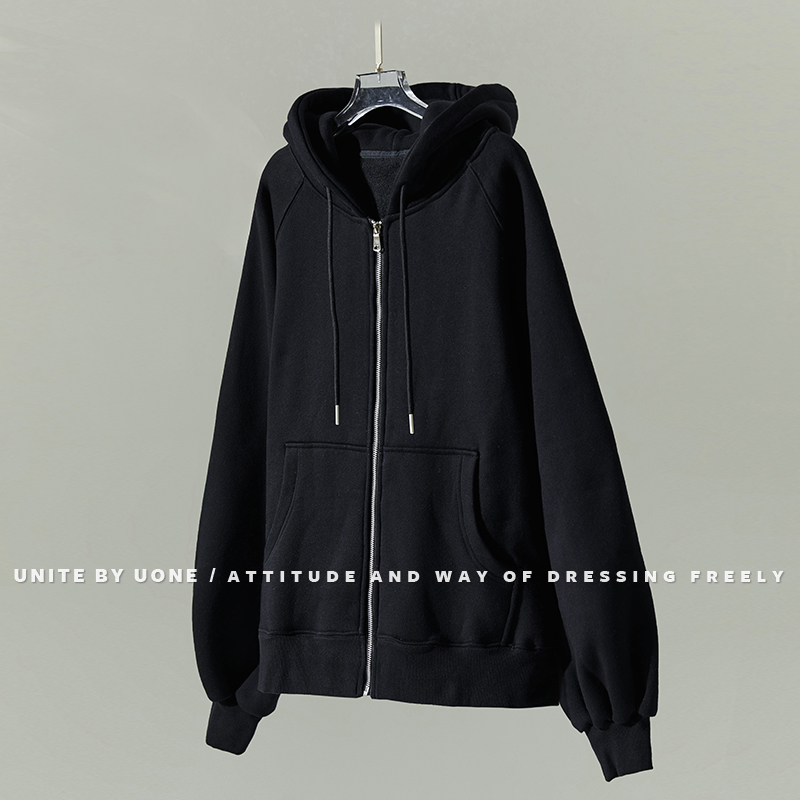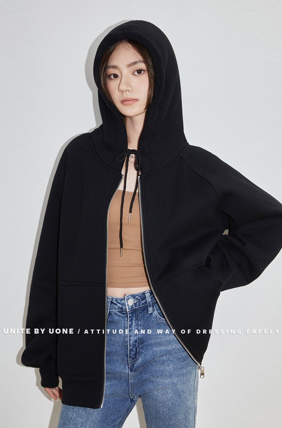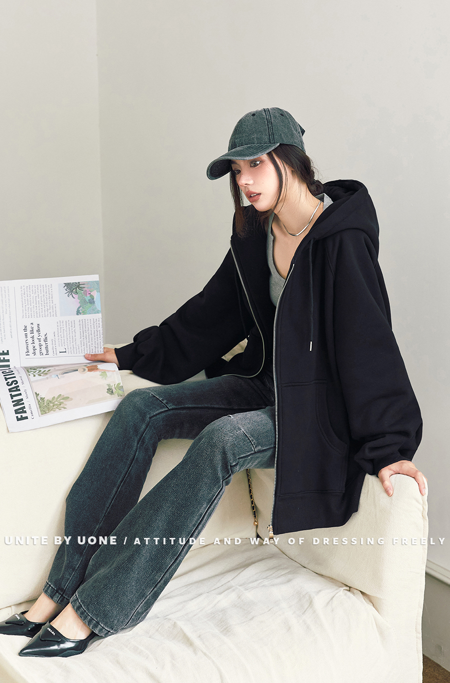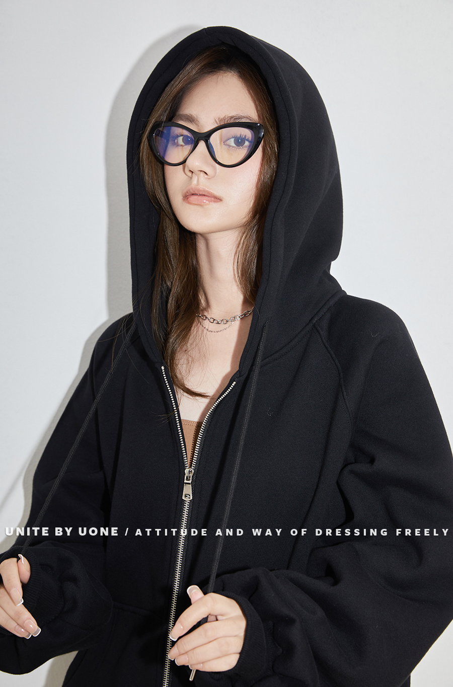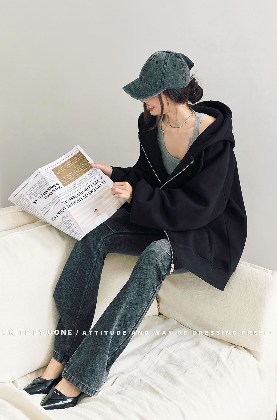 2023秋冬加絨連帽灰色開衫拉鍊衛衣女外套oversize寬鬆慵懶風上衣