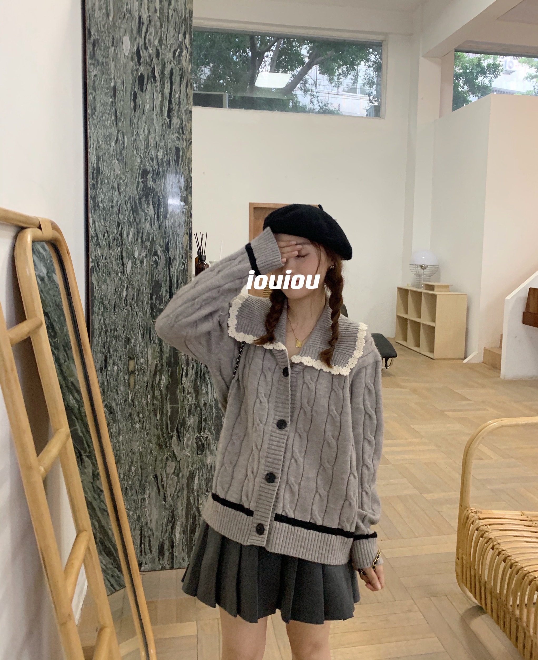 iouiou2023秋冬古著娃娃翻領甜美休閒麻花V領毛衣復古開衫外套女