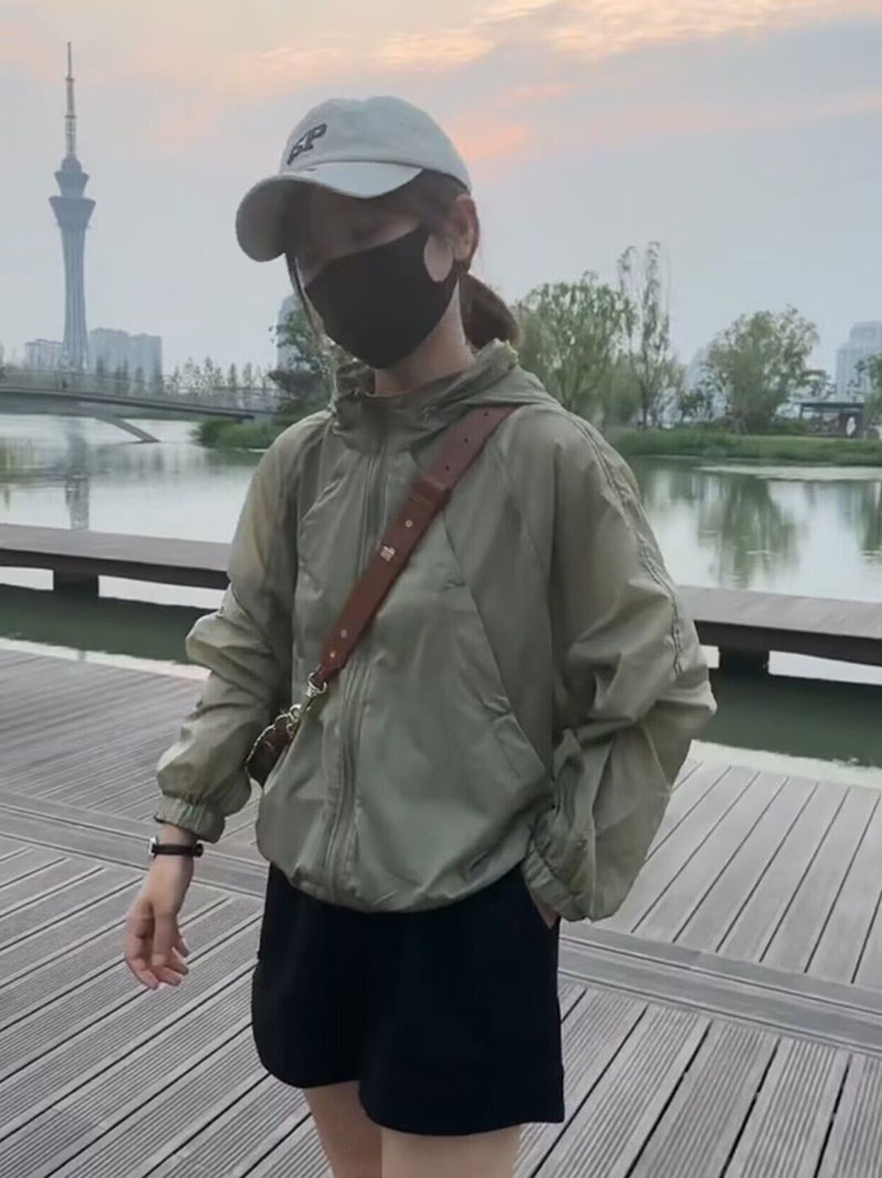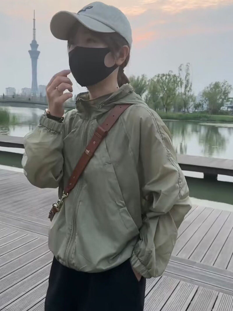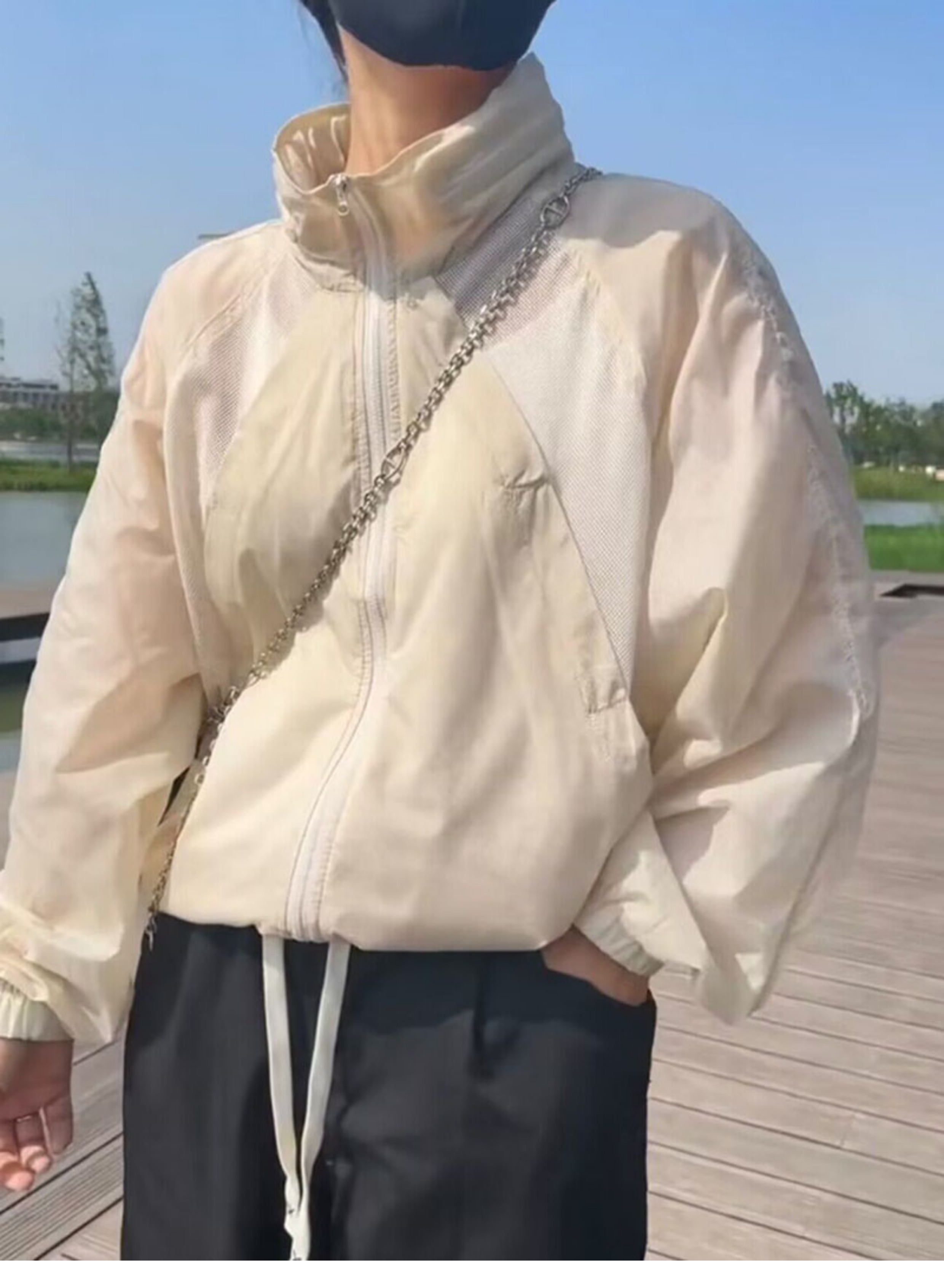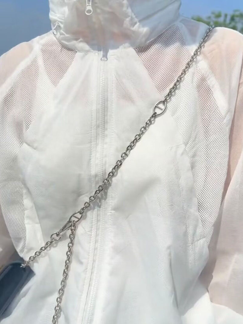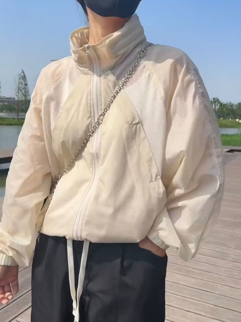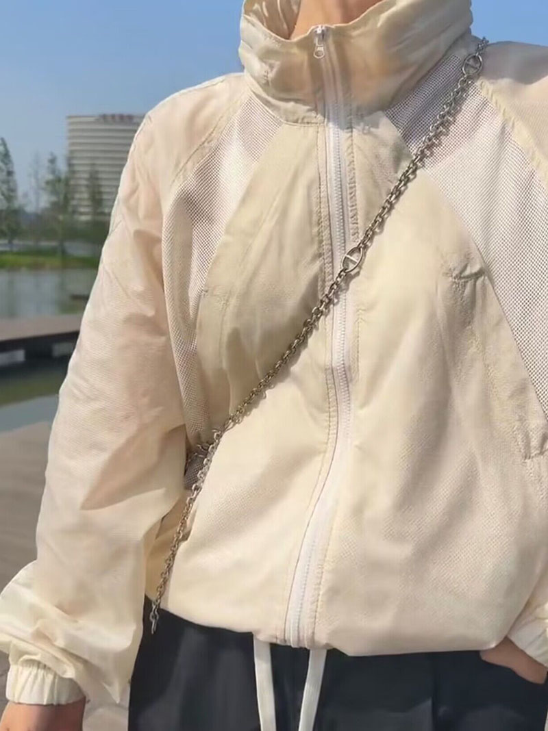 歐貨潮ins輕薄透氣立領連帽防曬衣2023夏新拼接網洞設計感外套女