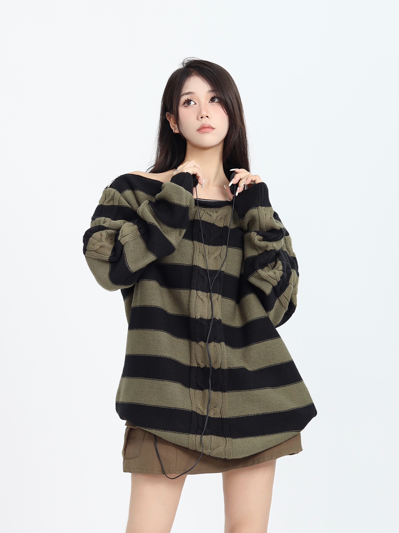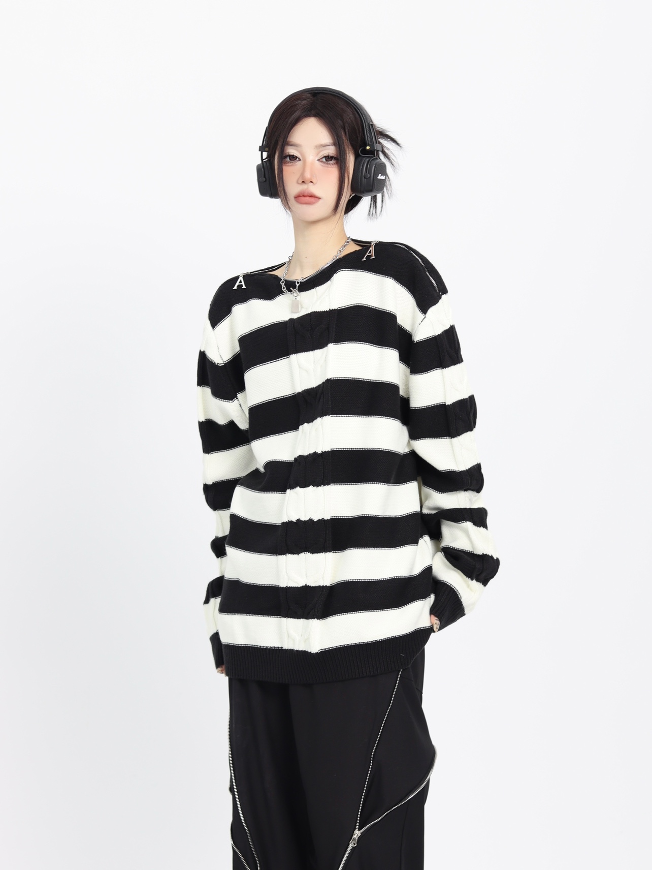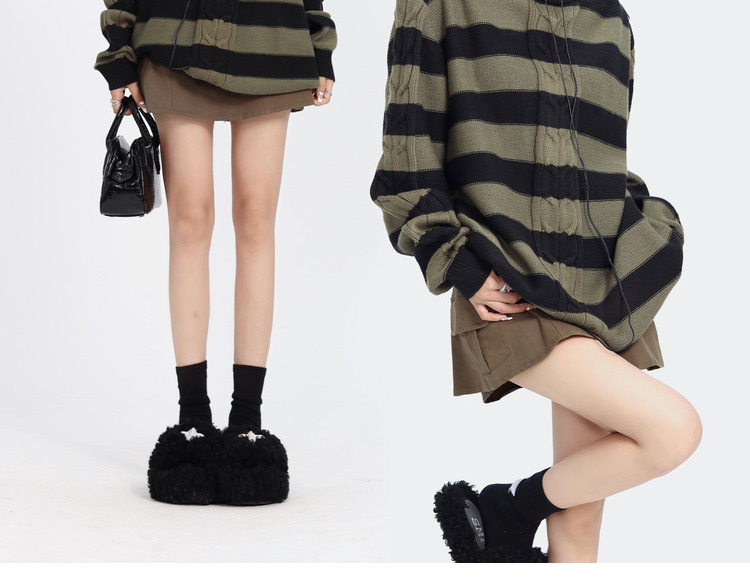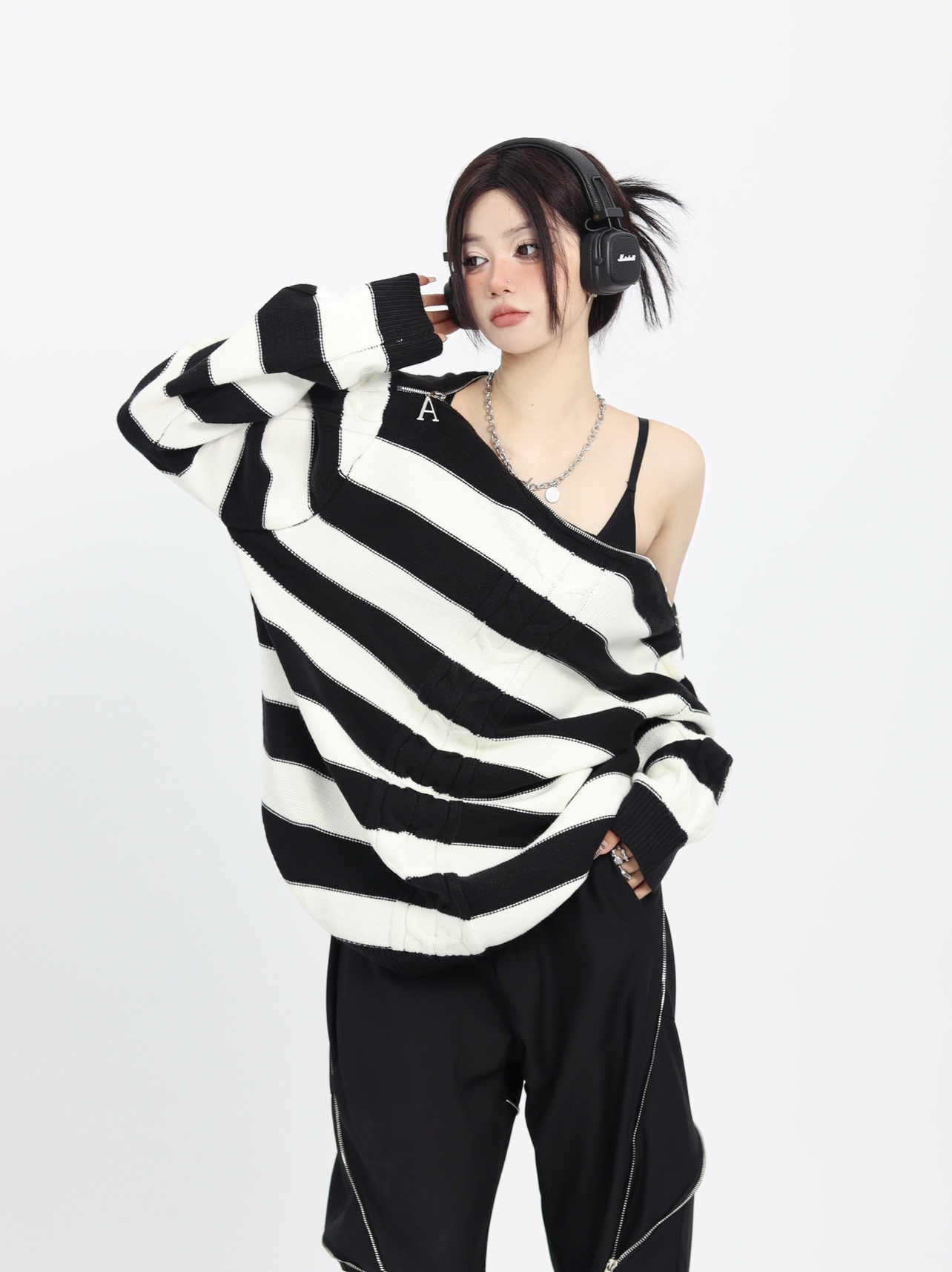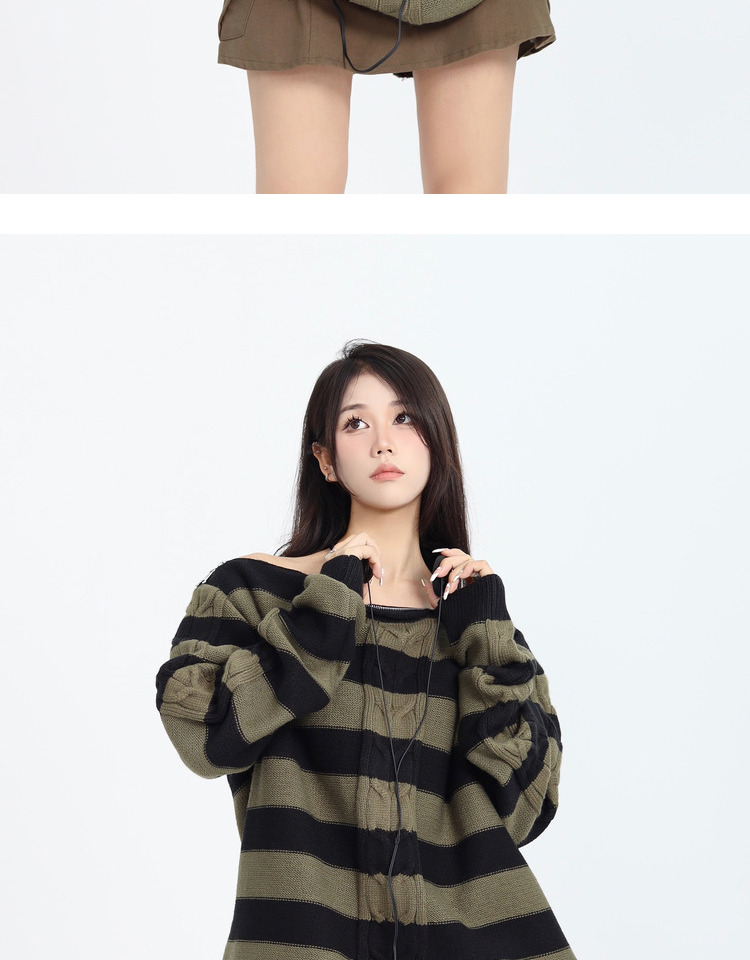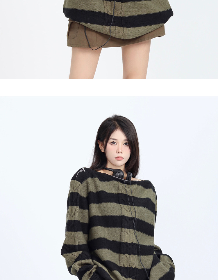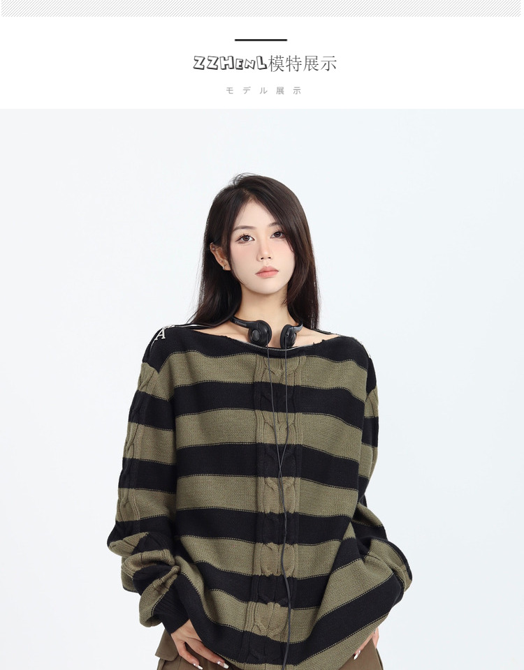 ZZHenL 復古小眾設計感領口拉鍊可露肩多穿法條紋毛衣女早秋新款