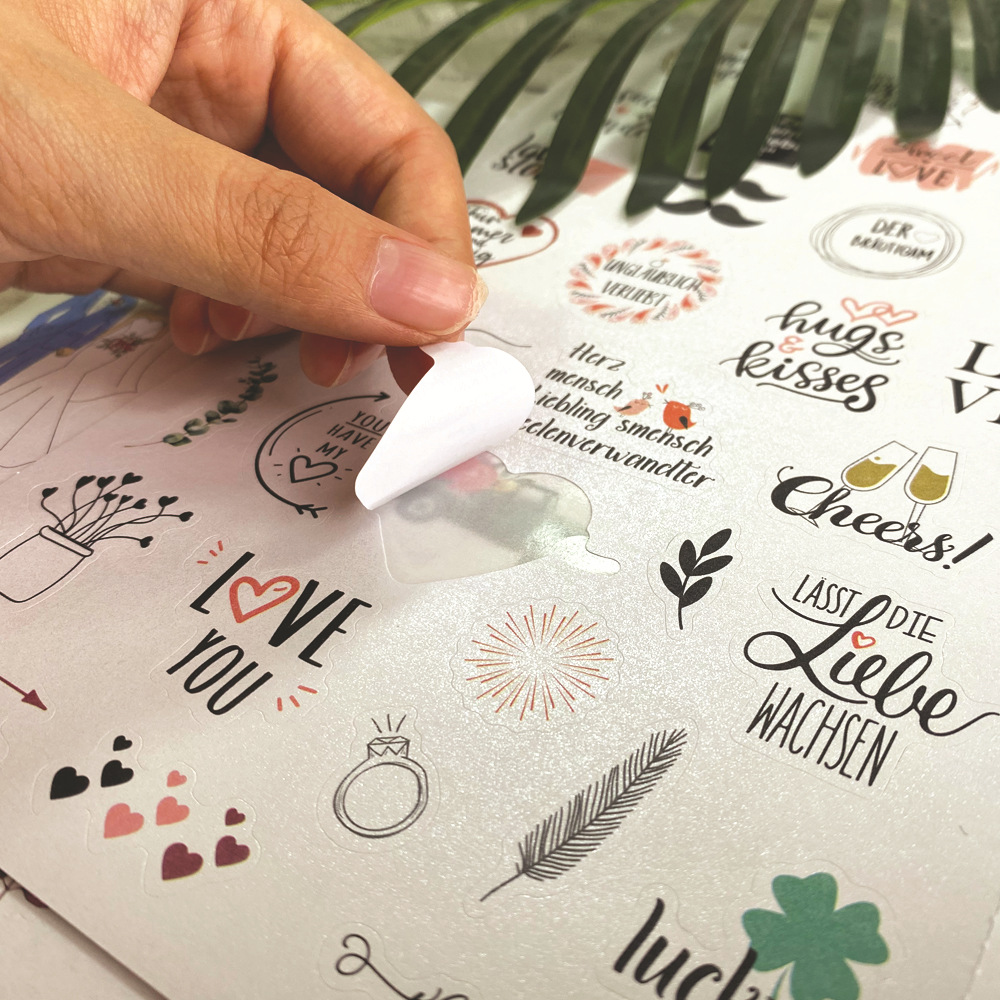 贴纸内容有德语 英文2种语言,包含了爱心、LOVE 、桉树叶、