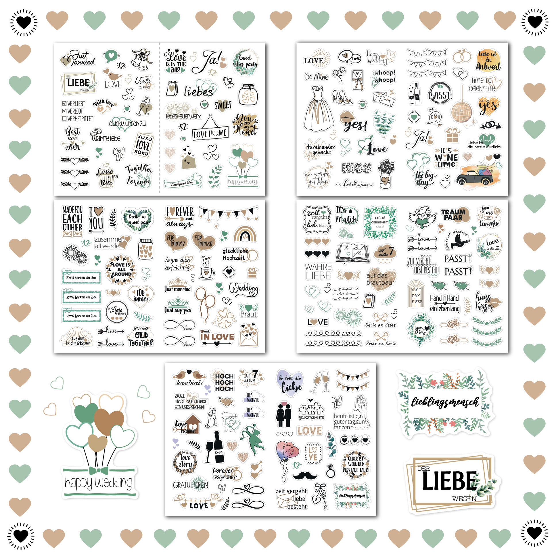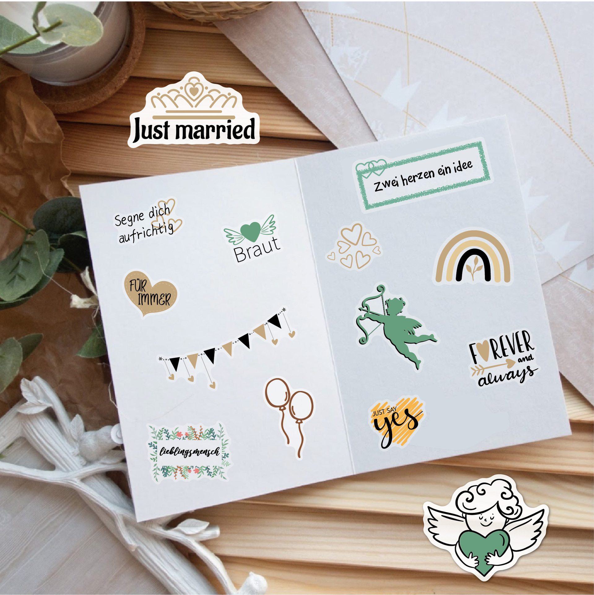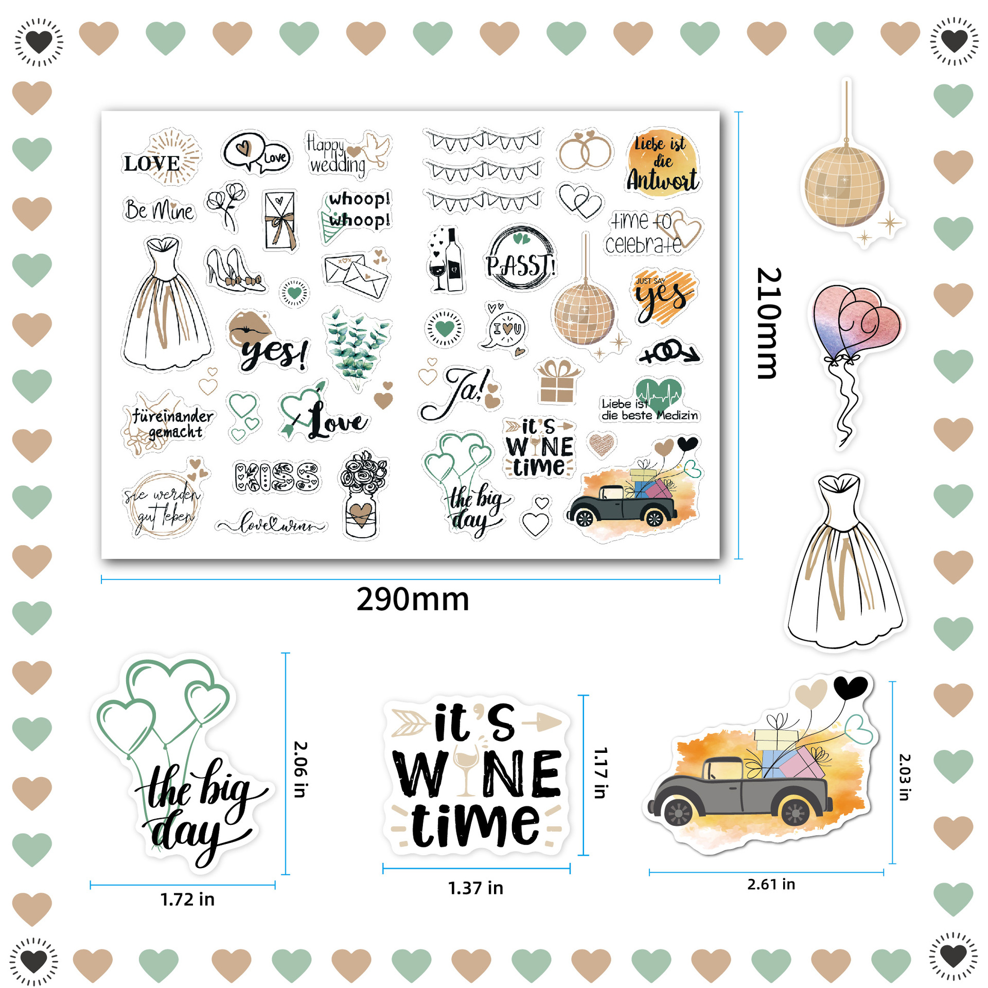 贴纸内容有德语 英文2种语言,包含了JA! 、爱心气球、桉树叶、