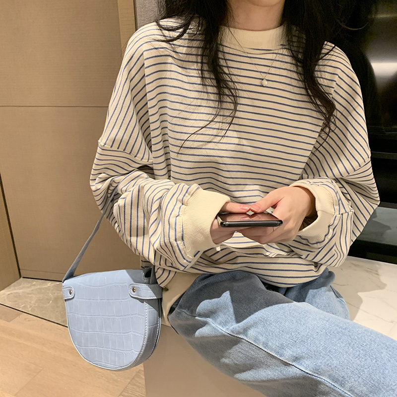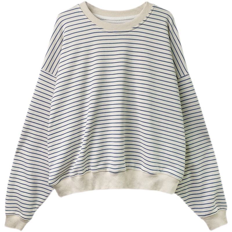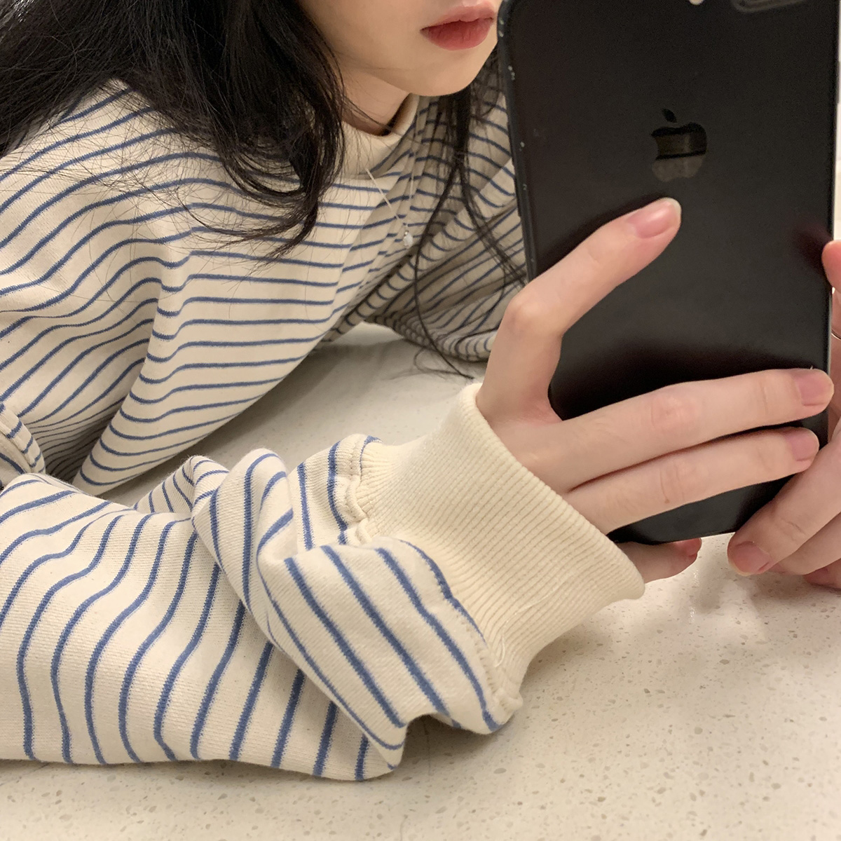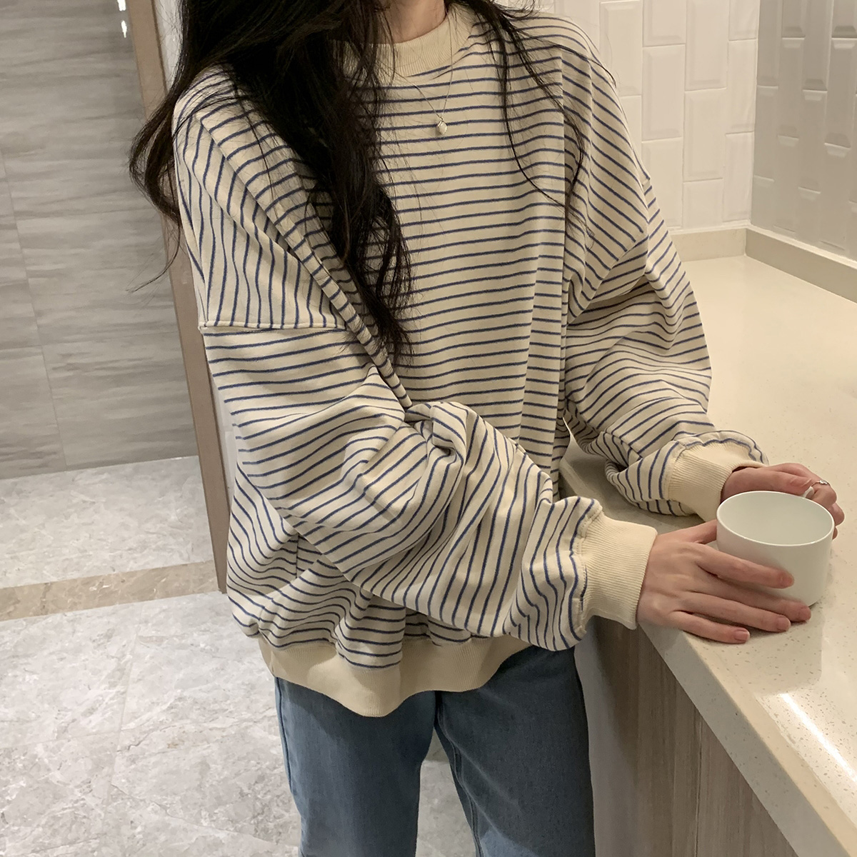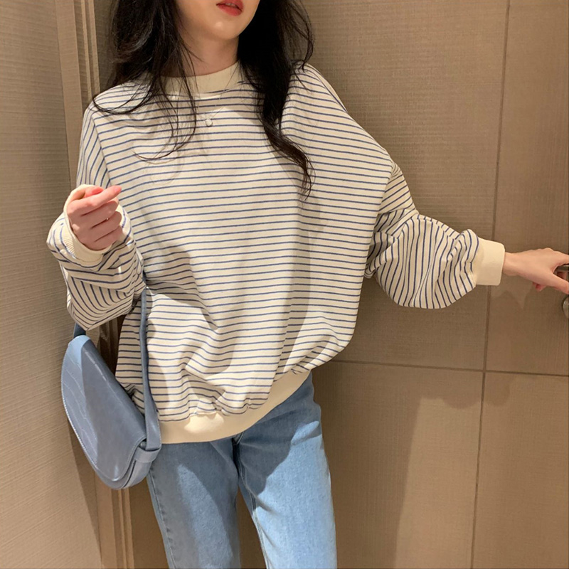 M2023年新款套頭條紋休閒上衣女秋季寬鬆韓版慵懶風圓領長袖潮ins上衣