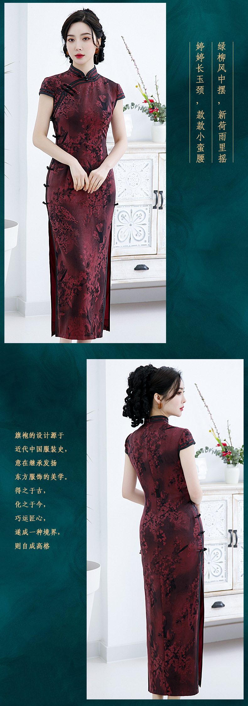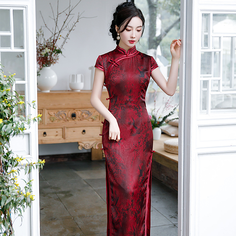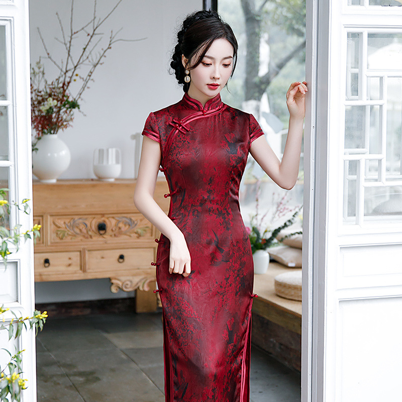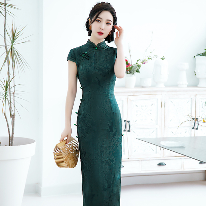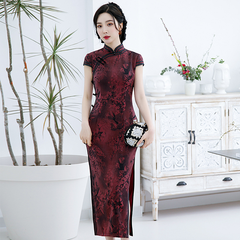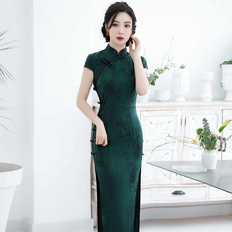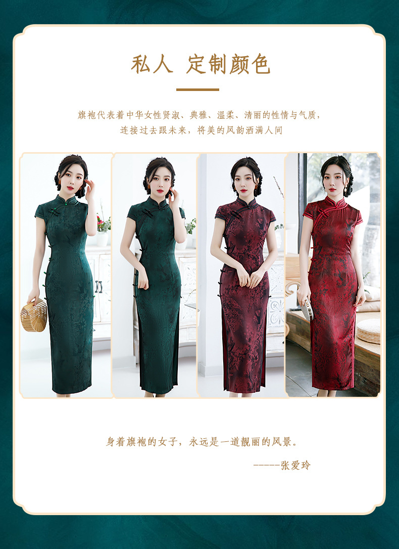 2021新款时尚女士年轻长款旗袍短袖收腰包臀斜襟立领改良版C1040