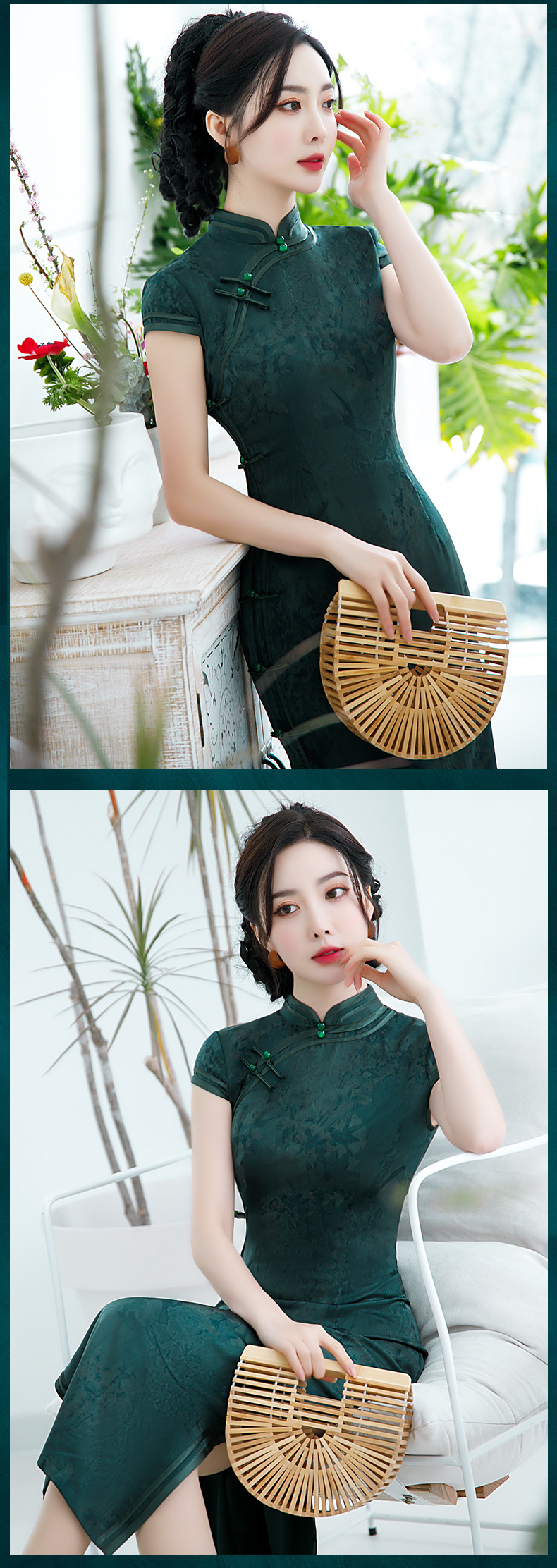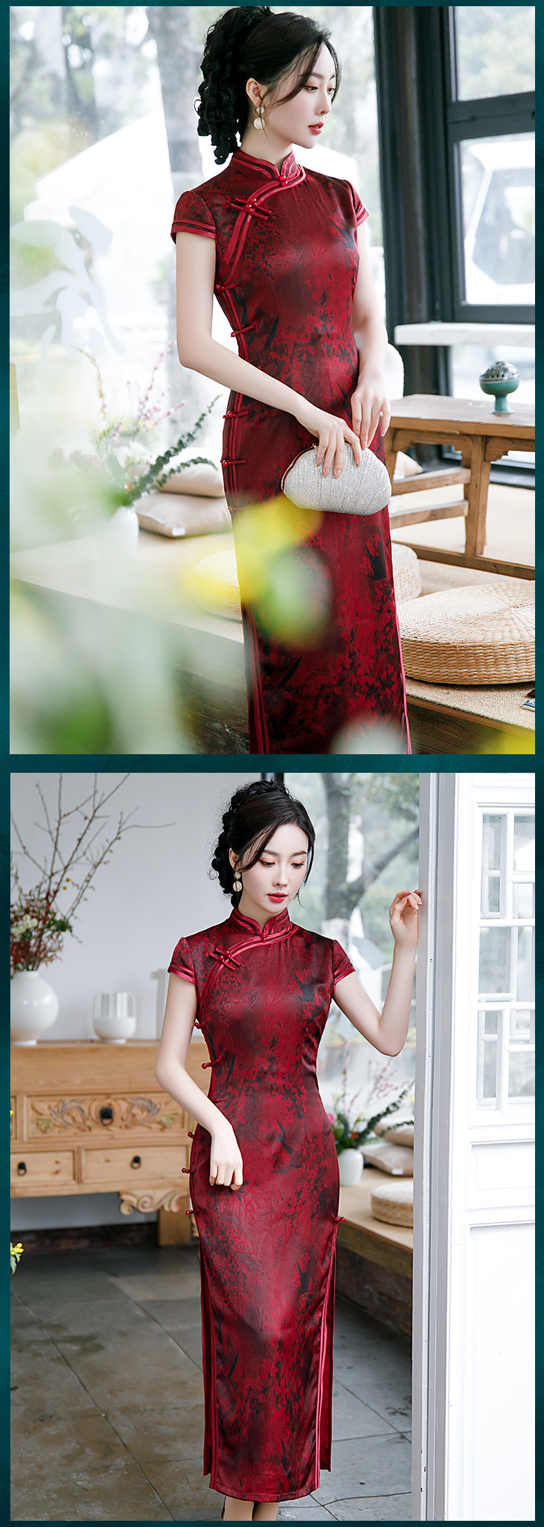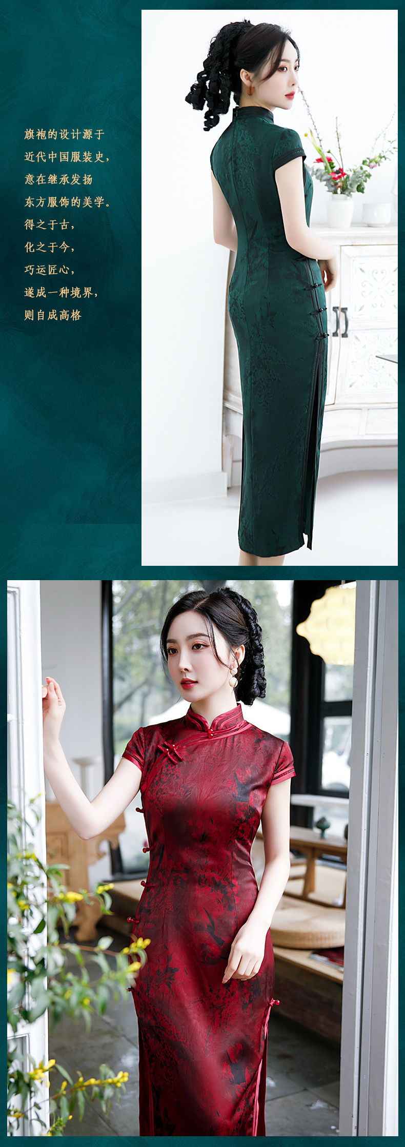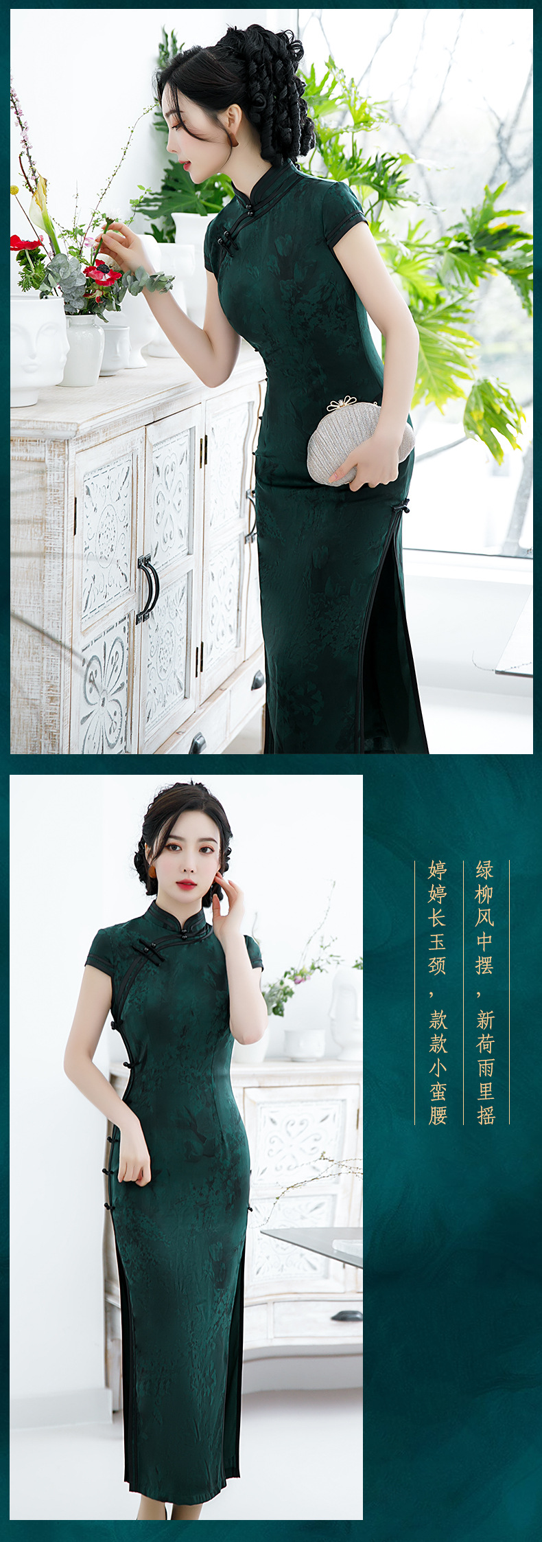 2021新款时尚女士年轻长款旗袍短袖收腰包臀斜襟立领改良版C1040