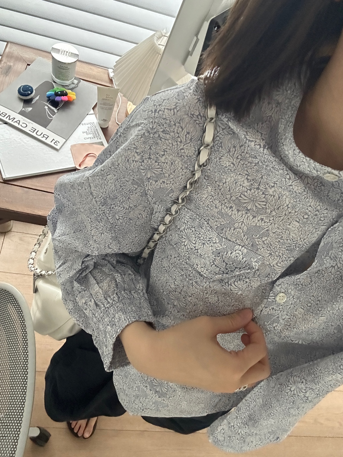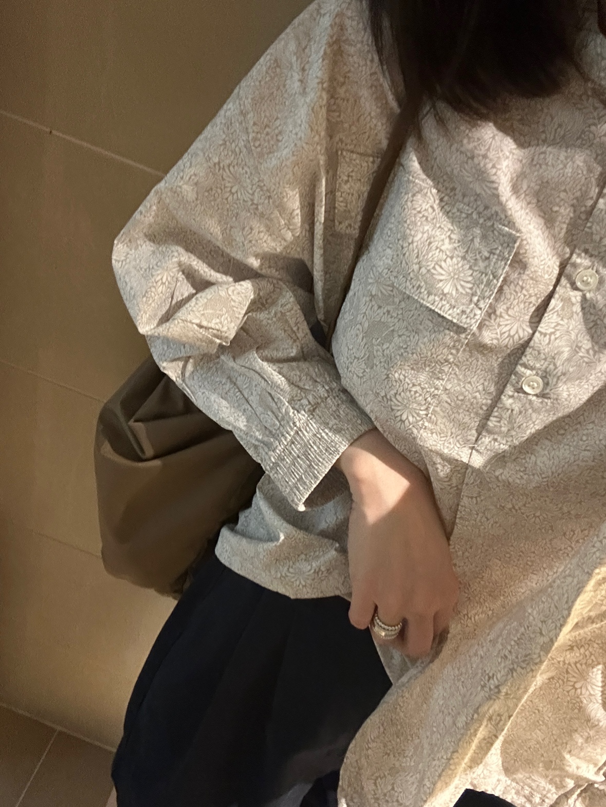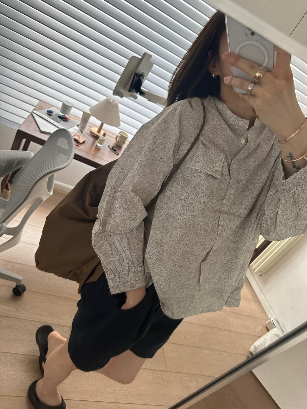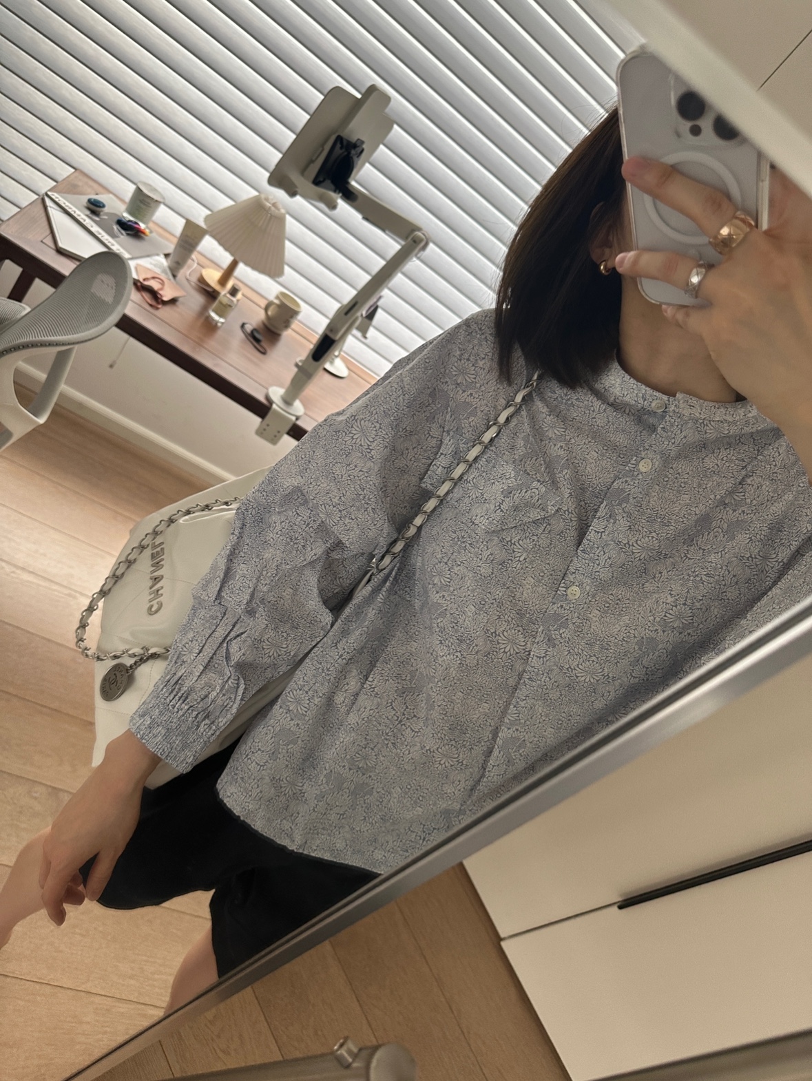 23春夏日式和尚領清新滿印小碎花抽繩兩穿9分鬆緊袖廓形薄料襯衫