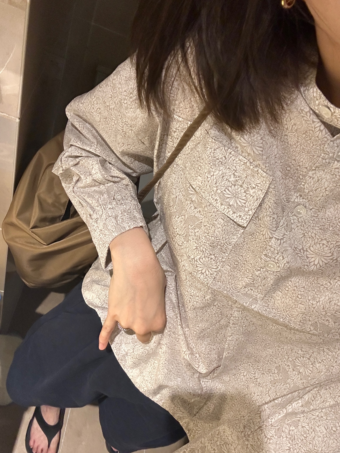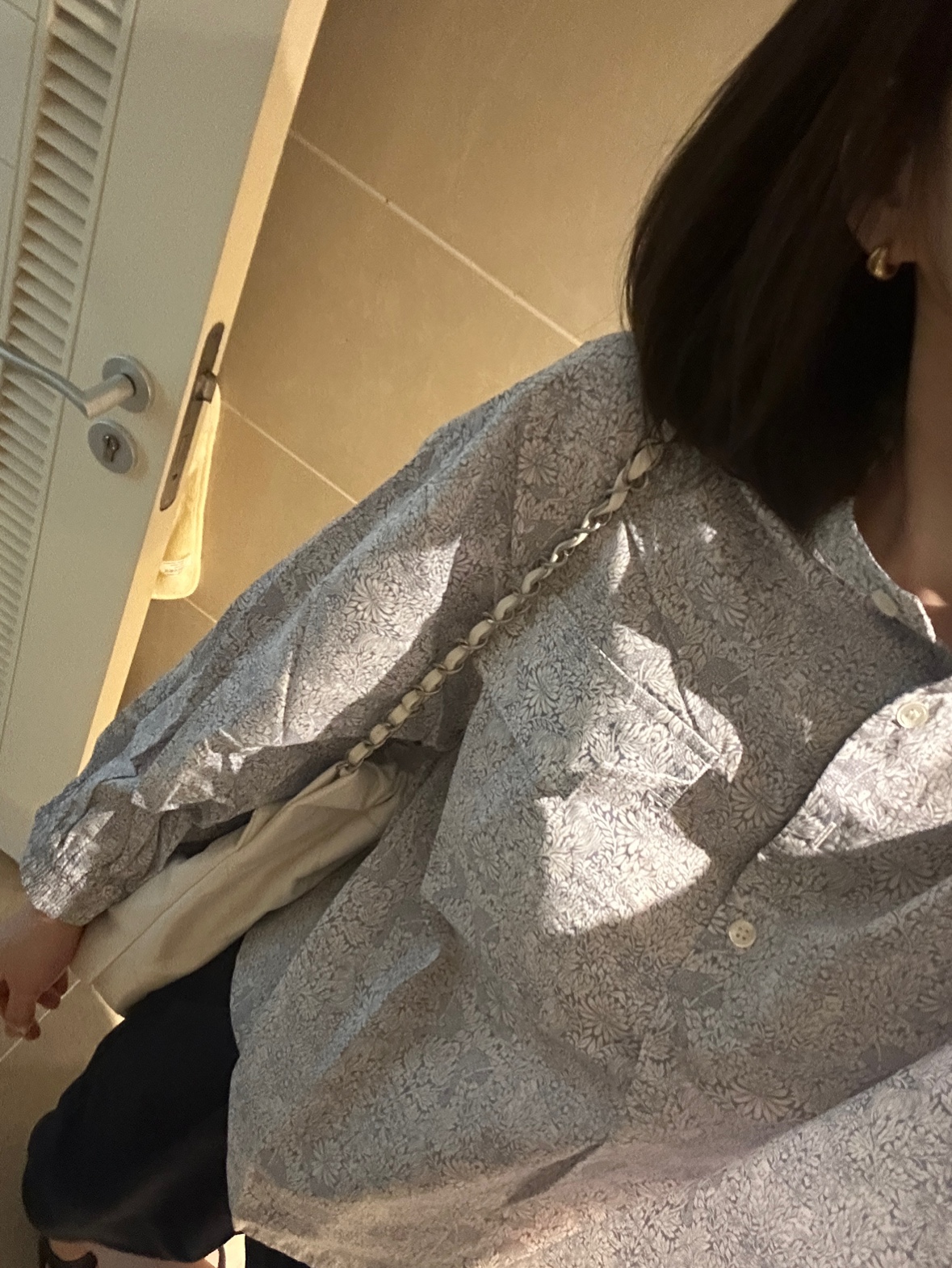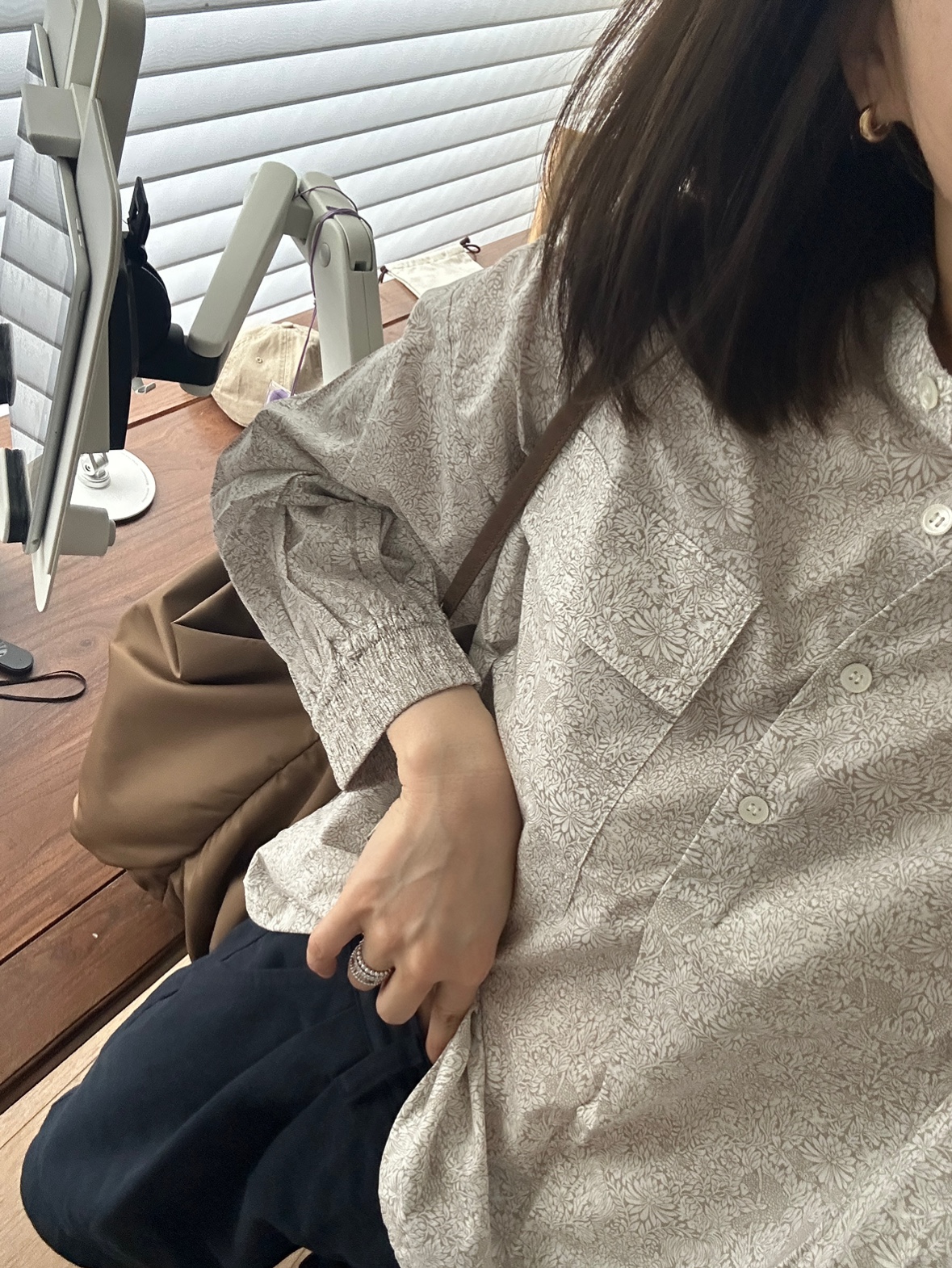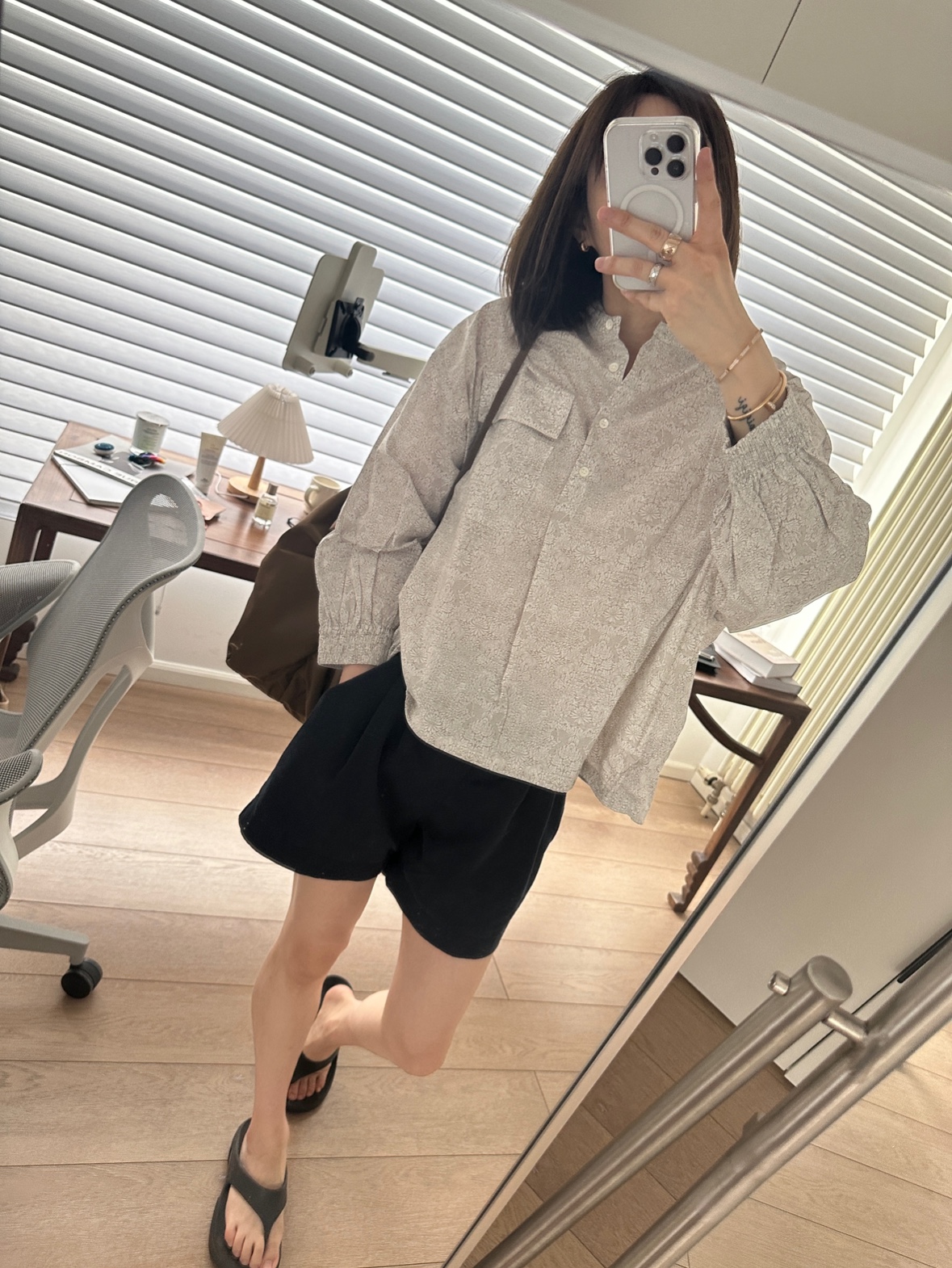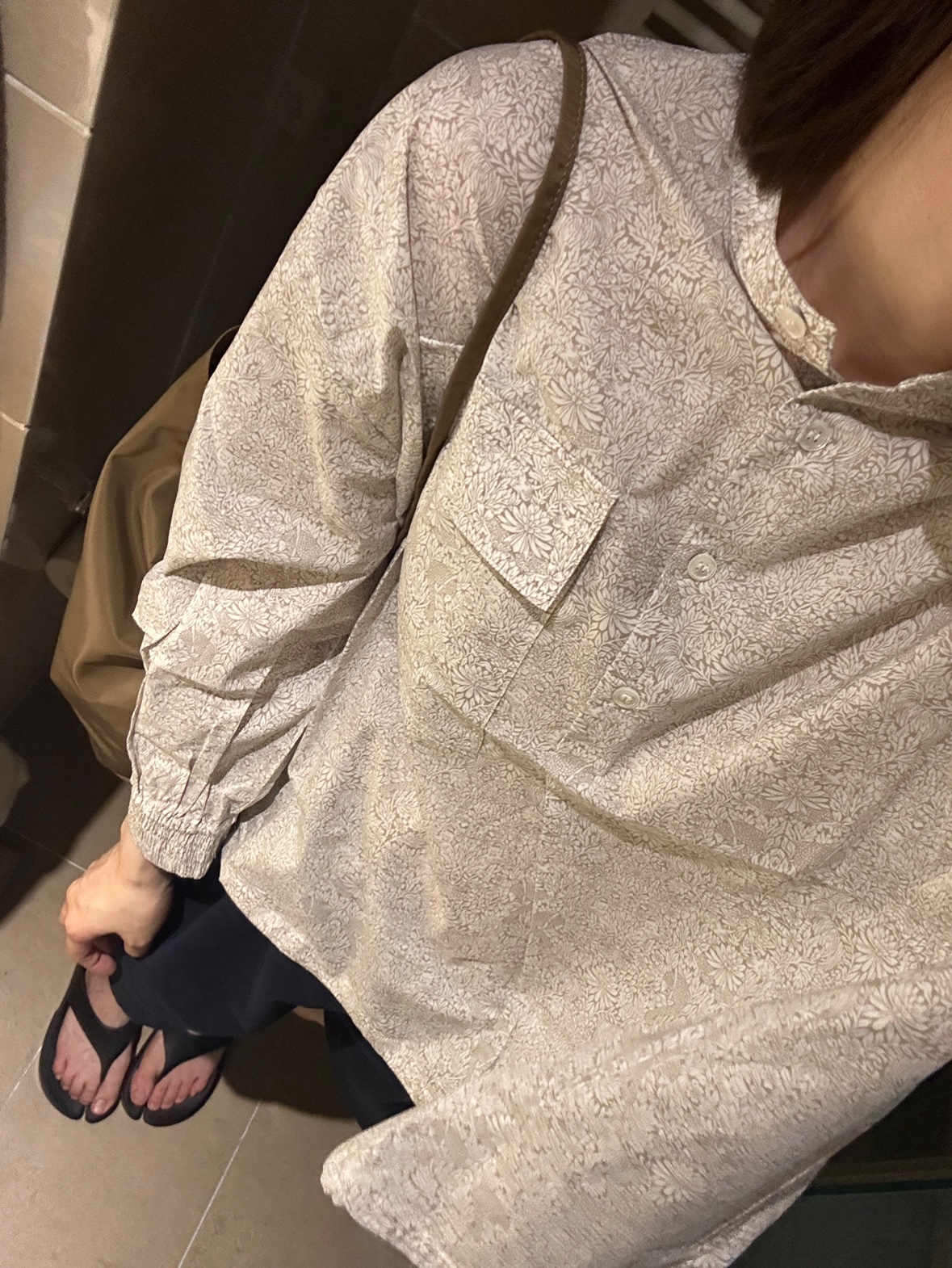 23春夏日式和尚領清新滿印小碎花抽繩兩穿9分鬆緊袖廓形薄料襯衫