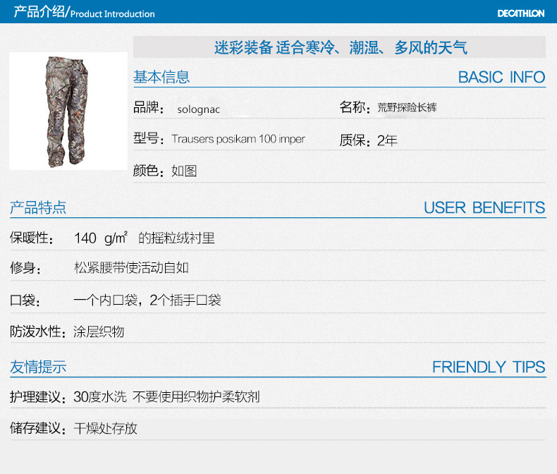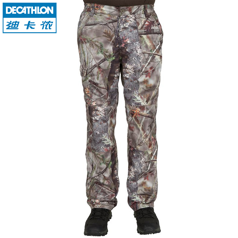 迪卡儂 仿生迷彩褲子戶外男士冬防潑水保暖耐磨迷彩長褲 SOLOGNAC