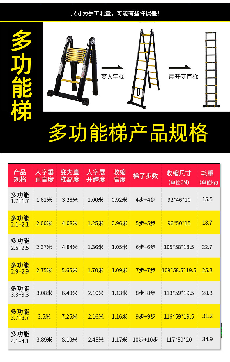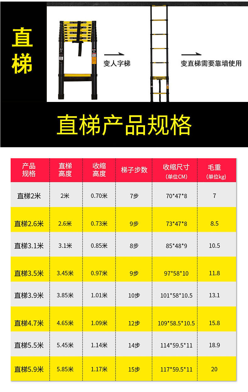 踏板数 单面直梯2.7米,单面直梯3.5米,单面直梯3.9米,单面直梯4.7米,单面直梯5.5米,单面直梯5.9米,双面人字梯2.7+2.7米,双面人字梯3.1+3.1米,双面人字梯3.9+3.9米,特宽82mm踏板两用 人字1.7+1.7变3.4米,特宽82mm踏板两用 人字2.1+2.1变4.2米,特宽82mm踏板两用 人字2.5+2.5变5米,特宽82mm踏板两用 人字2.9+2.9变5.8米,特宽82mm踏板两用 人字3.3+3.3变6.6米,特宽82mm踏板两用 人字3.7+3.7变7.4米,特宽82mm踏板两用 人字4.1+4.1变8.2米,双面人字梯4.7+4.7,双面人字梯5.5+5.5,单面直梯3.1米