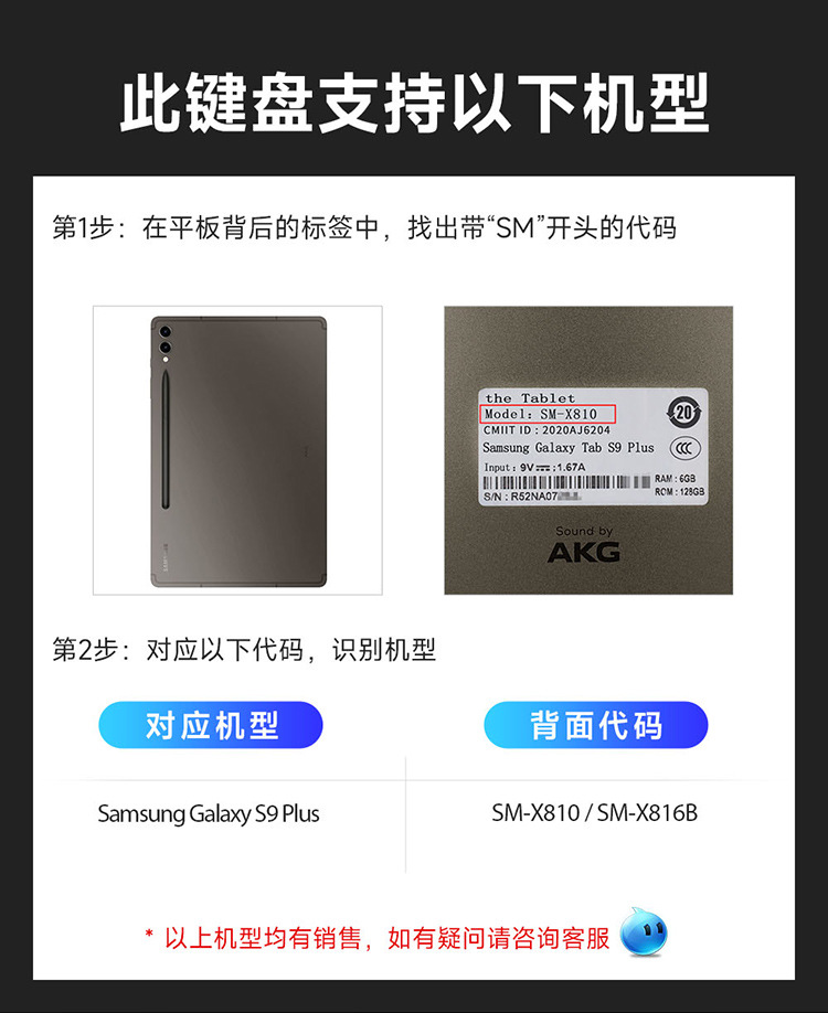 产品类型 三星Tab S9 Plus (X810/X816B)Keyboard 键盘,三星 Tab S9 (X710/X716B)Keyboard 键盘,三星Tab S9 FE (X510/X516B)Keyboard 键盘,三星Tab S9 FE Plus (X610/X616B) Keyboard 键盘,三星Tab S8 (X700/X706) / S7 (T870/T875/T876B),三星Tab S8 Plus (X800/X806) /S7FE / S7 Plus,三星Tab S6 Lite (P610/P613/P615/P619),三星Tab A8 2021 (X200/X205),三星Tab A9 Plus (X210/X215/X216)