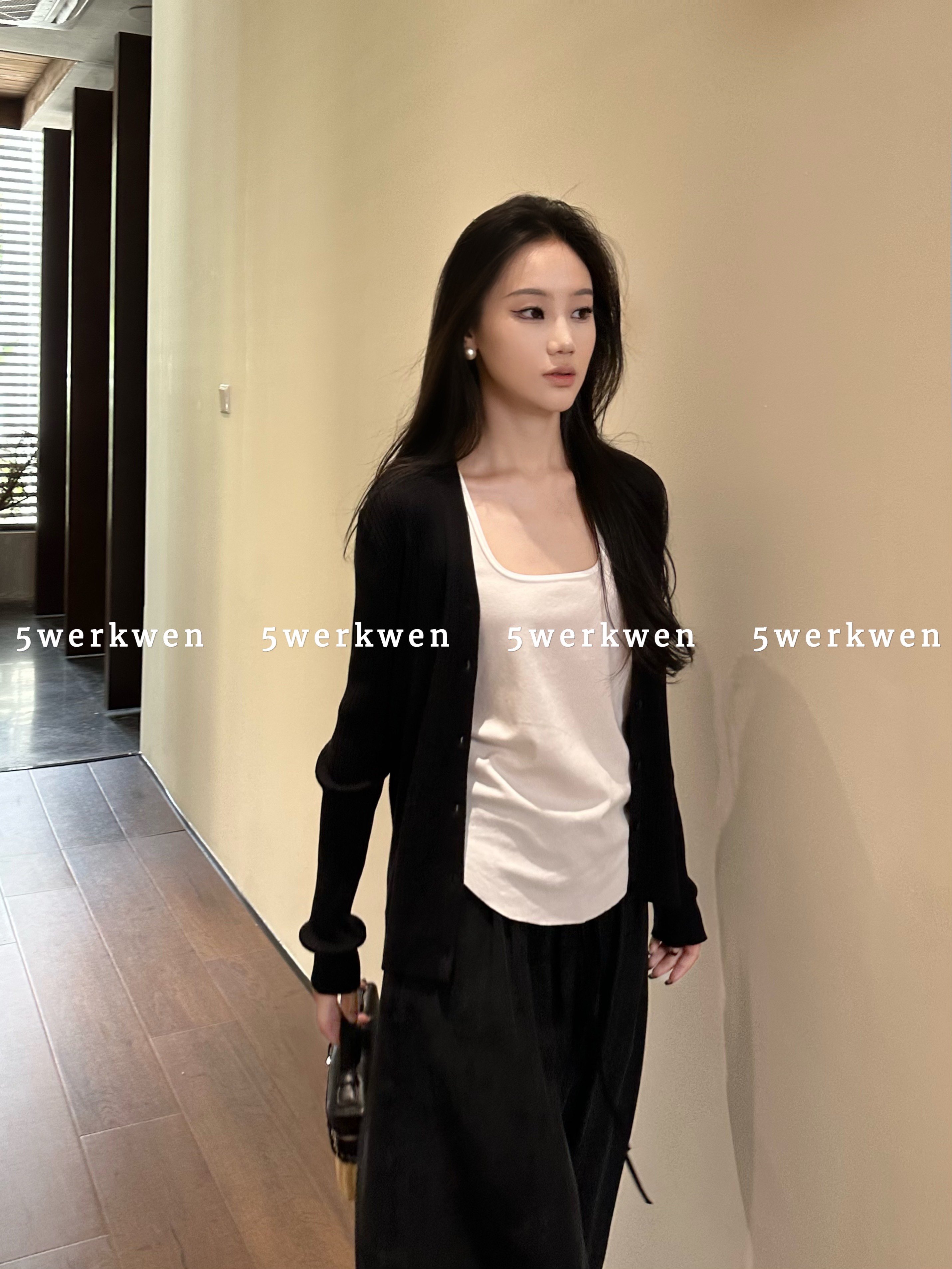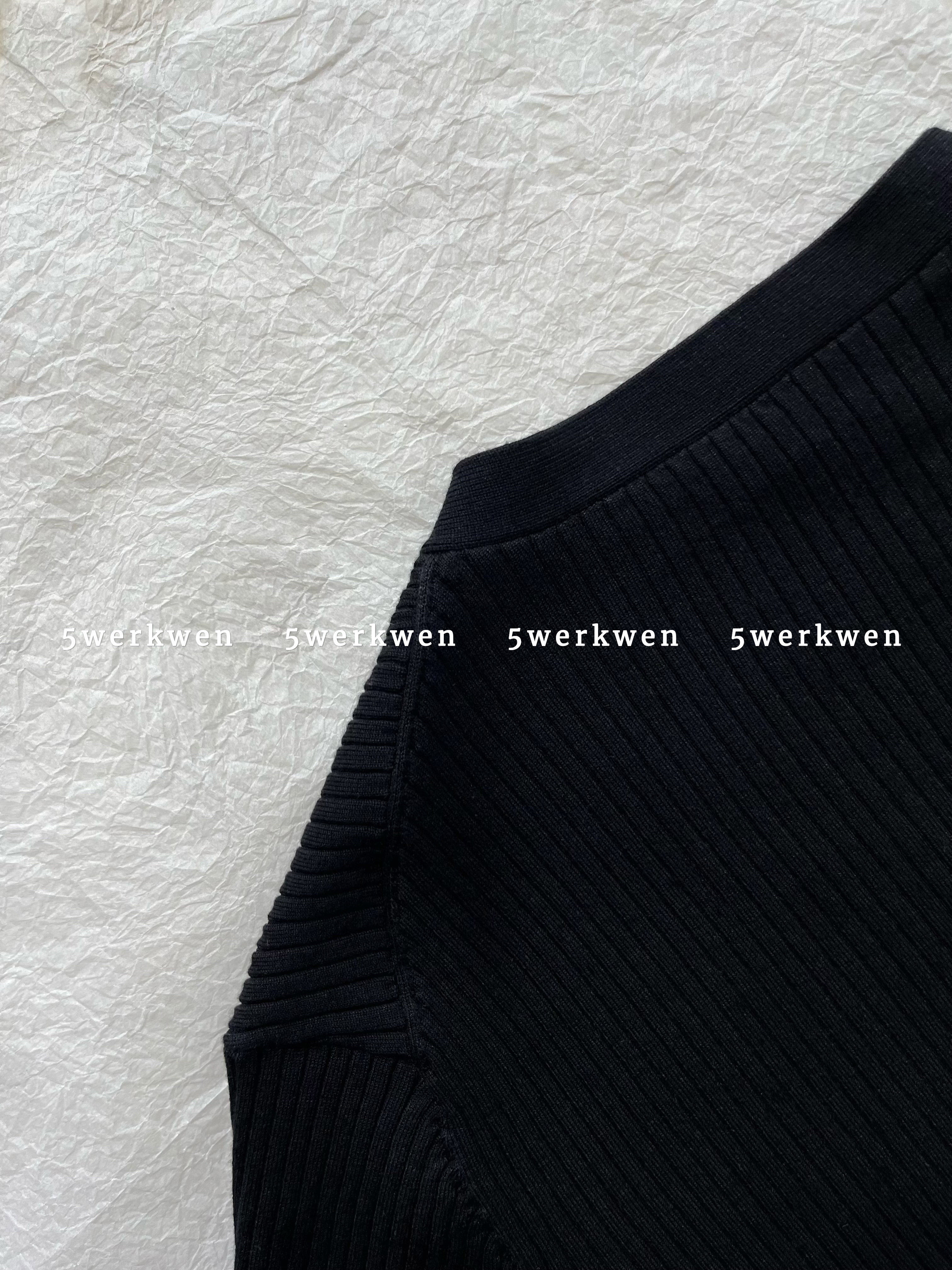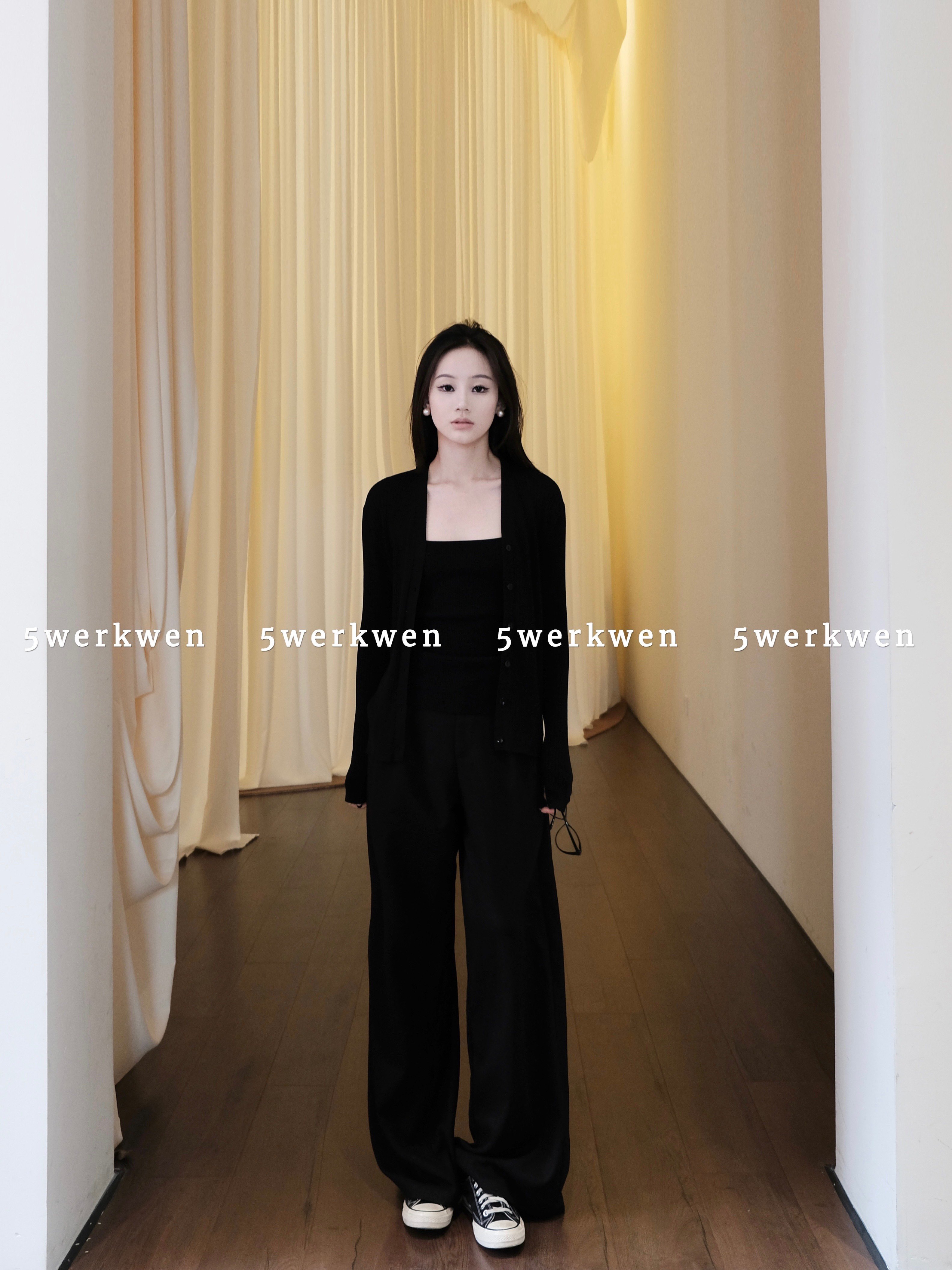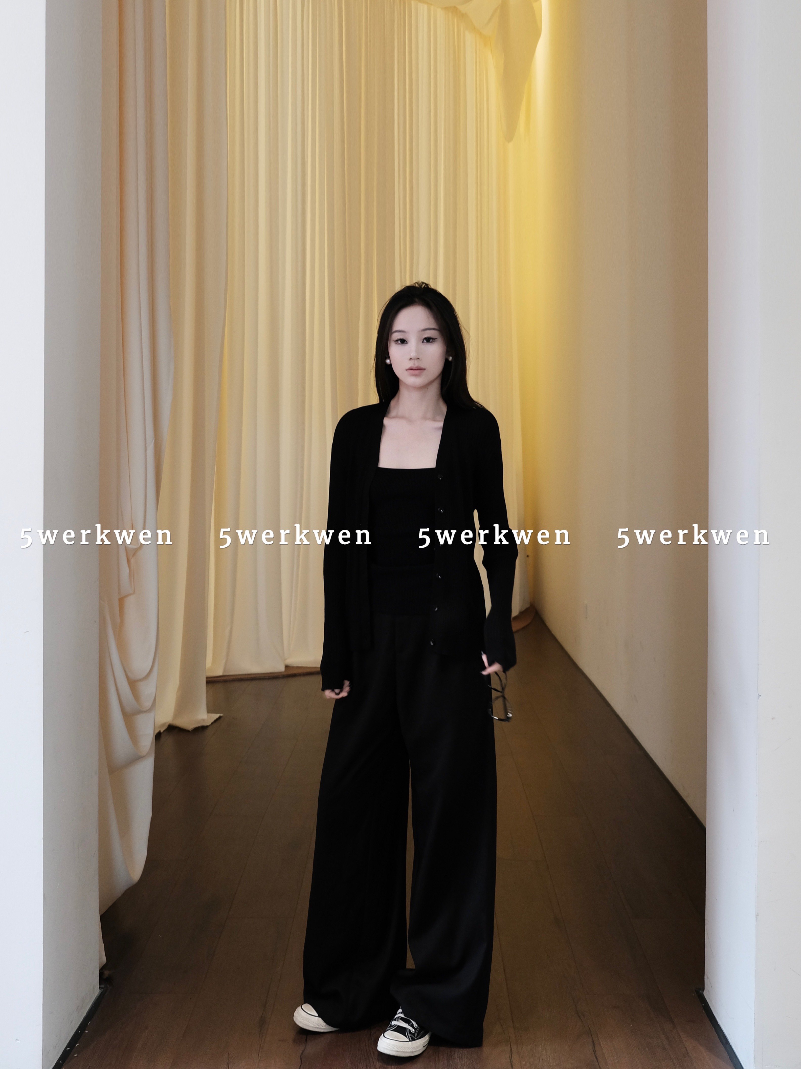 5werkwen 紙片人黑色V領上衣單排扣坑條修身顯瘦針織開衫外套女