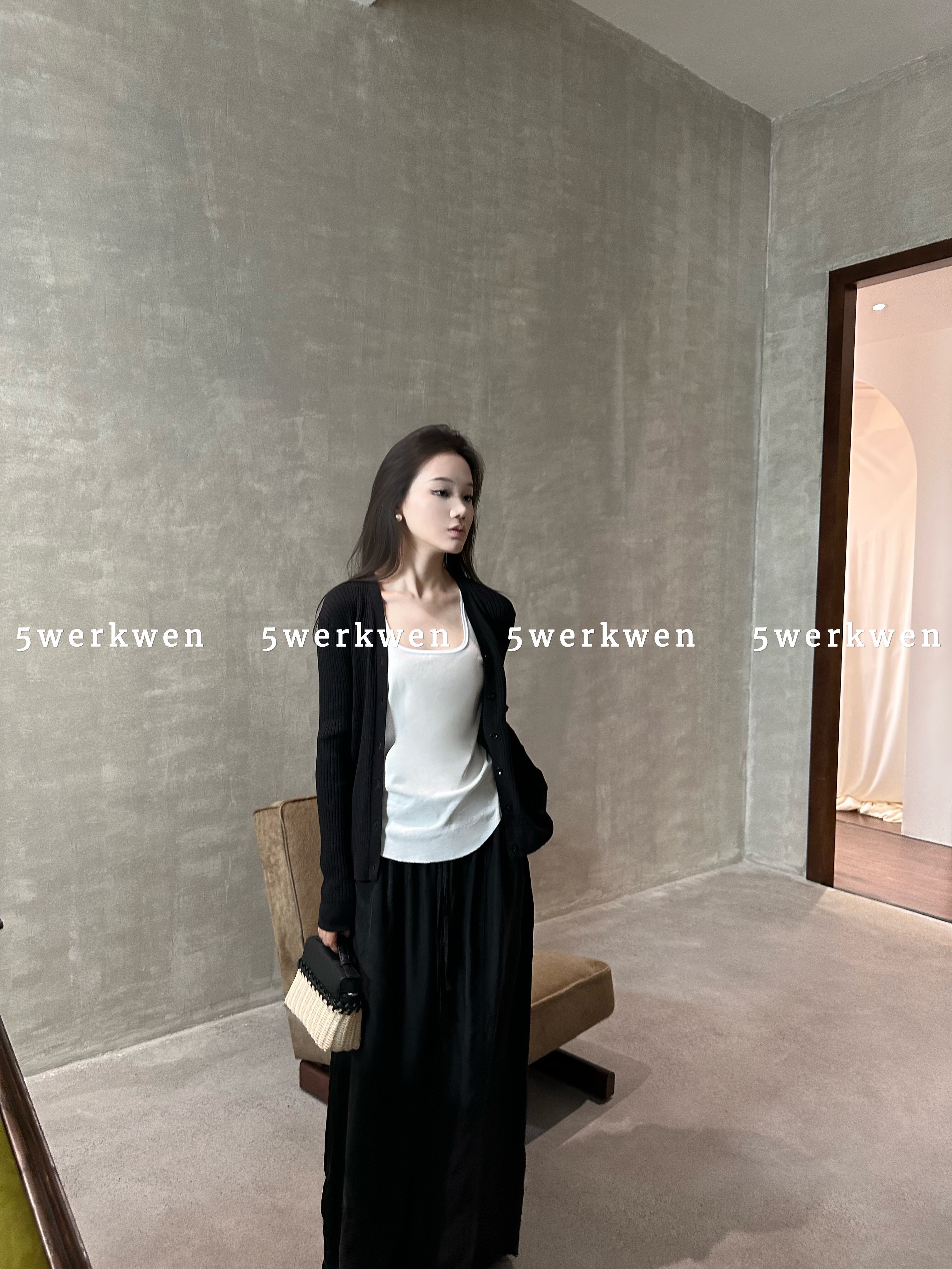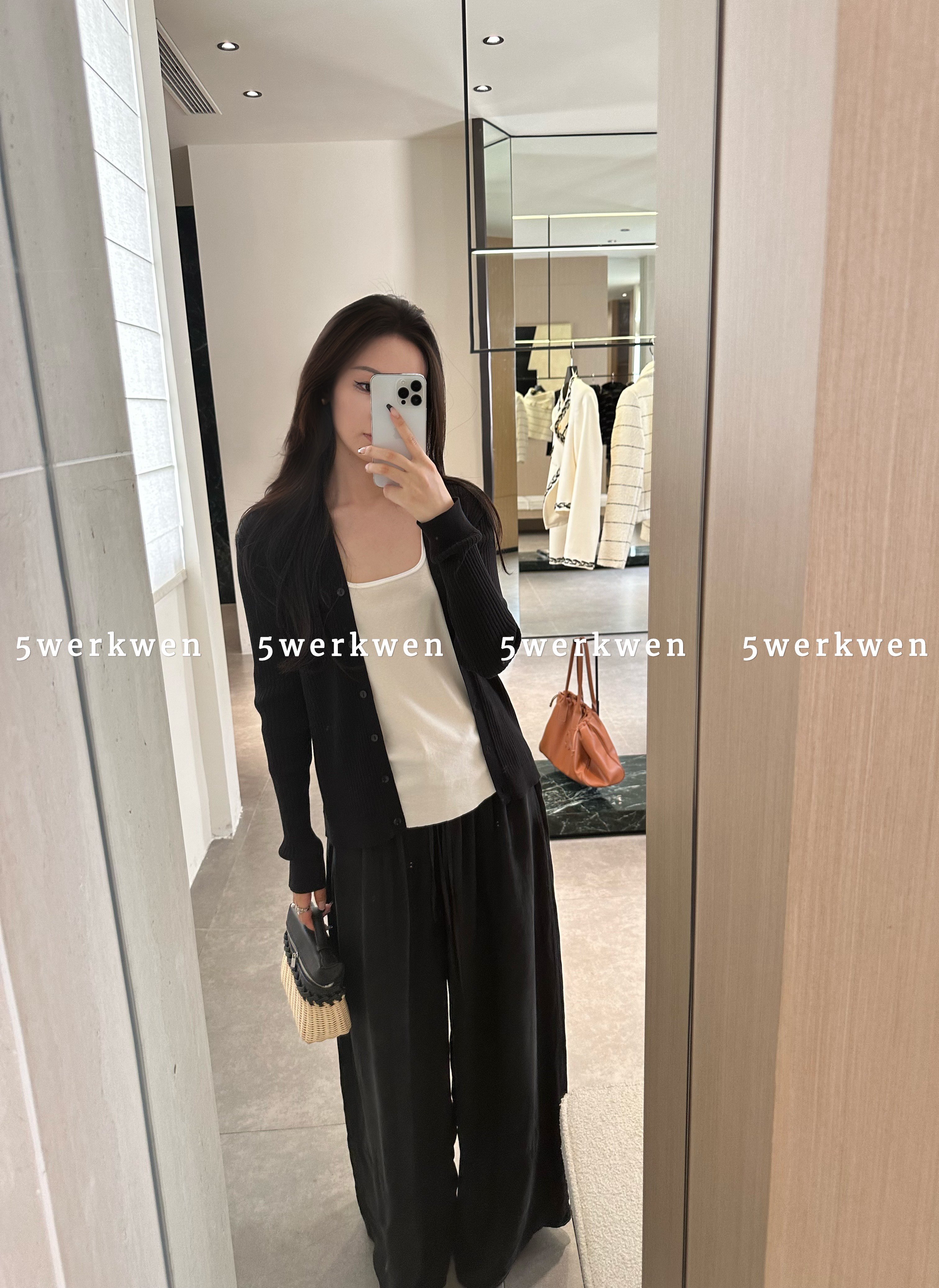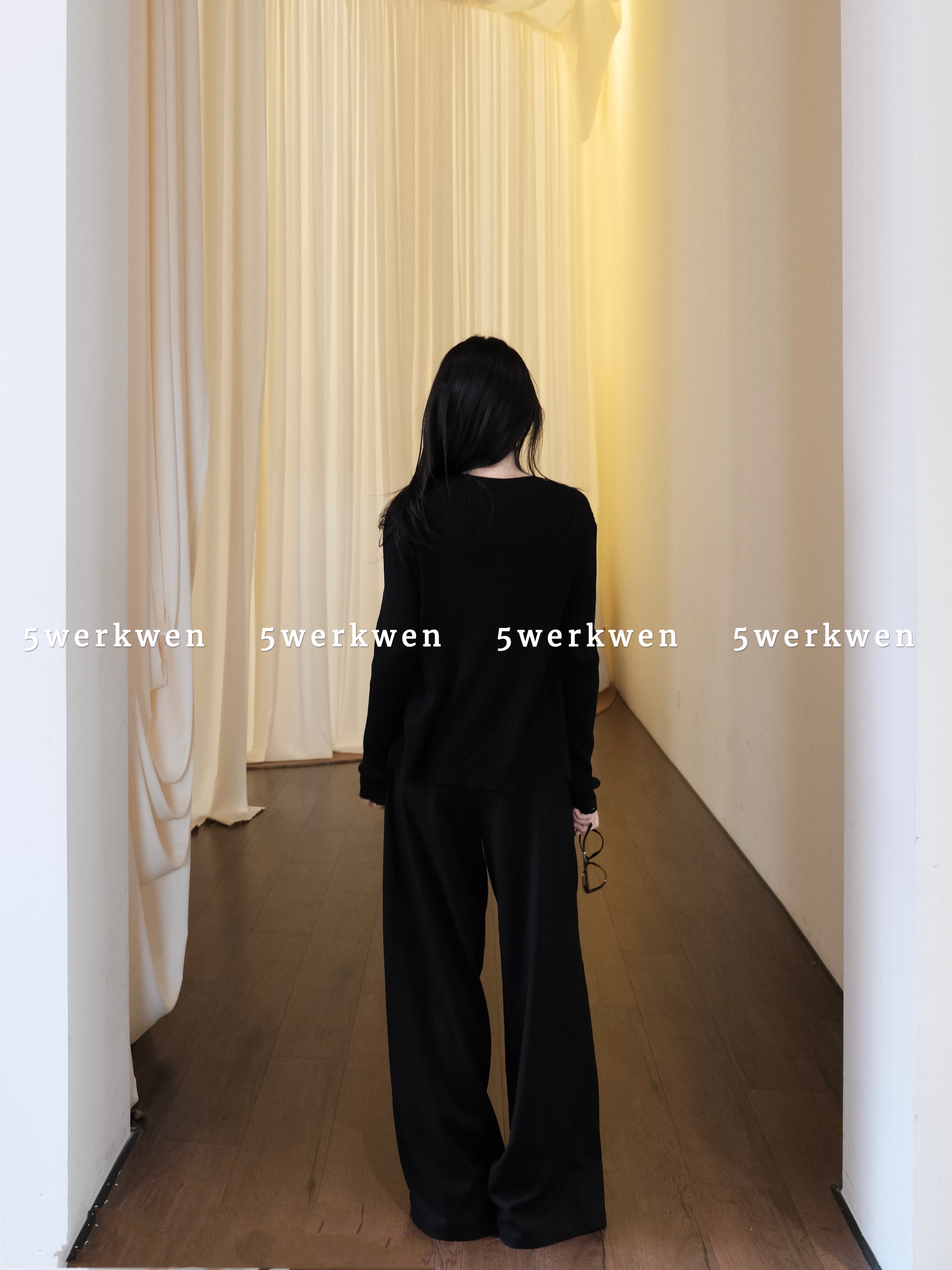 5werkwen 紙片人黑色V領上衣單排扣坑條修身顯瘦針織開衫外套女