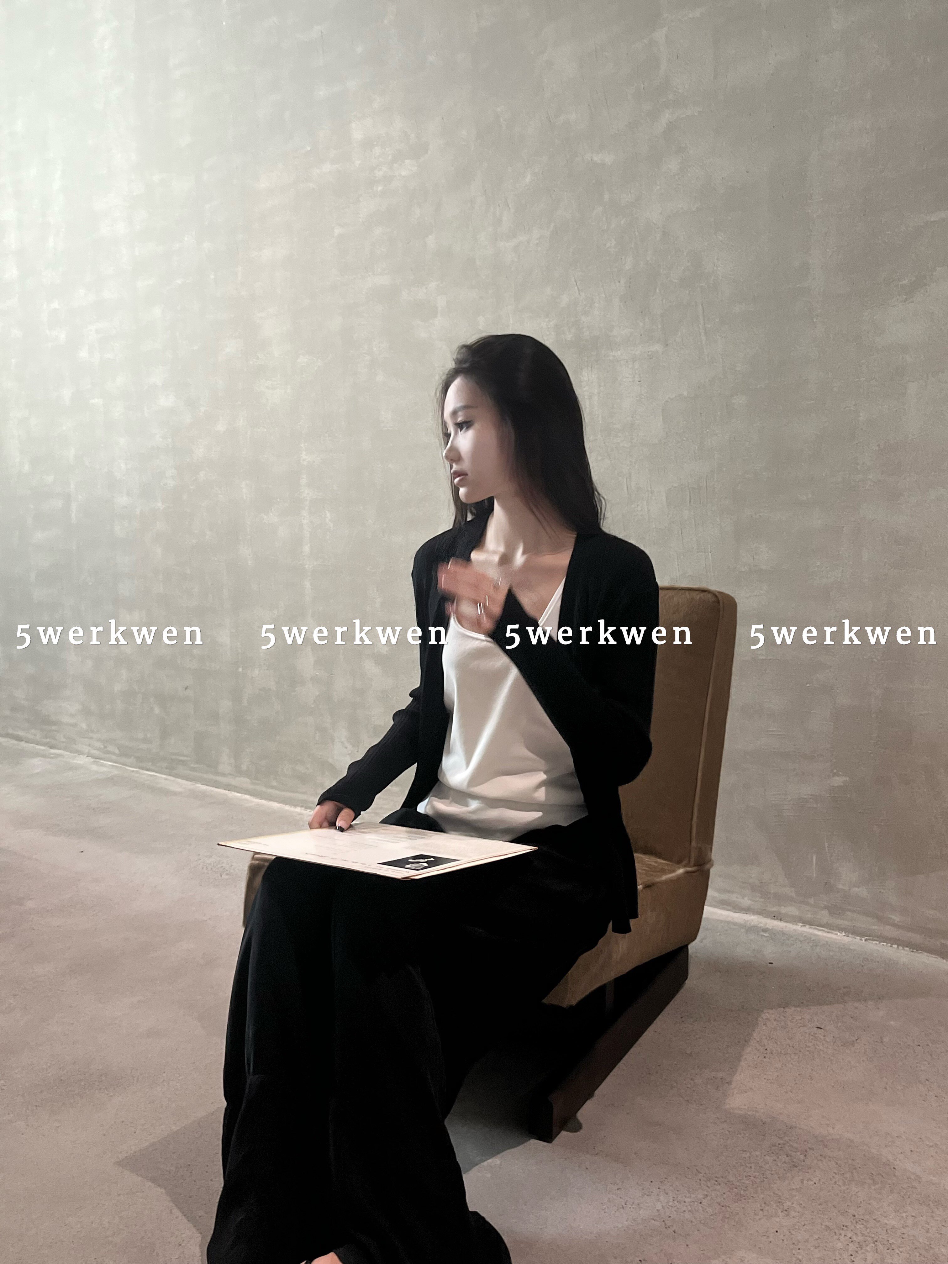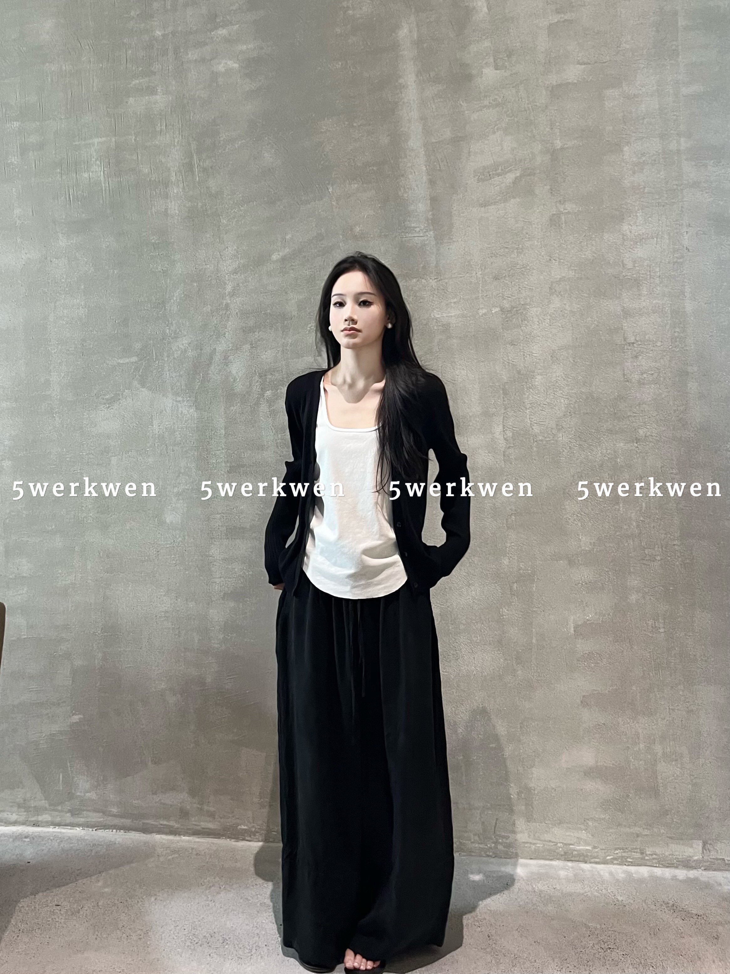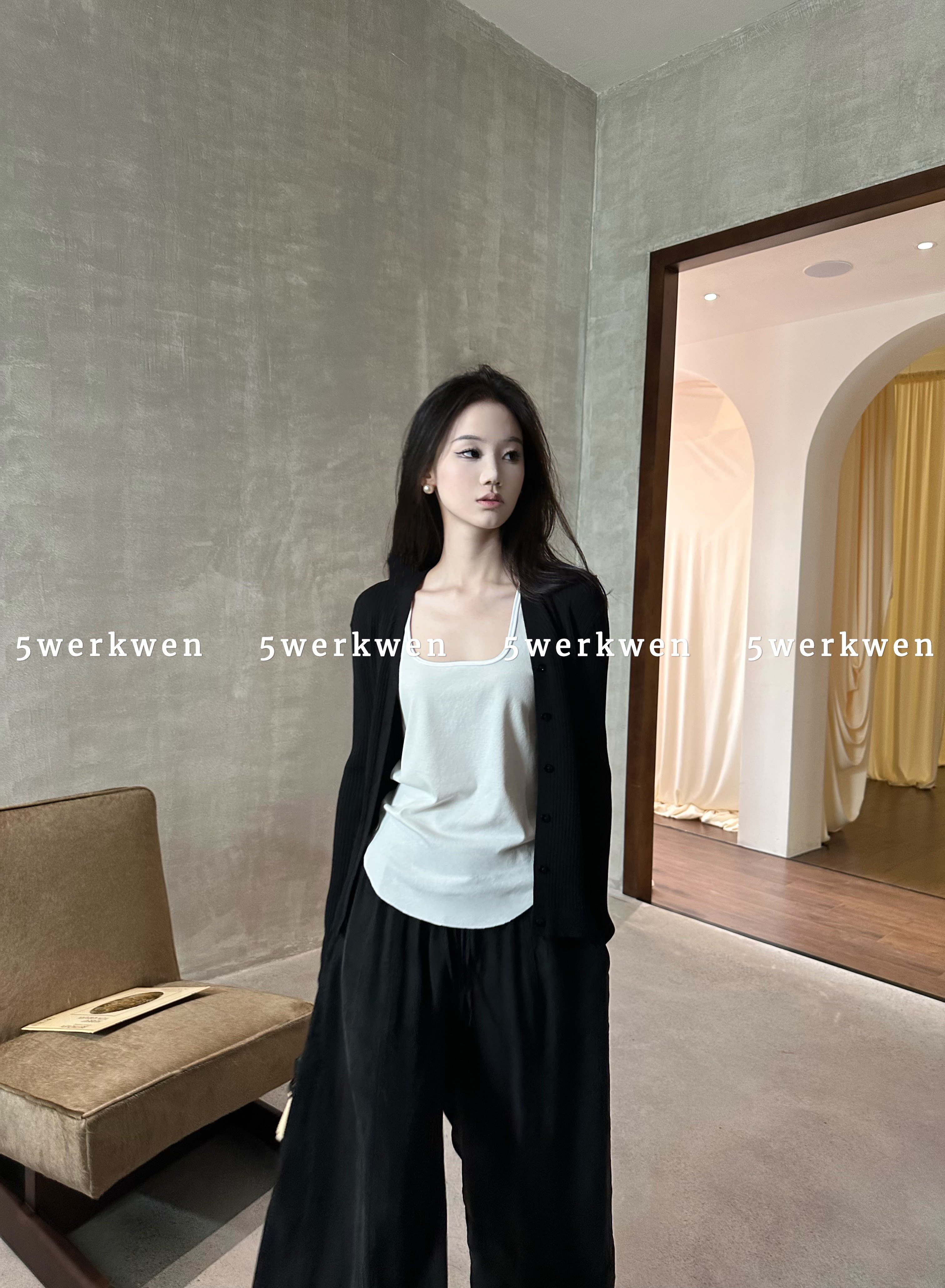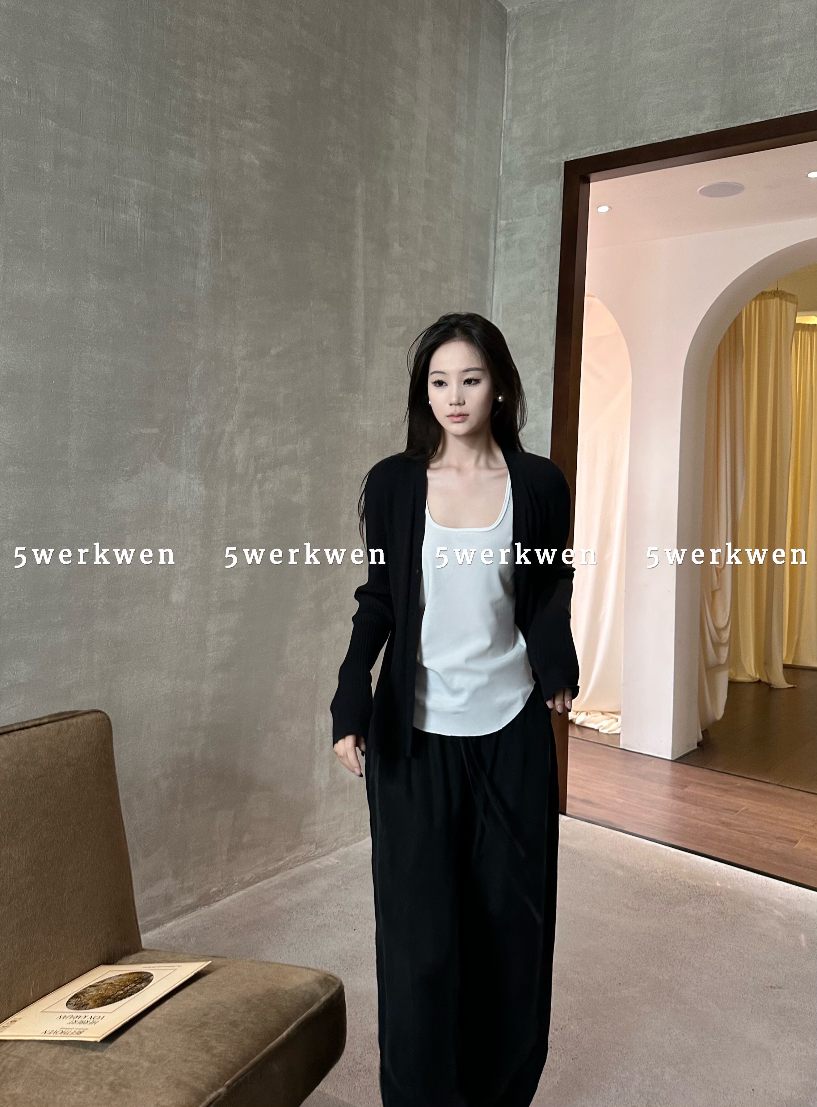 5werkwen 紙片人黑色V領上衣單排扣坑條修身顯瘦針織開衫外套女