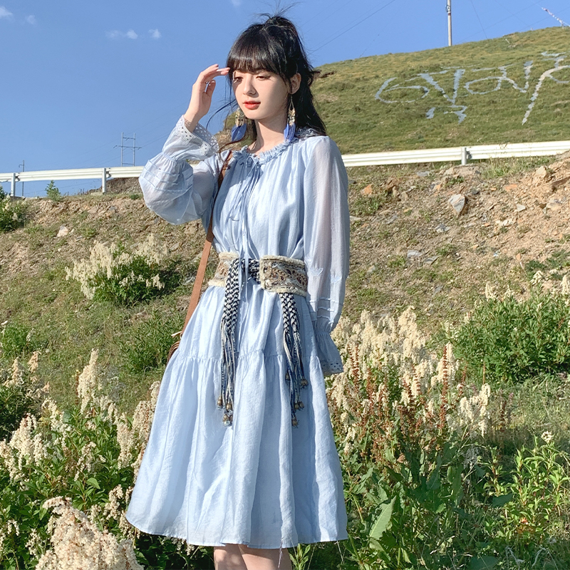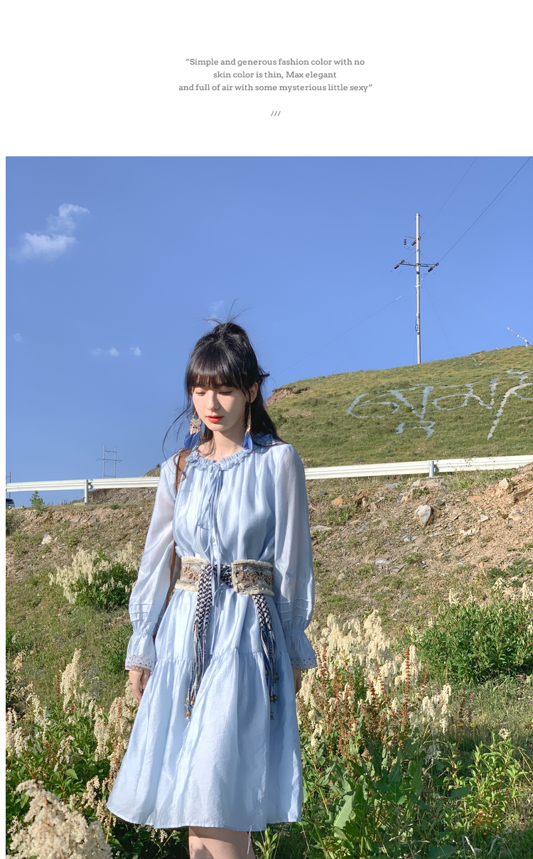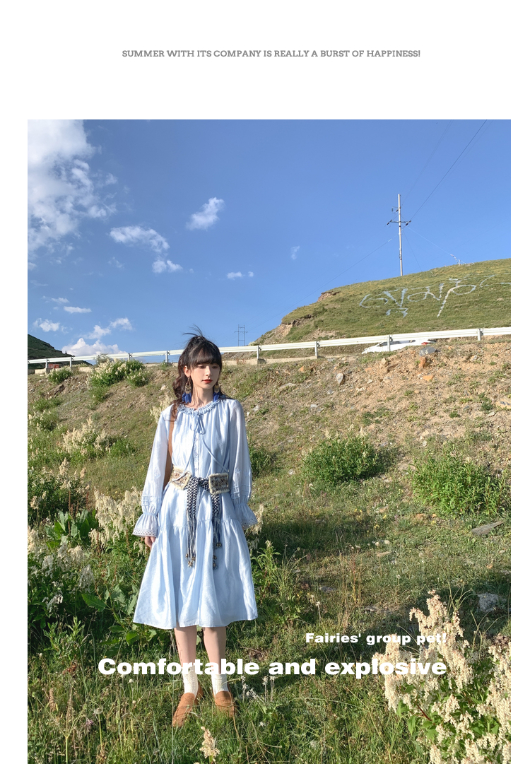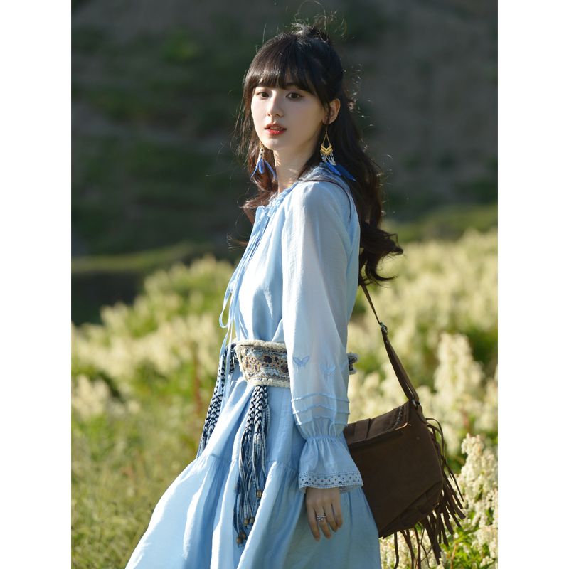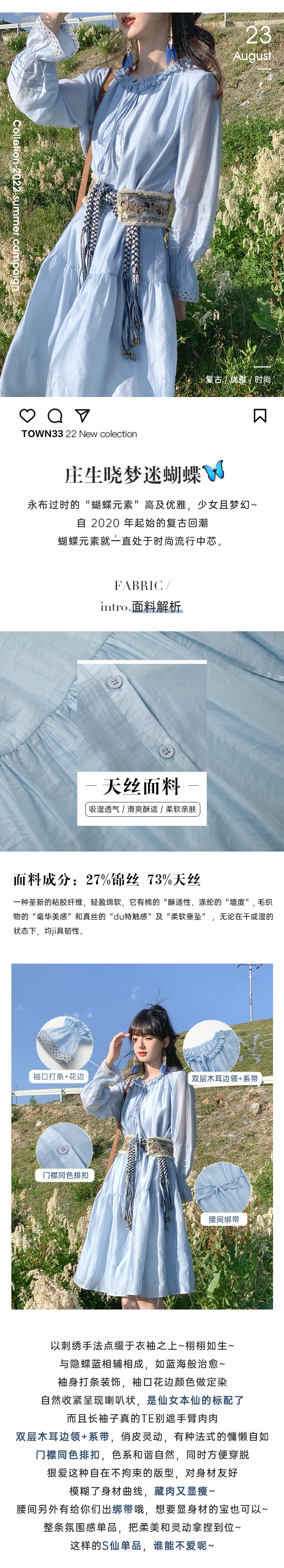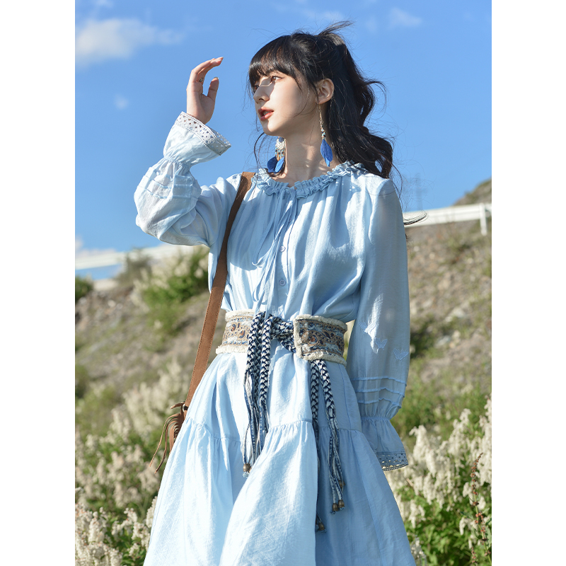 小鎮姍姍 紙舞蝴蝶~雙層木耳邊綁帶天絲洋裝2023新款高腰中長裙