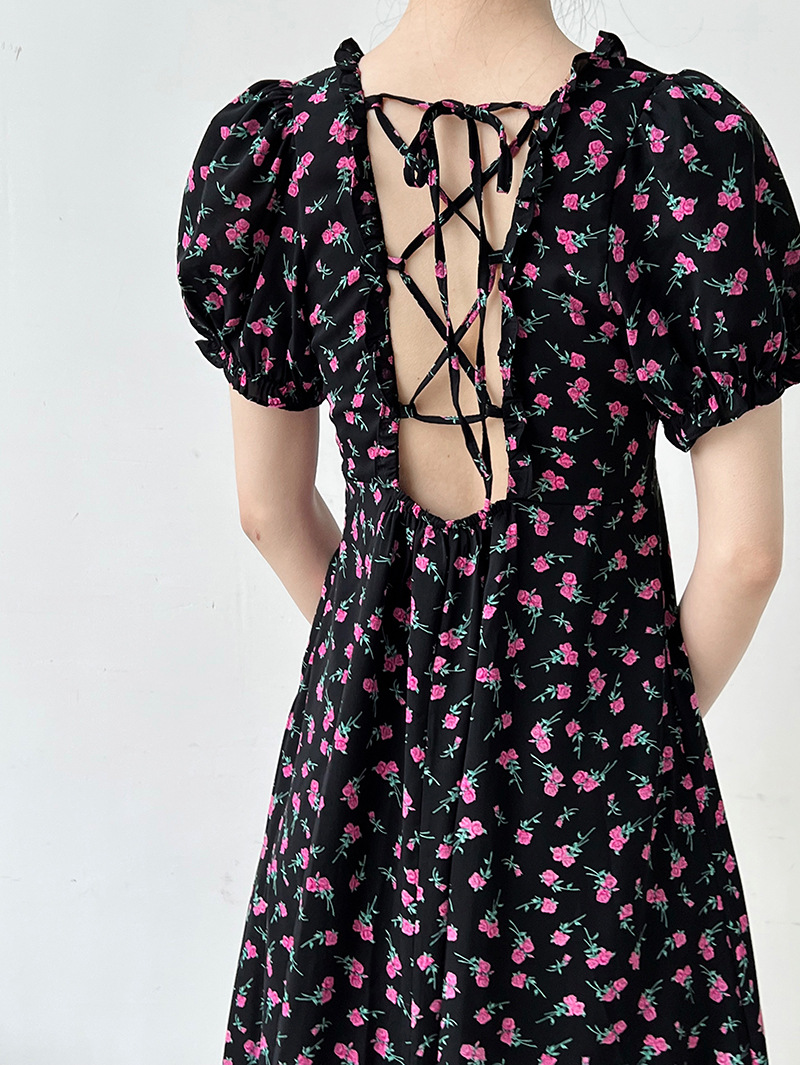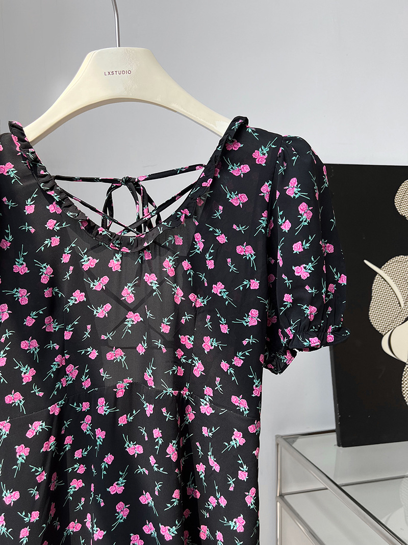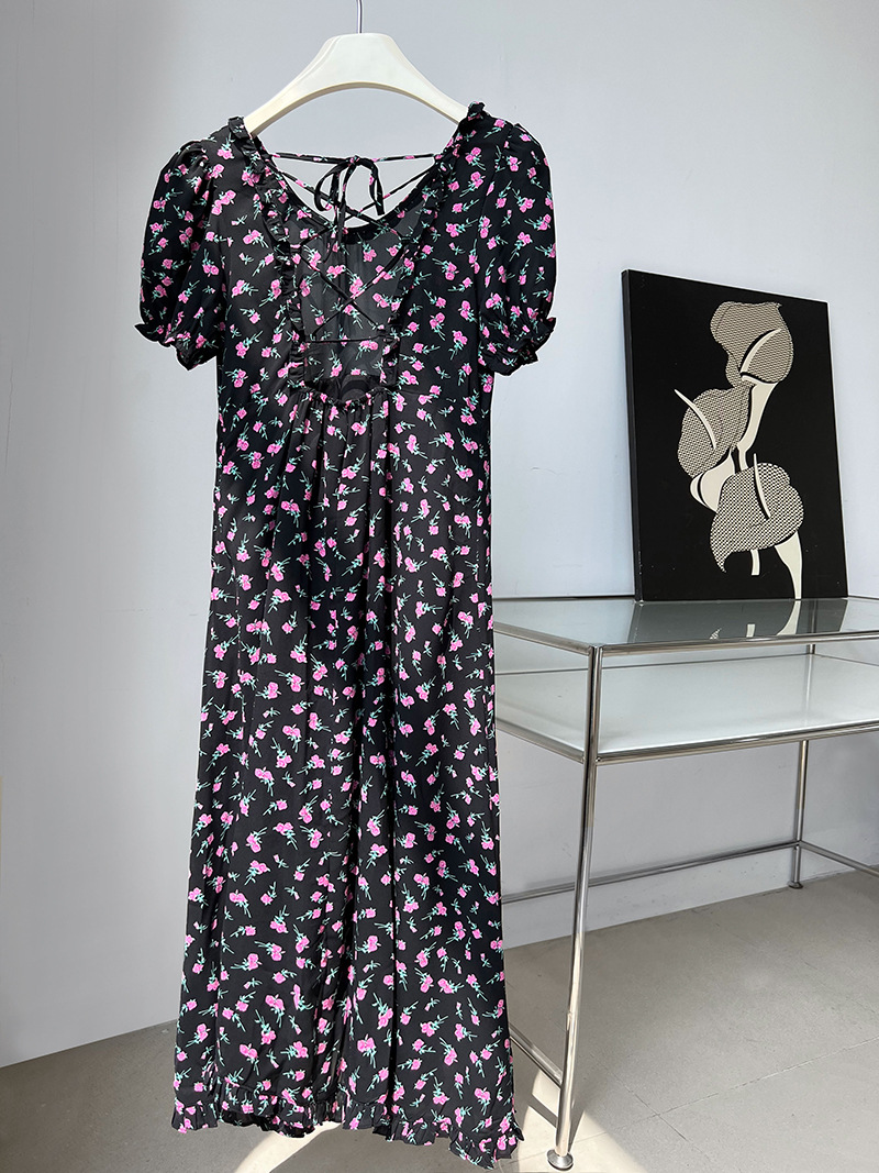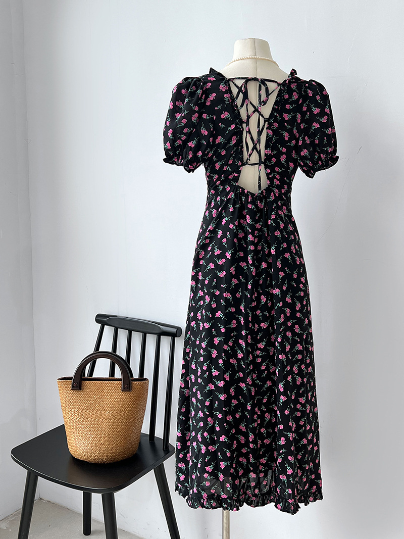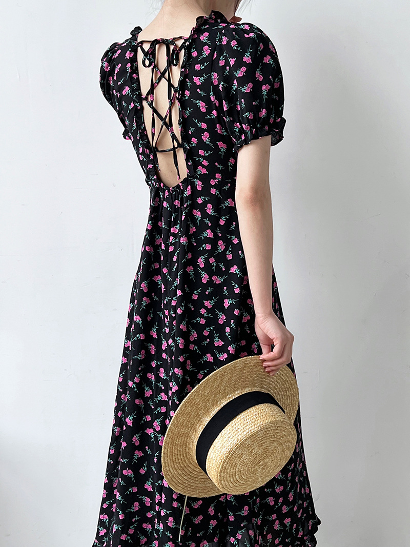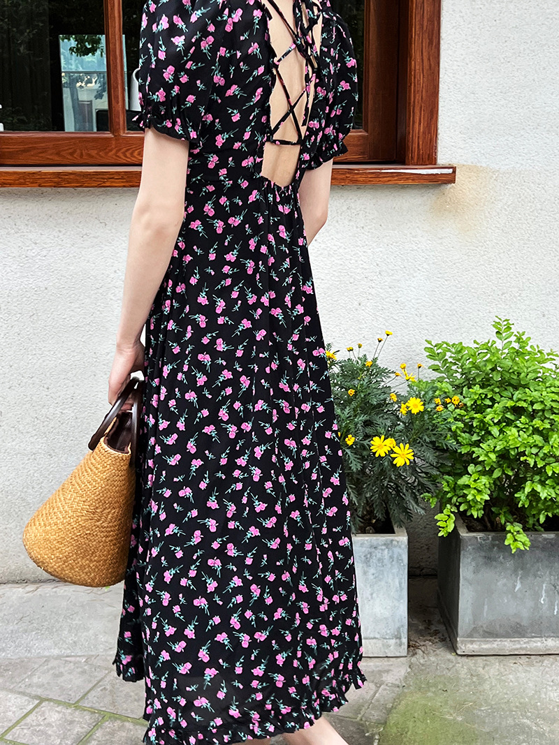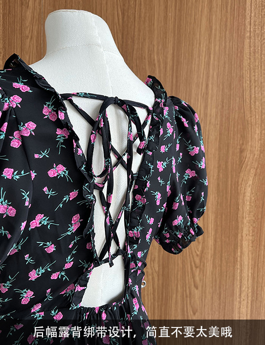 鹿西 后背镂空绑带碎花连衣裙法式气质V领木耳边露背茶歇裙子8757