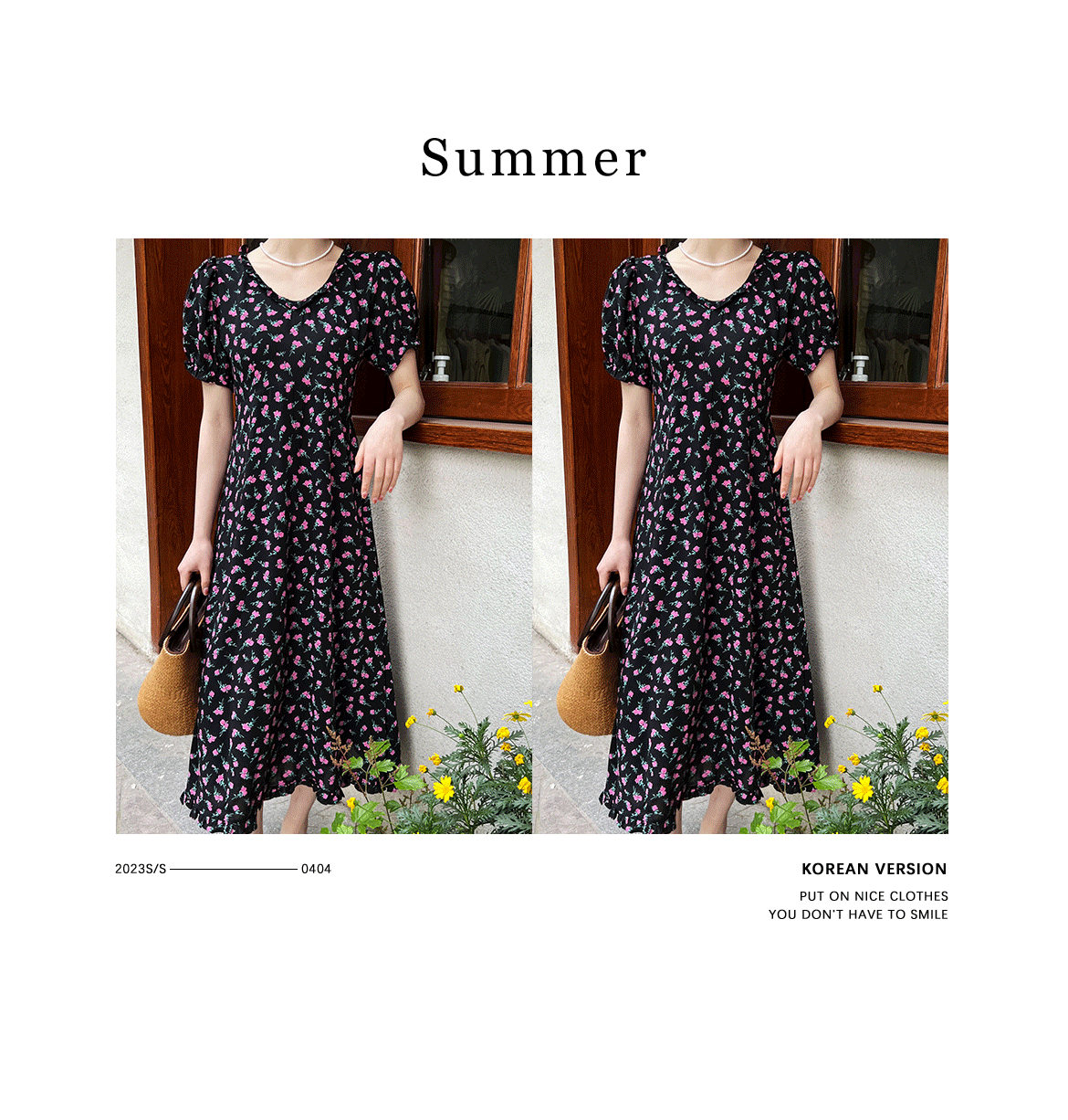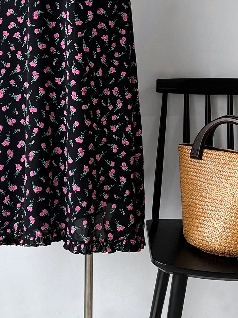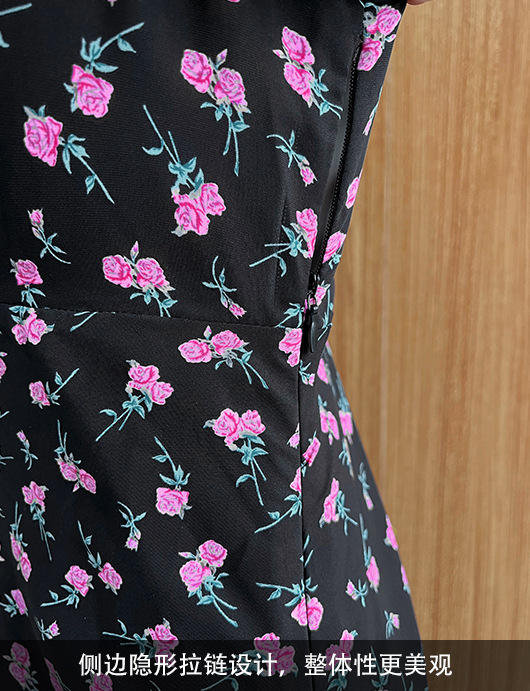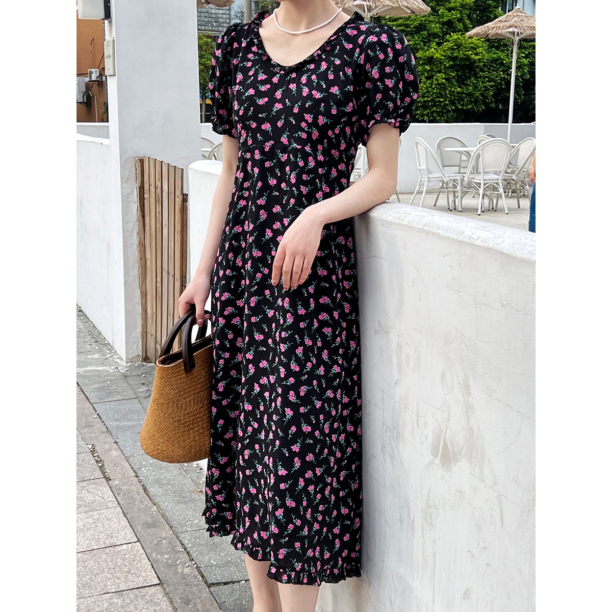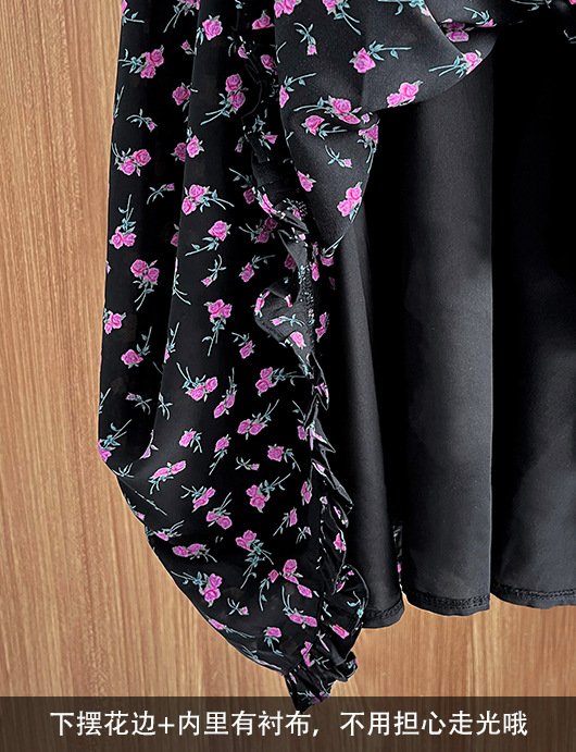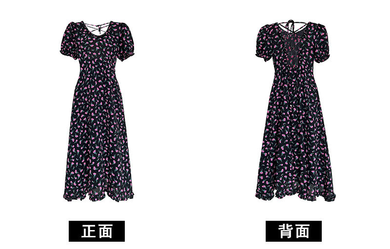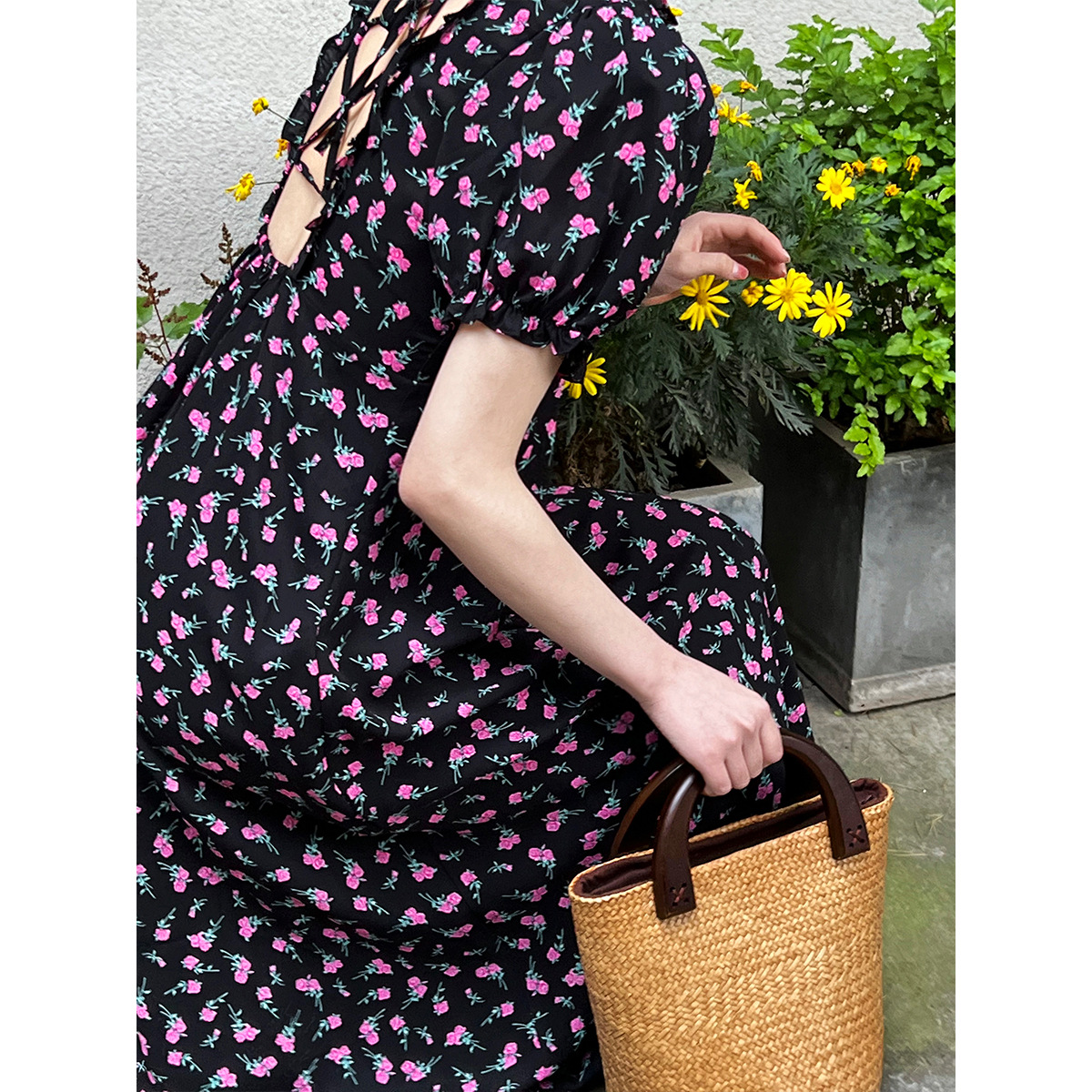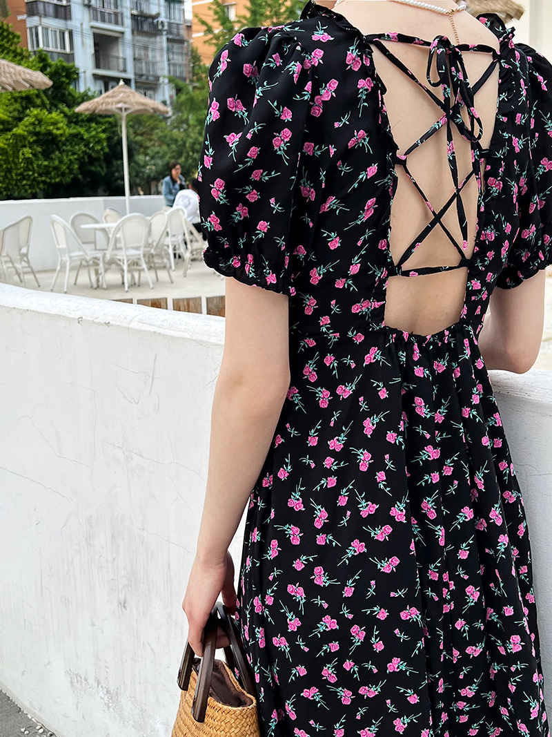 鹿西 后背镂空绑带碎花连衣裙法式气质V领木耳边露背茶歇裙子8757
