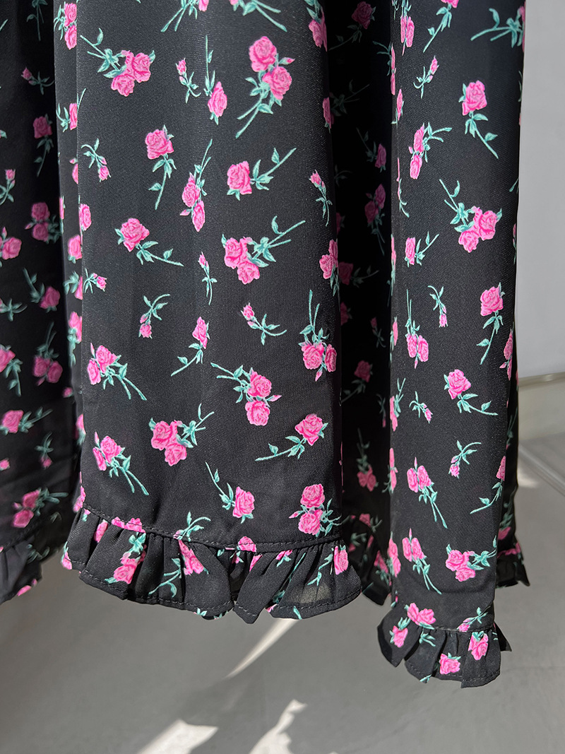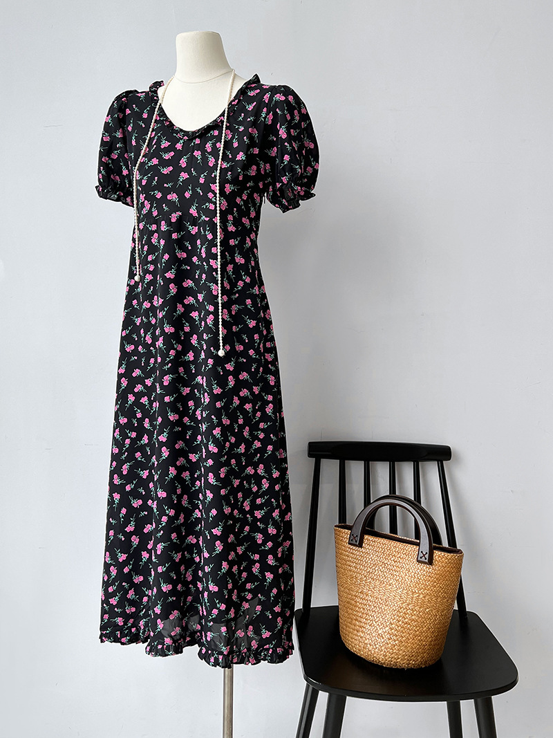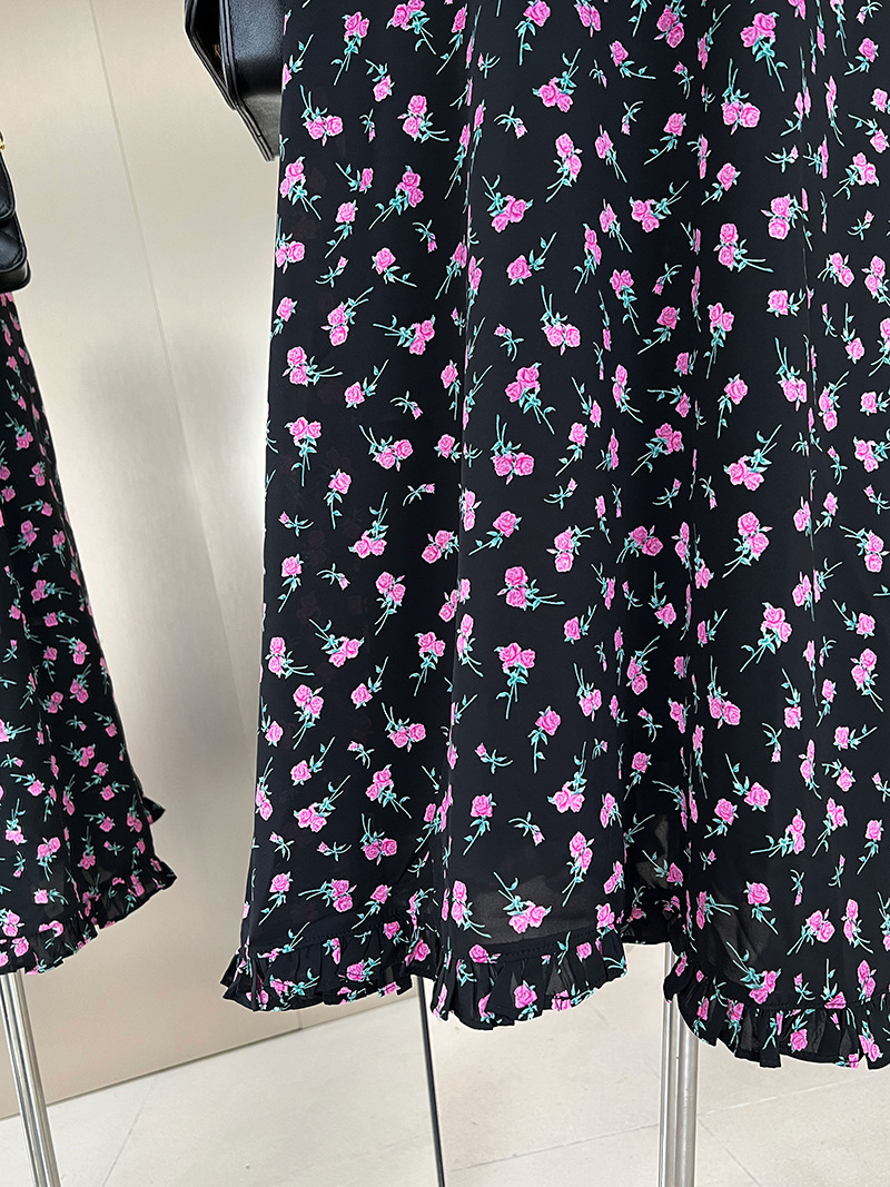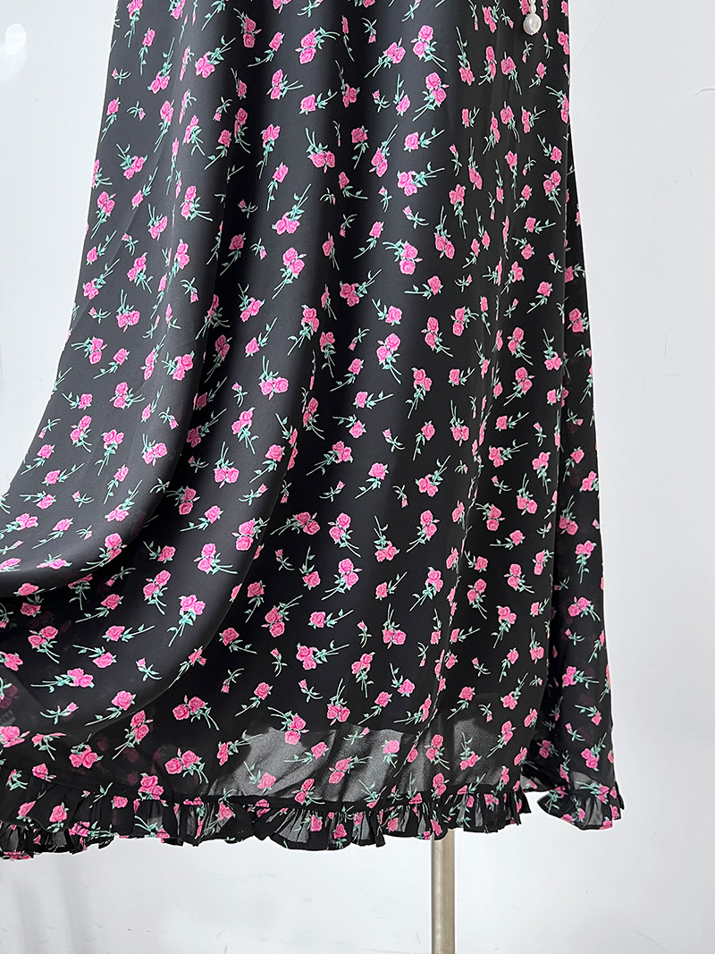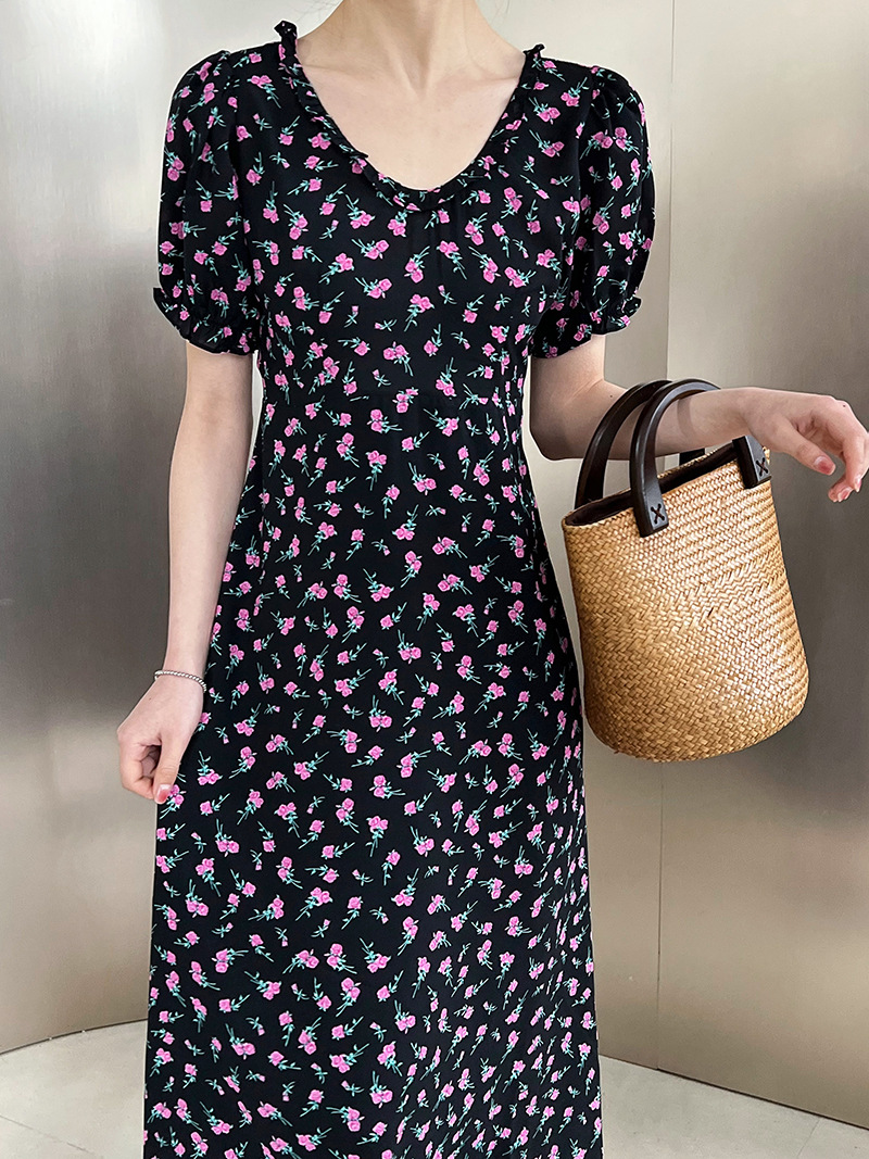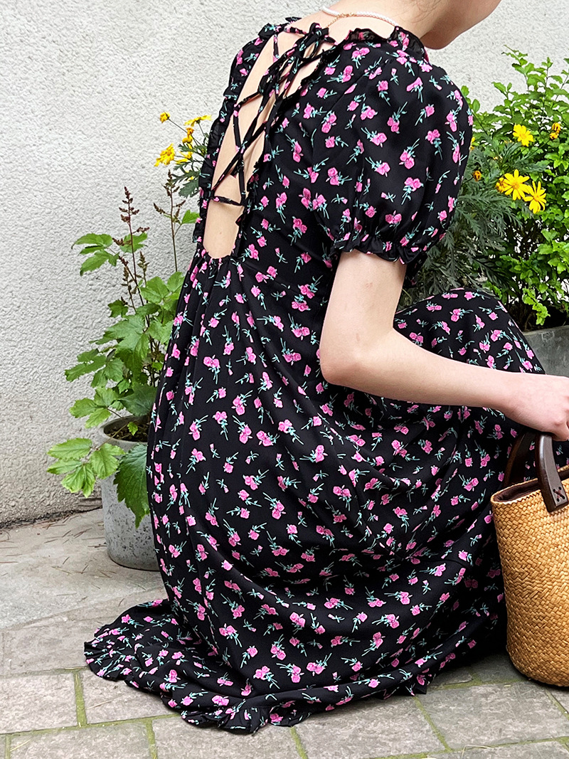 鹿西 后背镂空绑带碎花连衣裙法式气质V领木耳边露背茶歇裙子8757