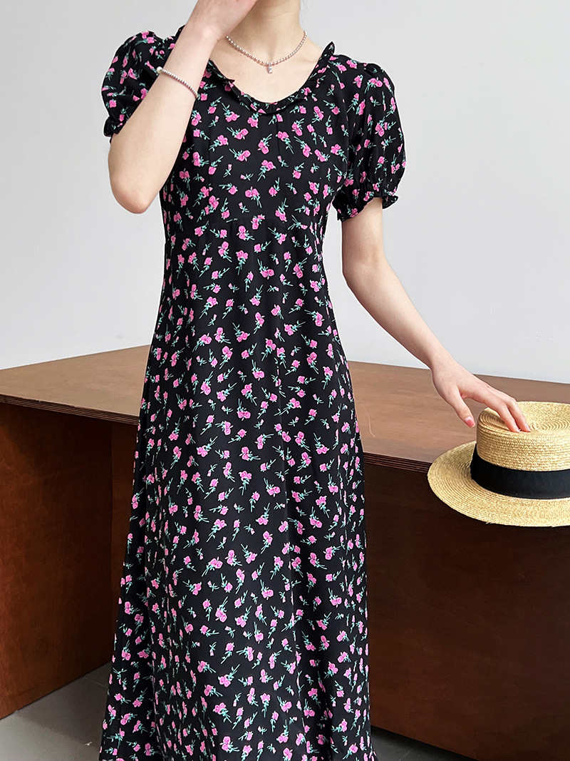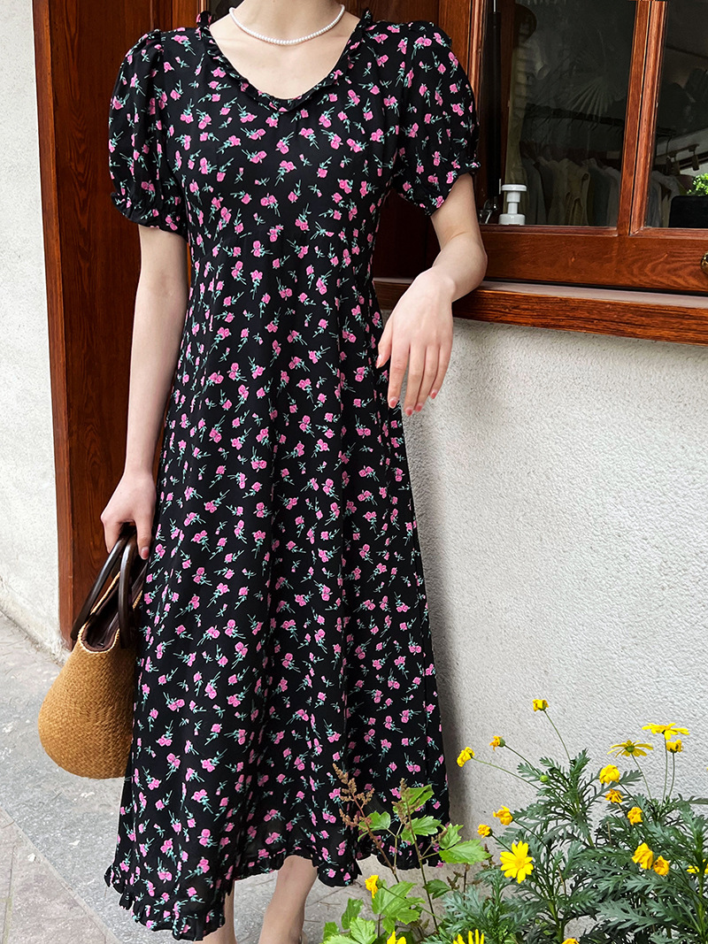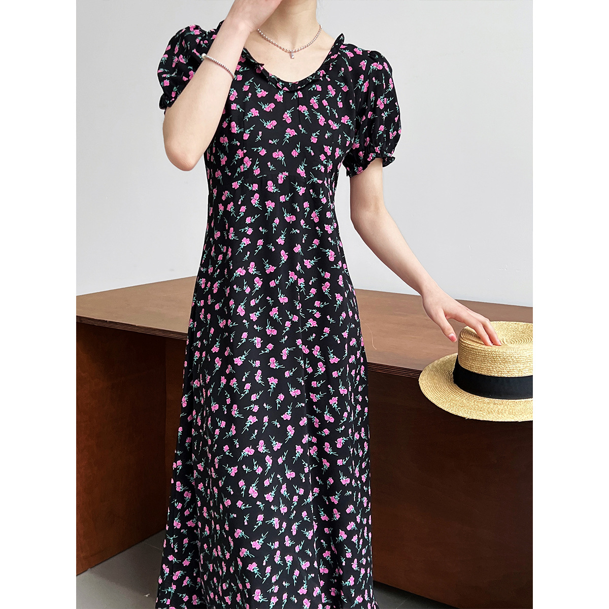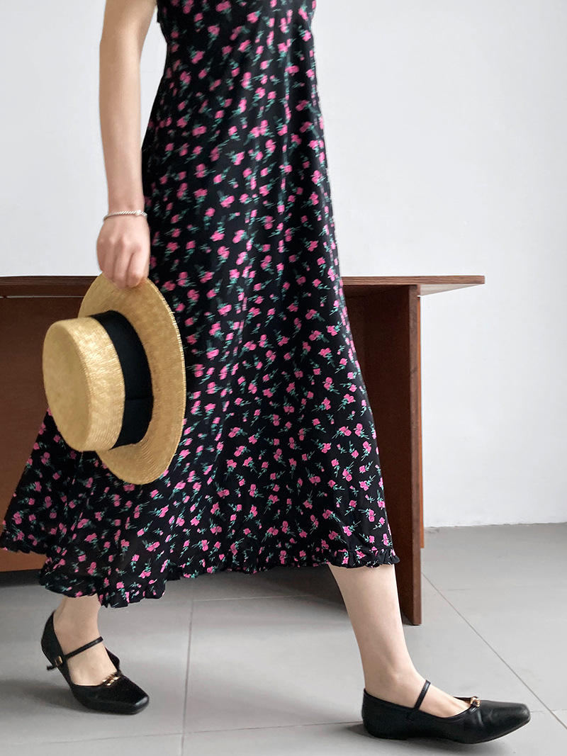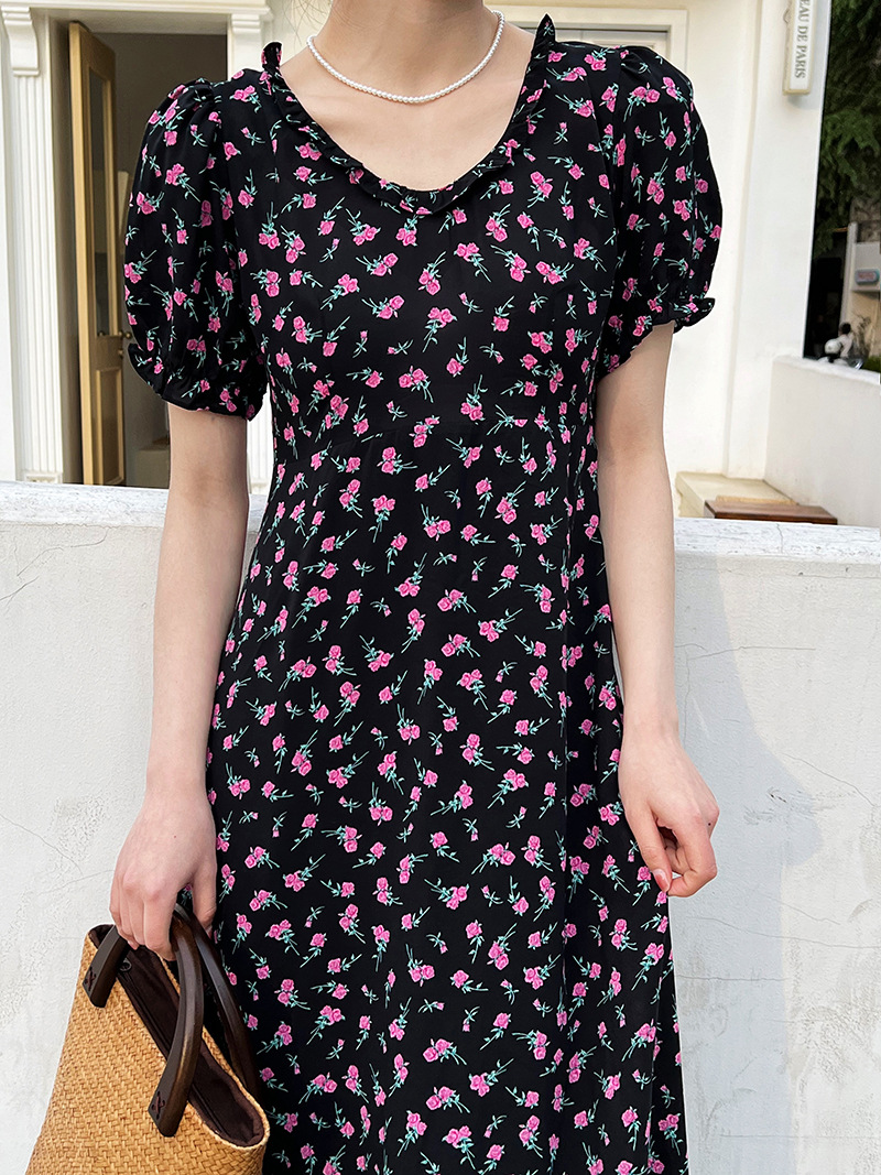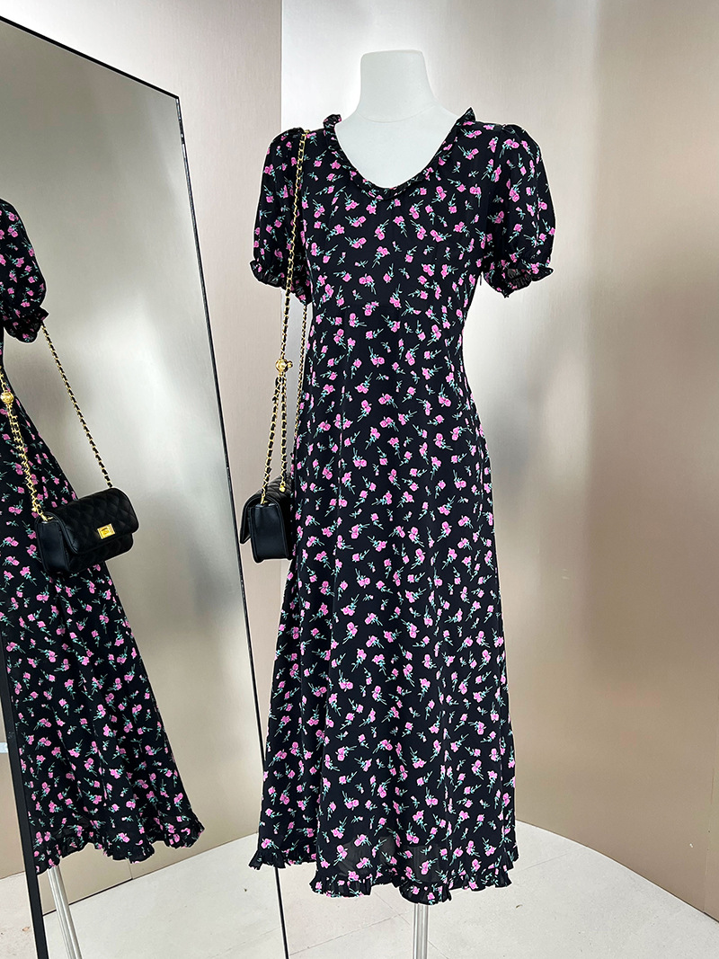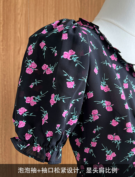 鹿西 后背镂空绑带碎花连衣裙法式气质V领木耳边露背茶歇裙子8757