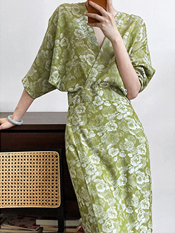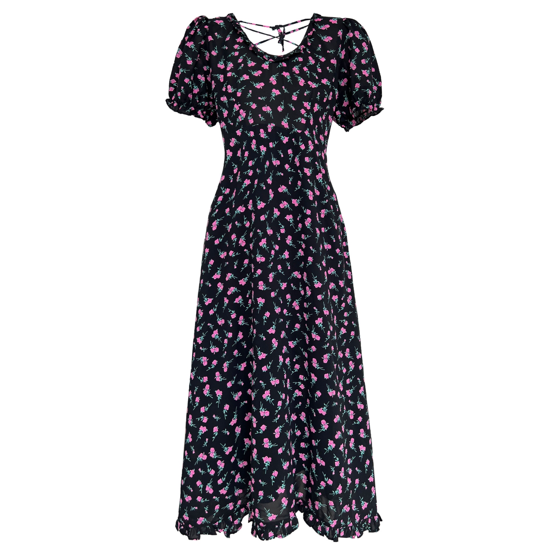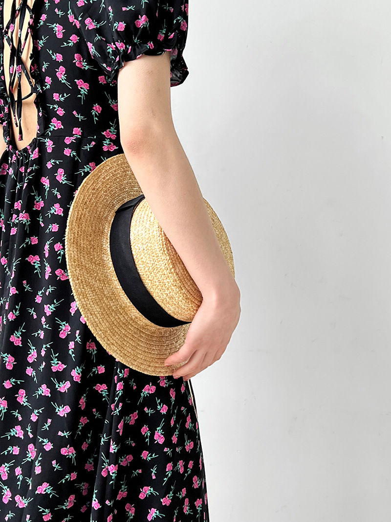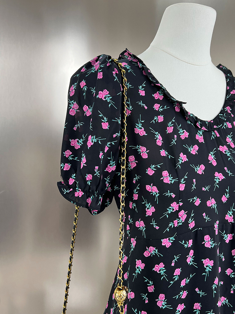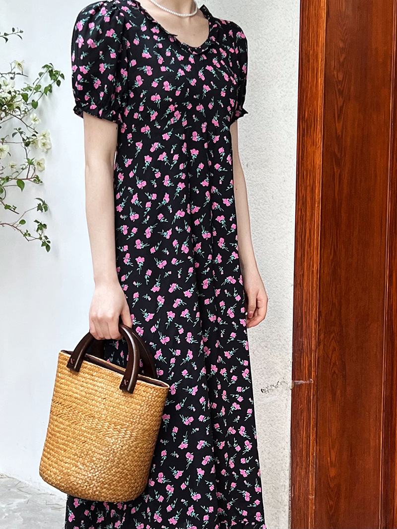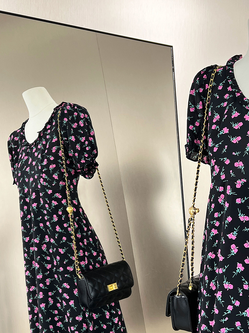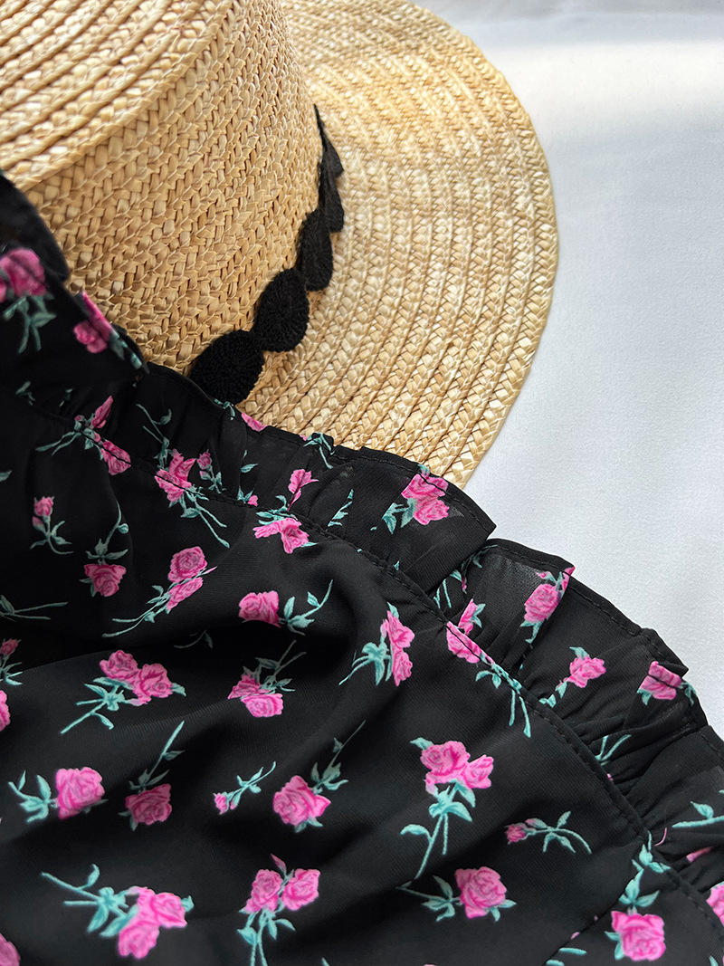 鹿西 后背镂空绑带碎花连衣裙法式气质V领木耳边露背茶歇裙子8757