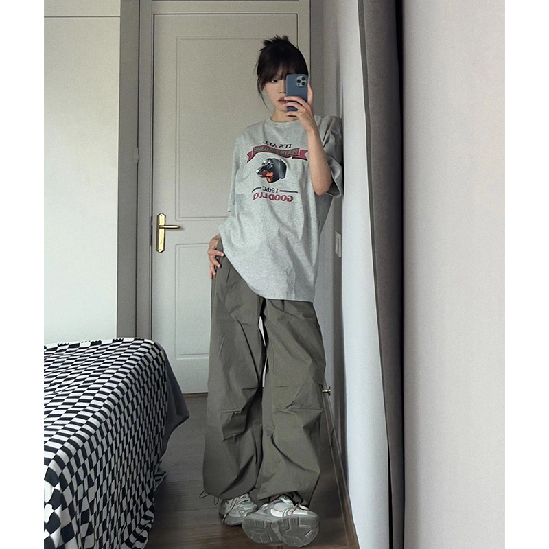 灰綠色速乾美式高街工裝褲寬鬆運動褲女男高腰顯瘦闊腿褲子秋潮牌