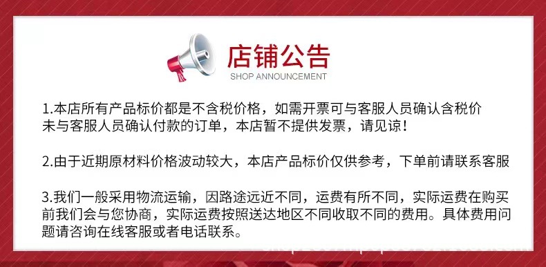 描述: 开票详情咨询客服!不能保证每个客户收到的包裹一点一点磕碰都没有,接受不了直接拒收,签收了视为接受,之后再因为这个退货退款这边不承担运费,个别地区是需要补运费的,自主下单的客服联系补运费无果不给予发货,谢谢配合!