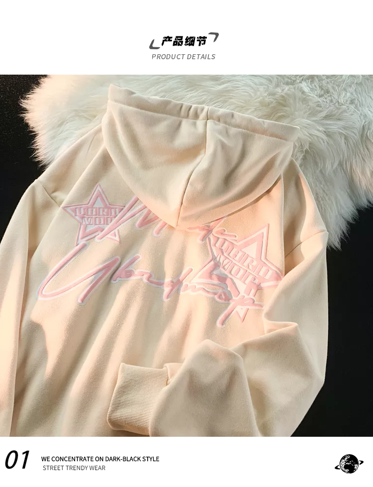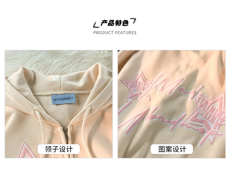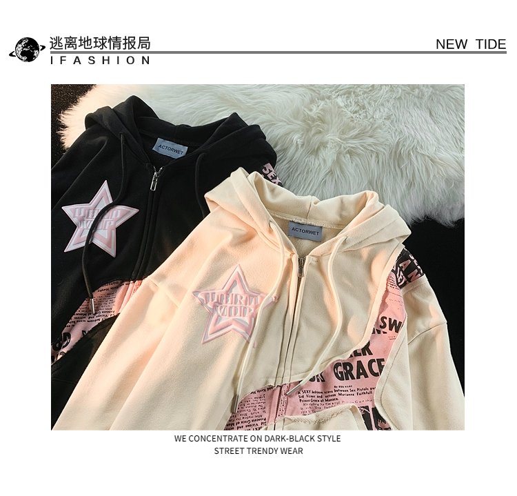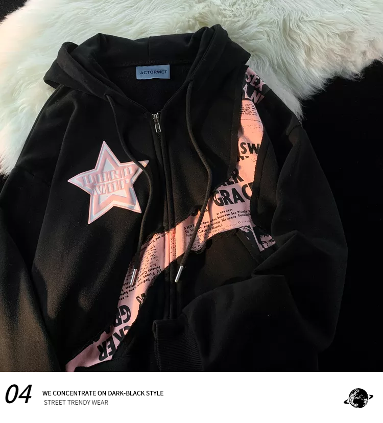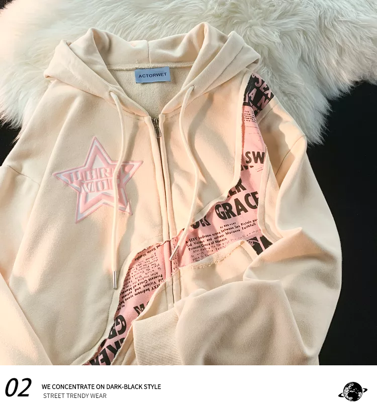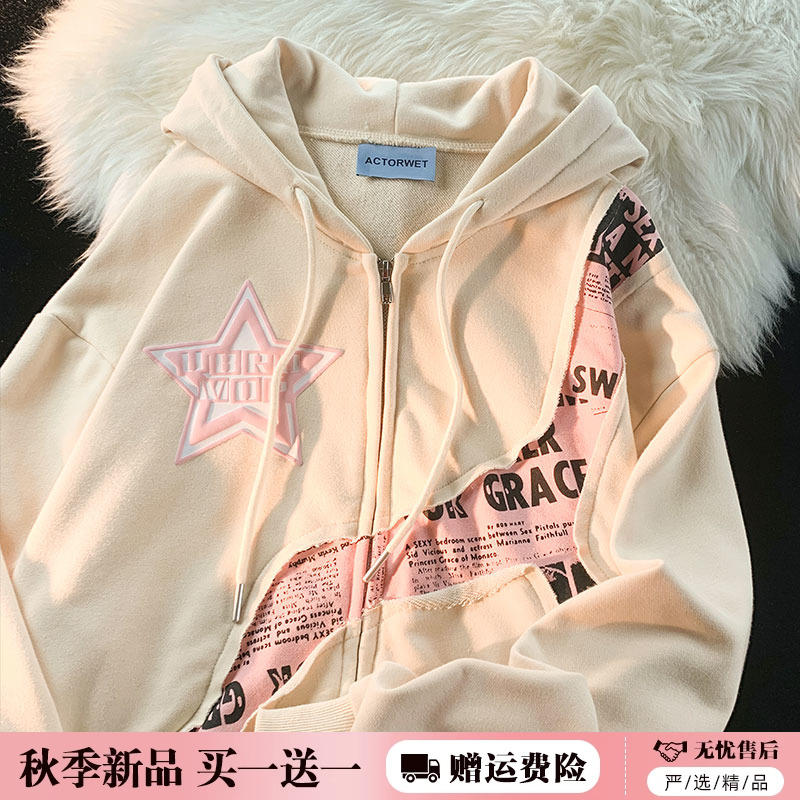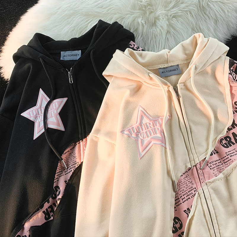 逃離地球美式炸街星星字母印花拼接開衫厚棉T女潮牌甜酷風寬鬆外套