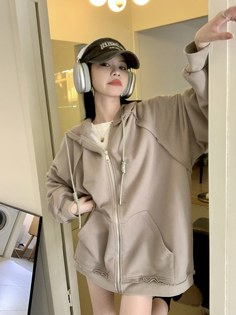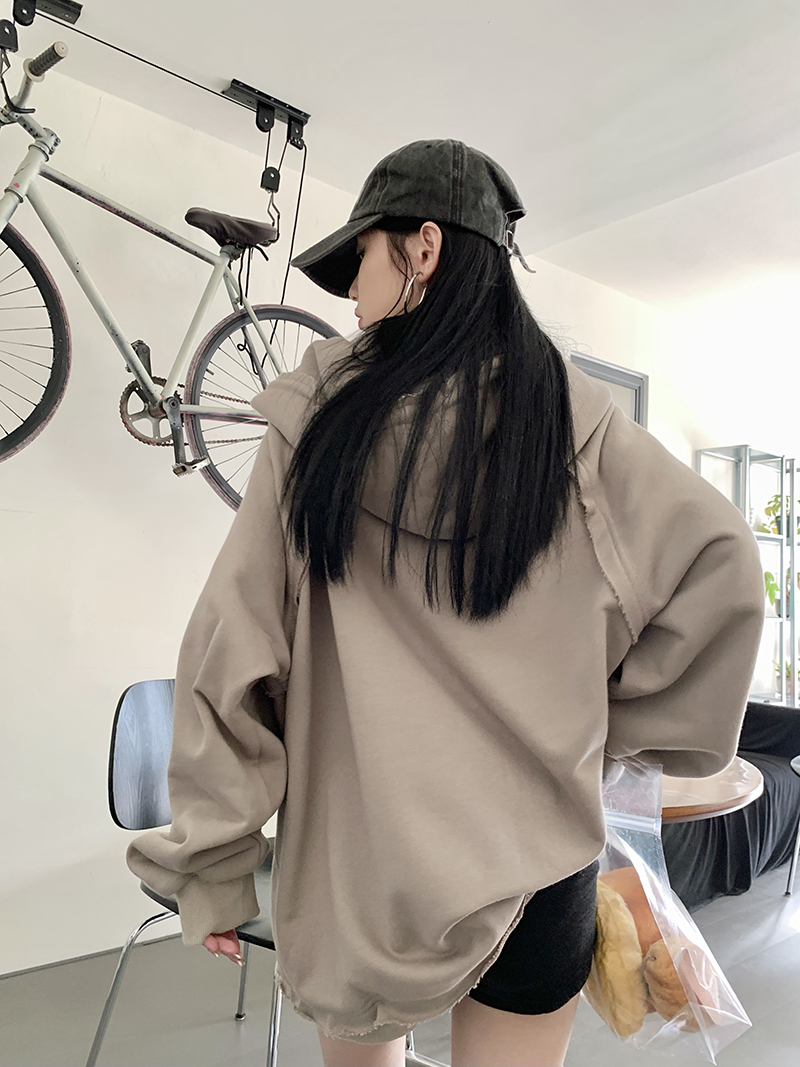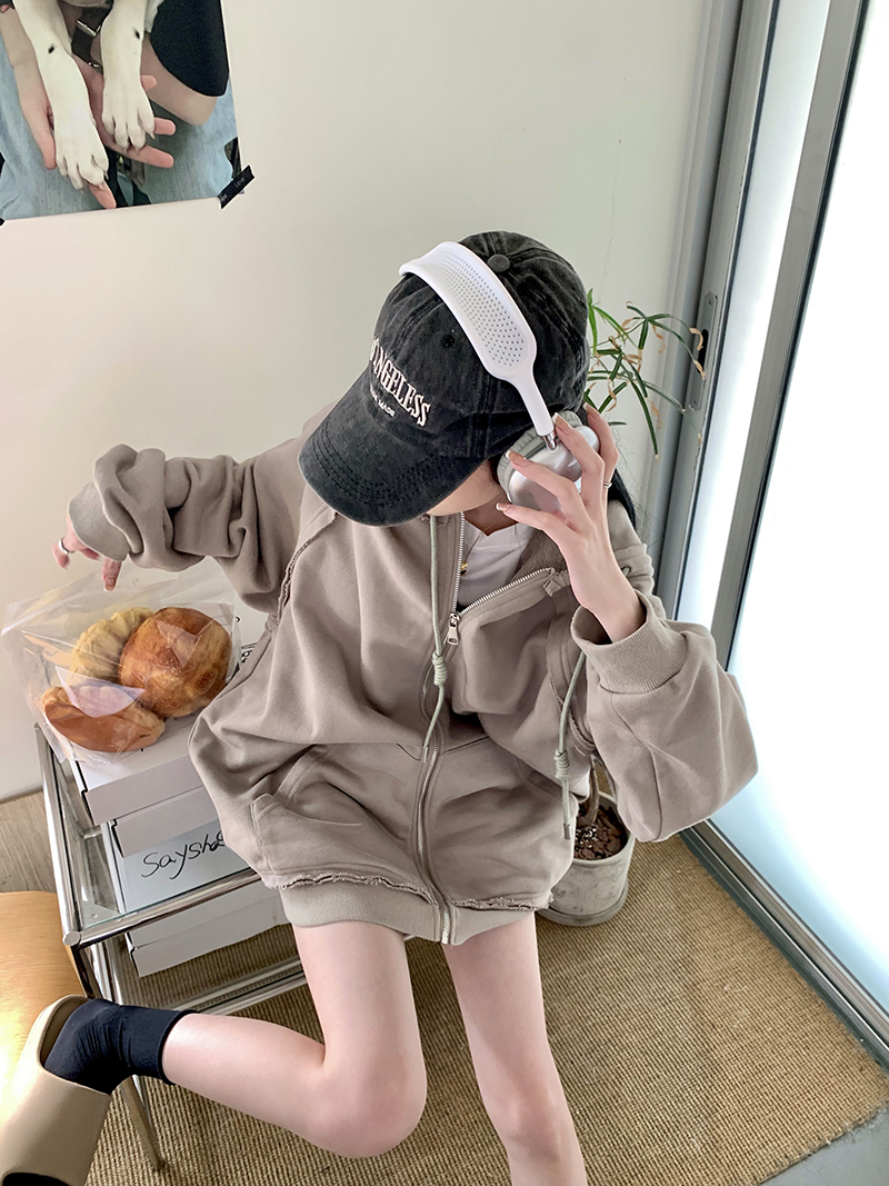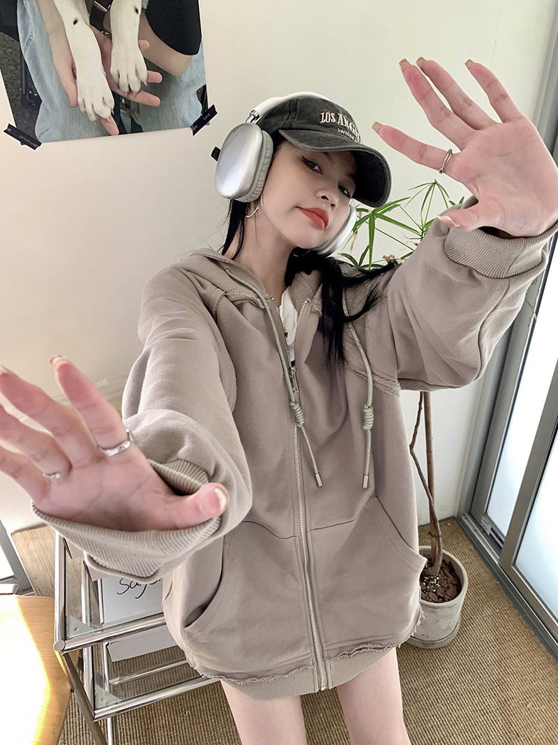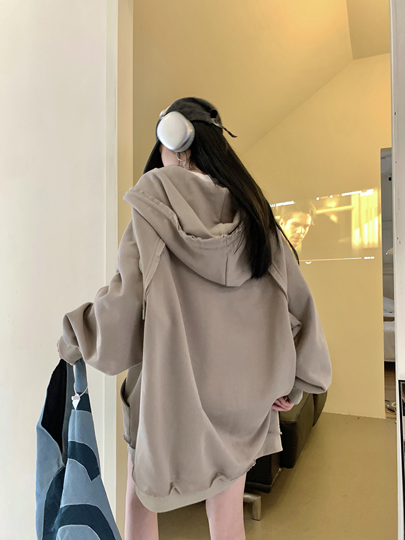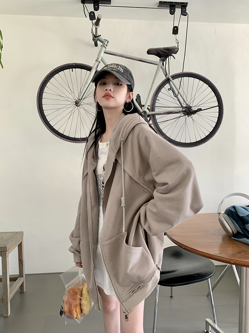 200斤胖妹妹春秋ins毛邊破洞連帽長袖厚棉T冪式穿搭大尺碼學生外套女
