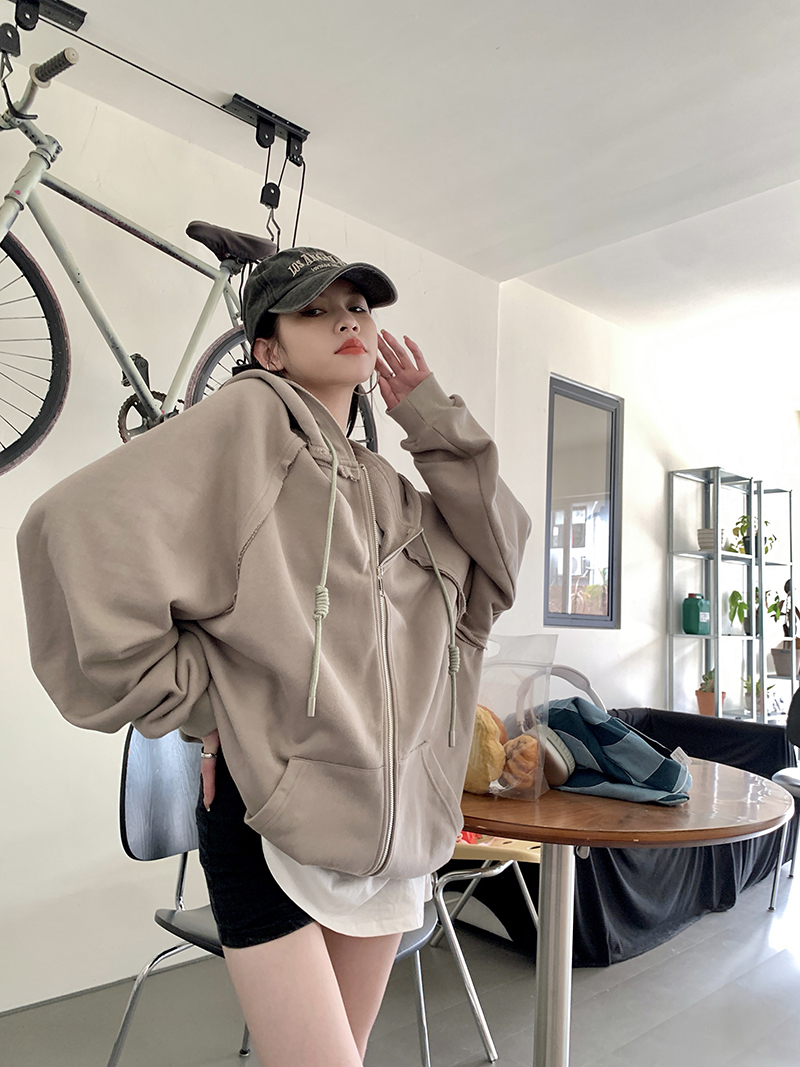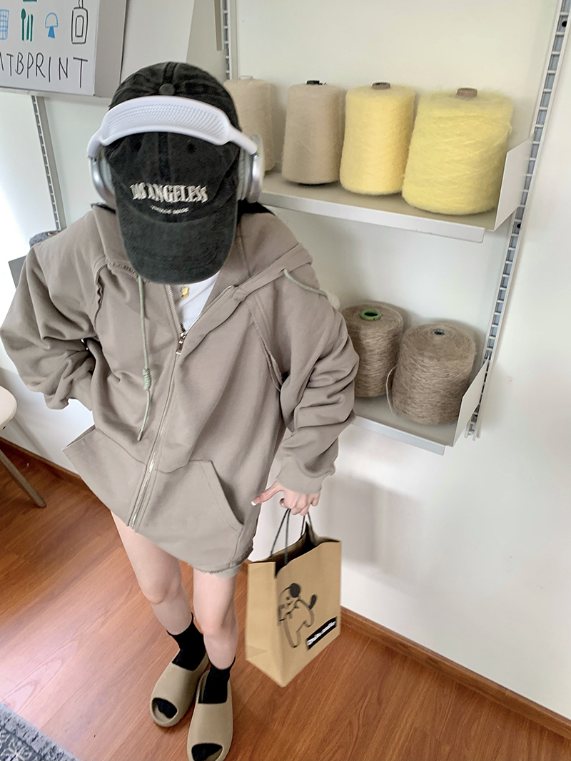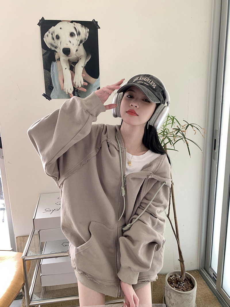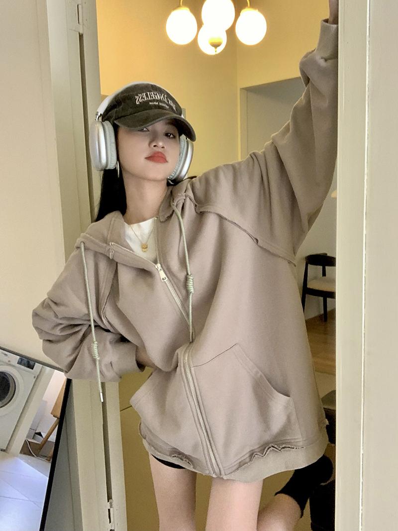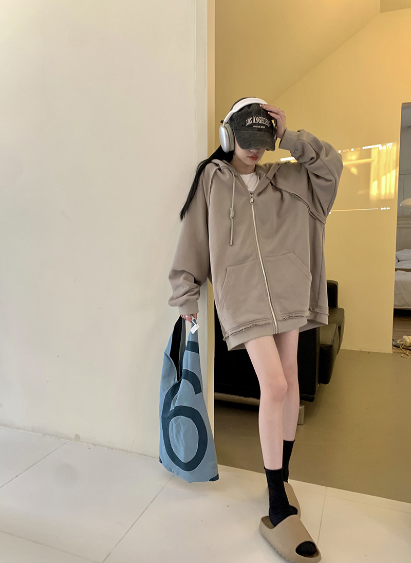 200斤胖妹妹春秋ins毛邊破洞連帽長袖厚棉T冪式穿搭大尺碼學生外套女