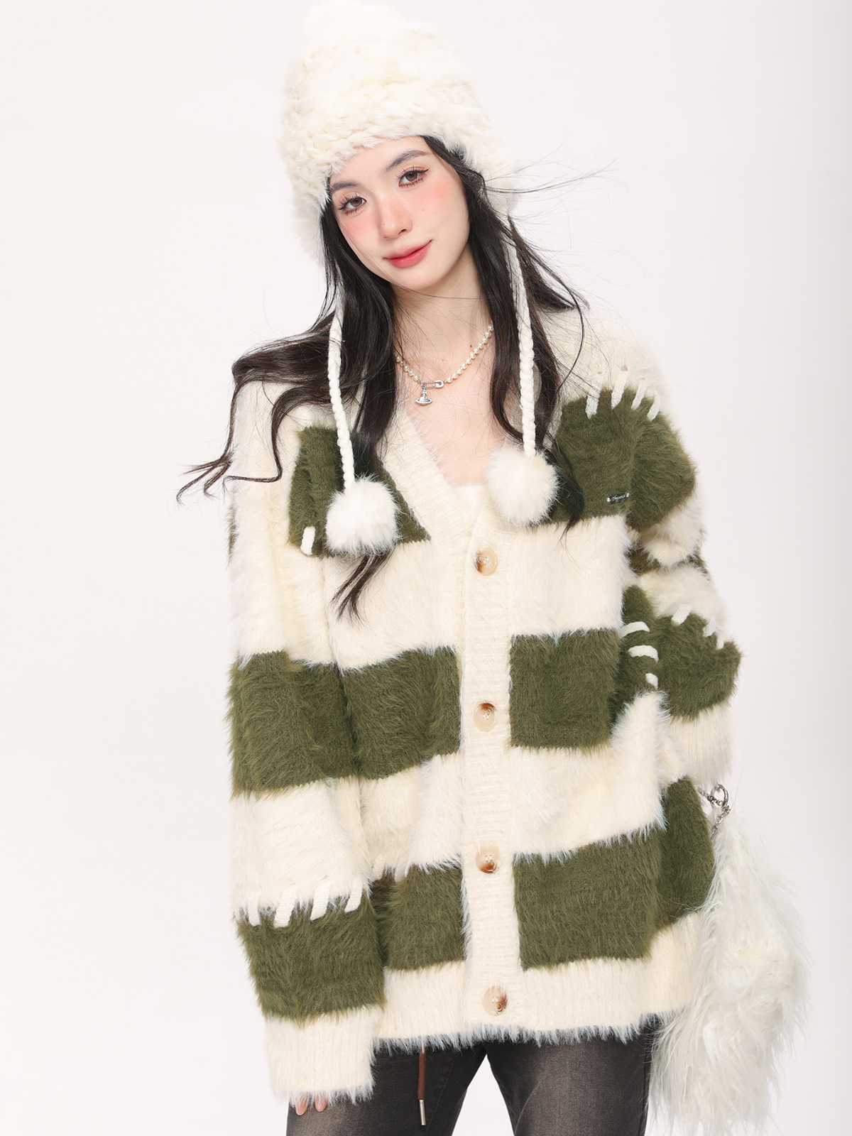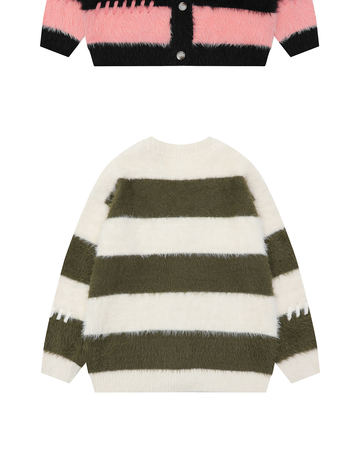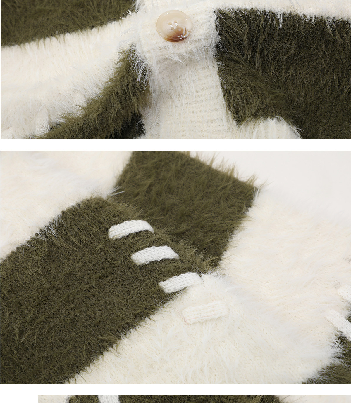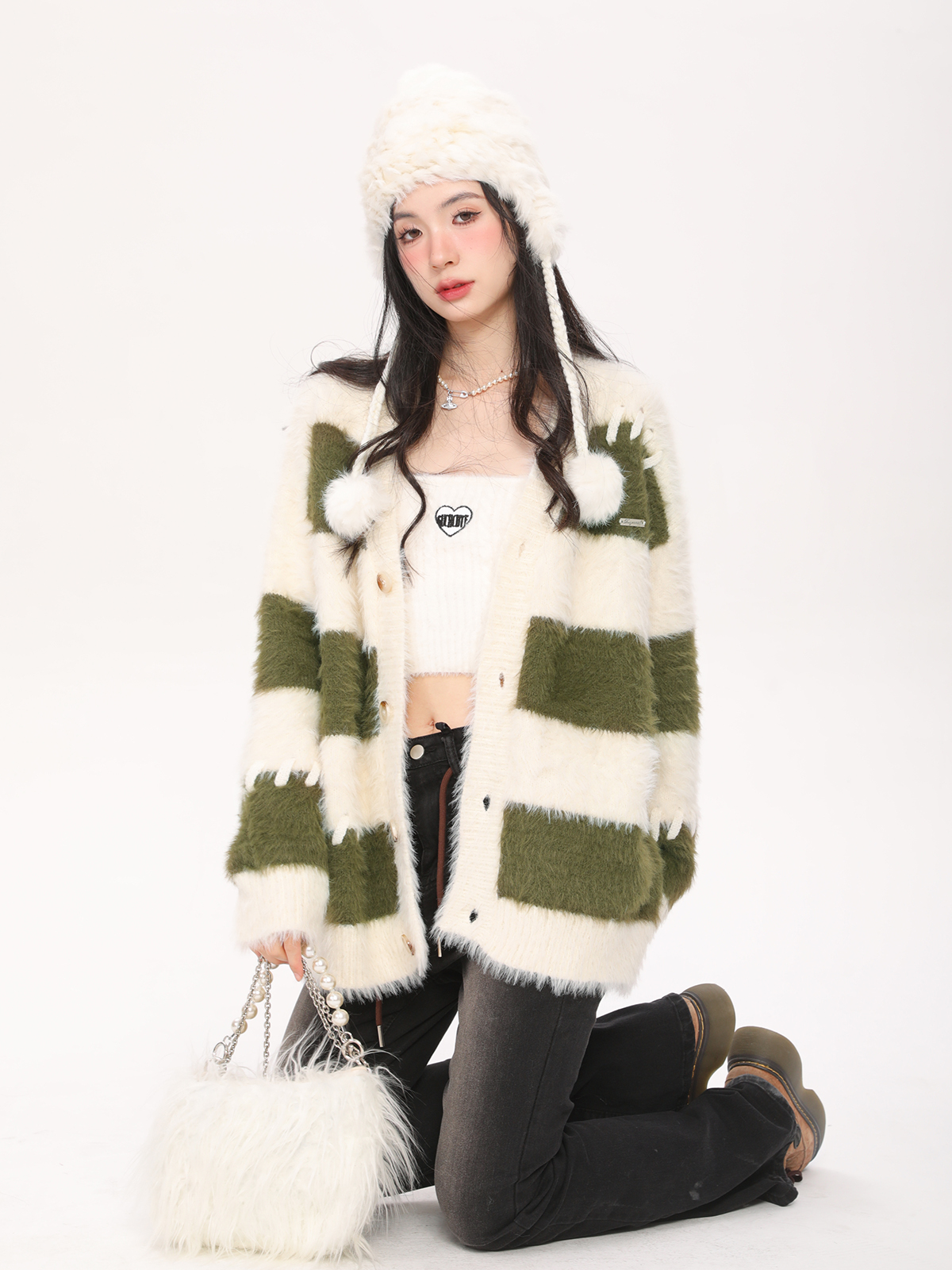 AONW國潮條紋開襟外套毛衣女韓版慵懶風仿水貂毛撞色軟糯針織衫外套