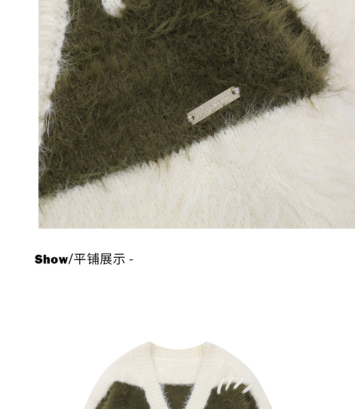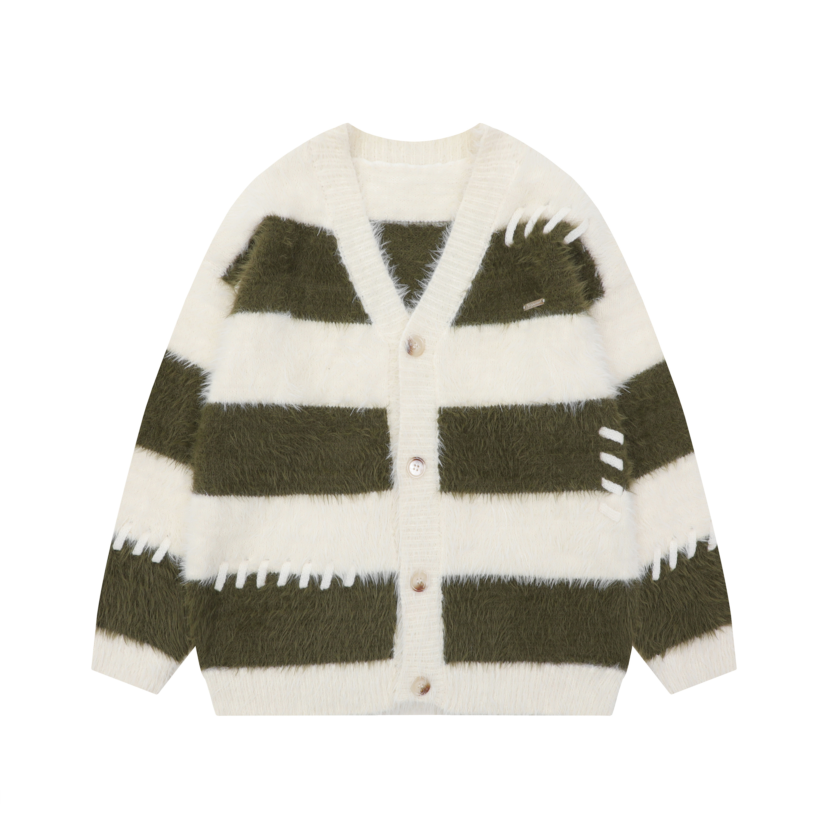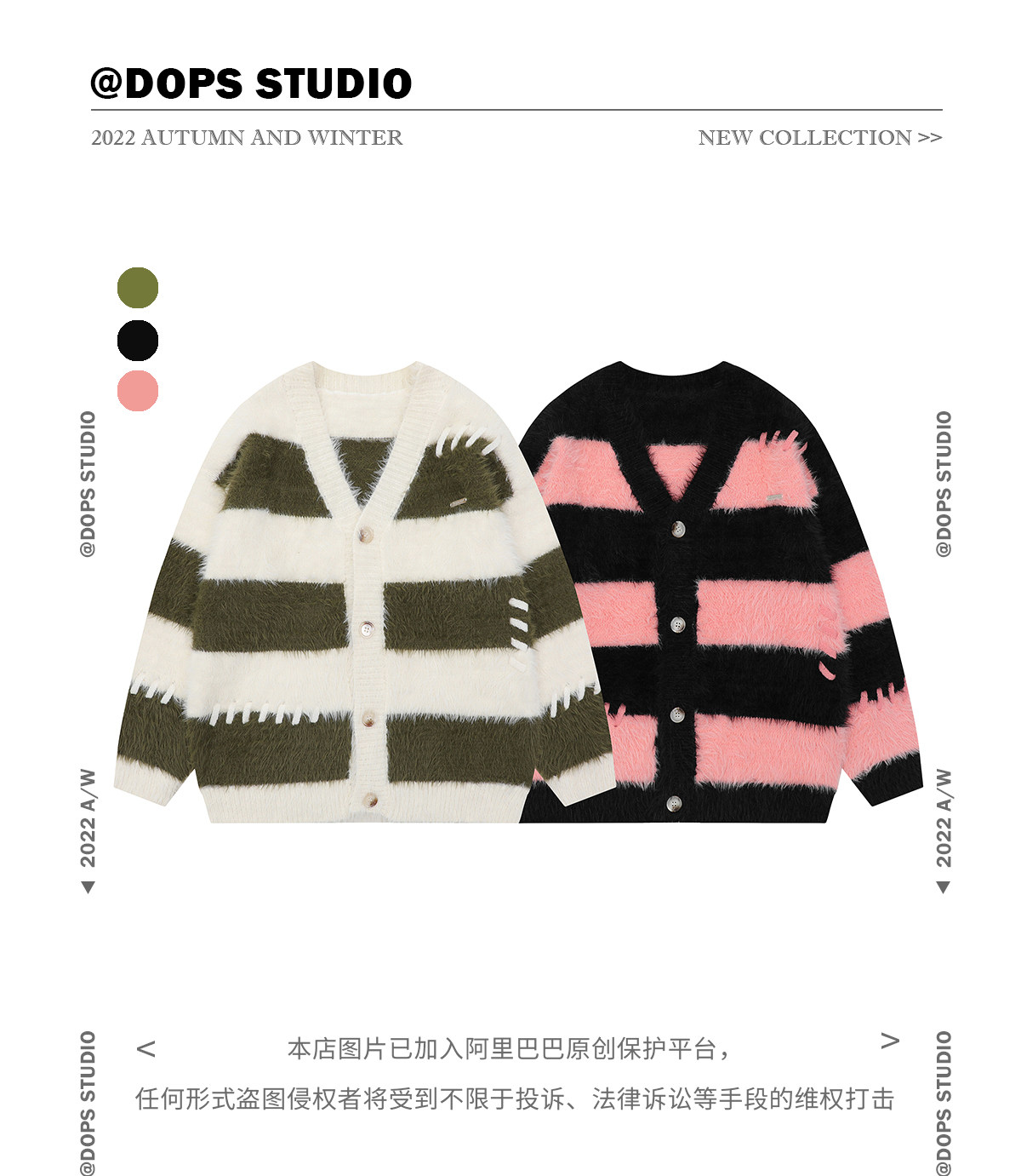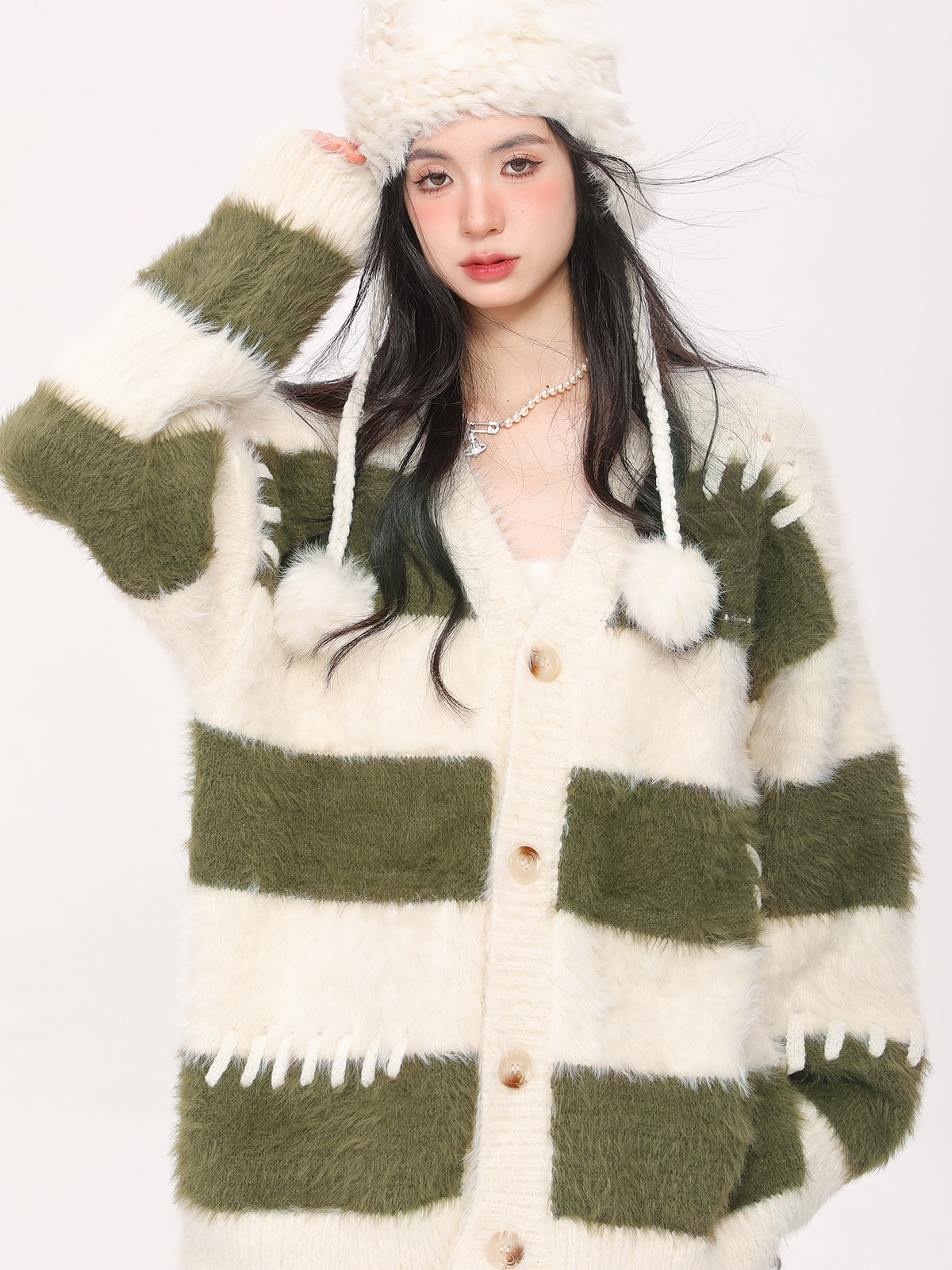 AONW國潮條紋開襟外套毛衣女韓版慵懶風仿水貂毛撞色軟糯針織衫外套