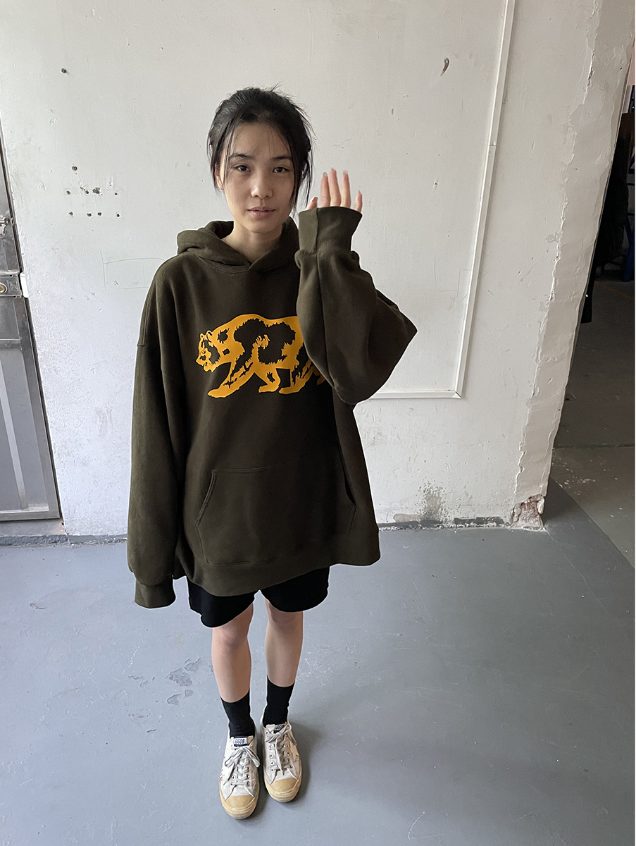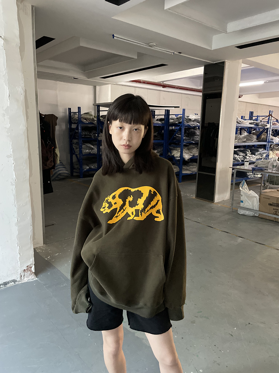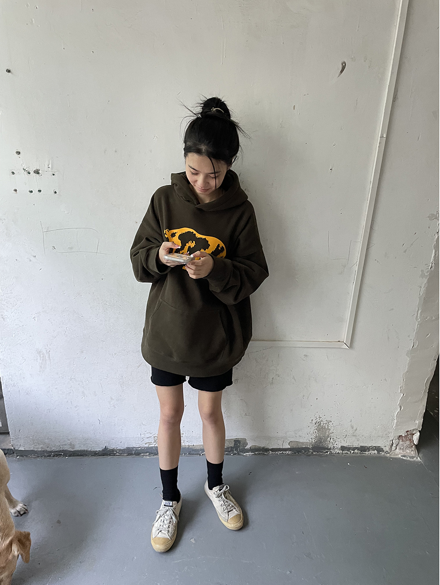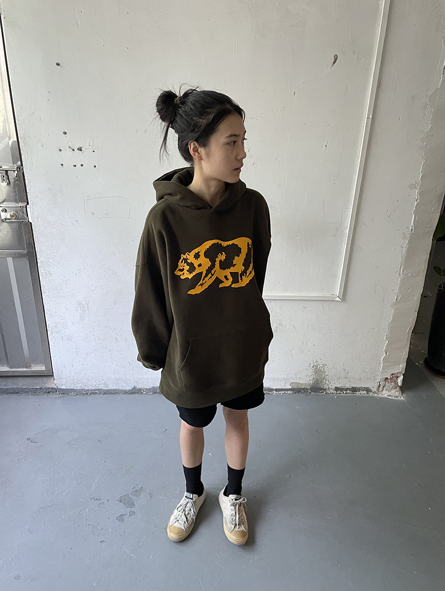 我睡著了 原創圖案 暗綠色寬鬆熊連帽運動衫 男女款