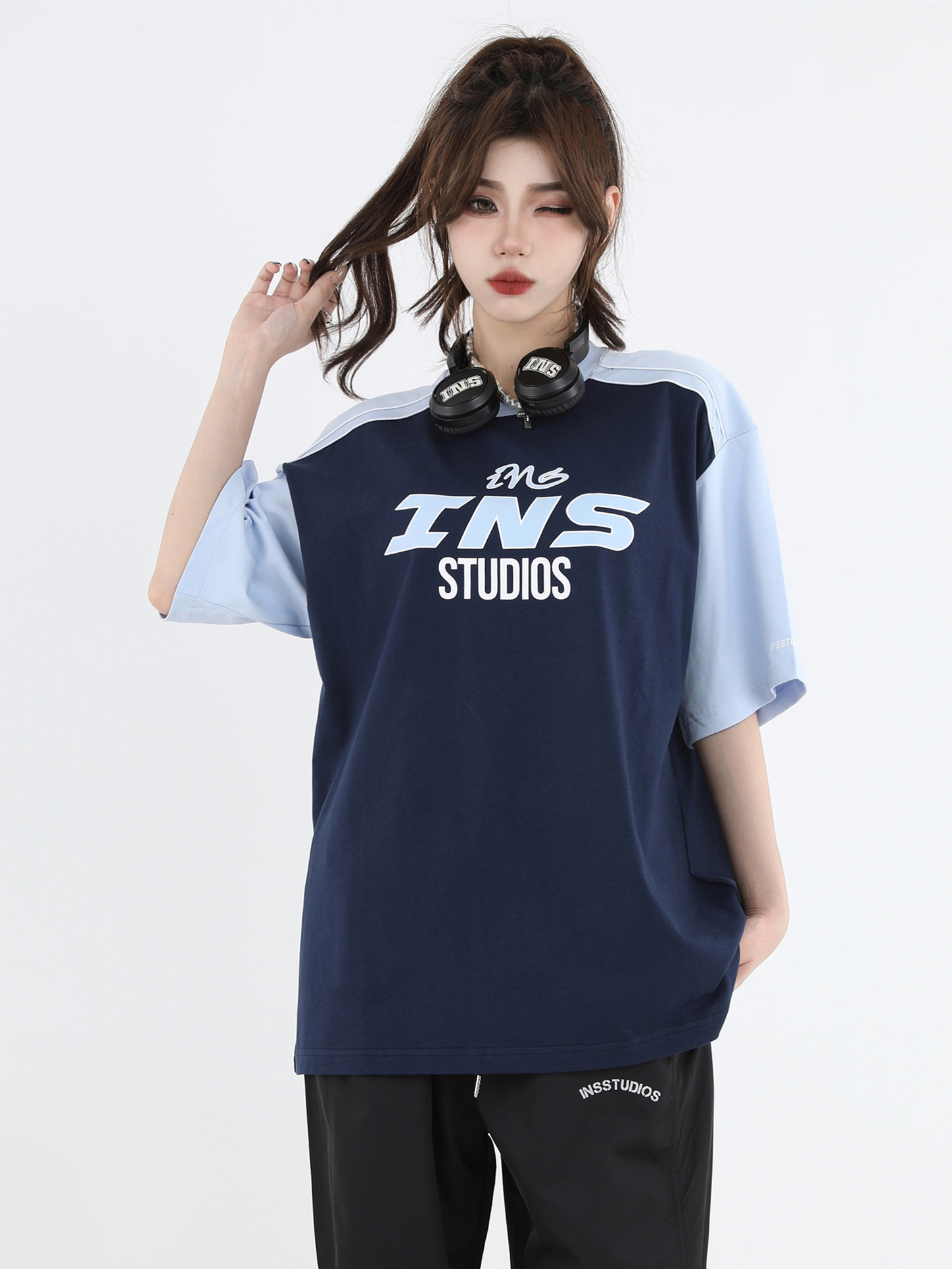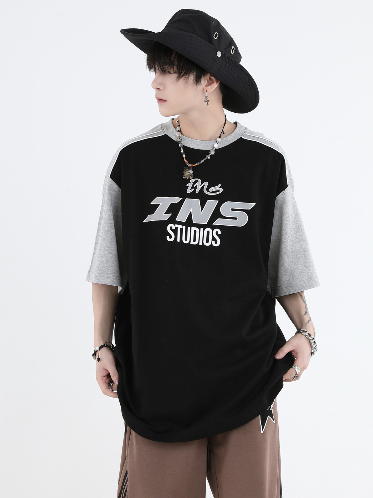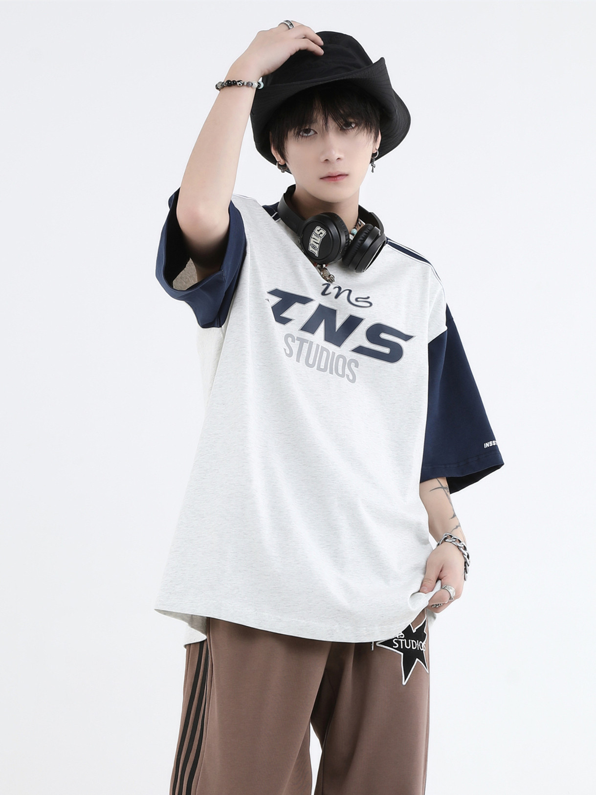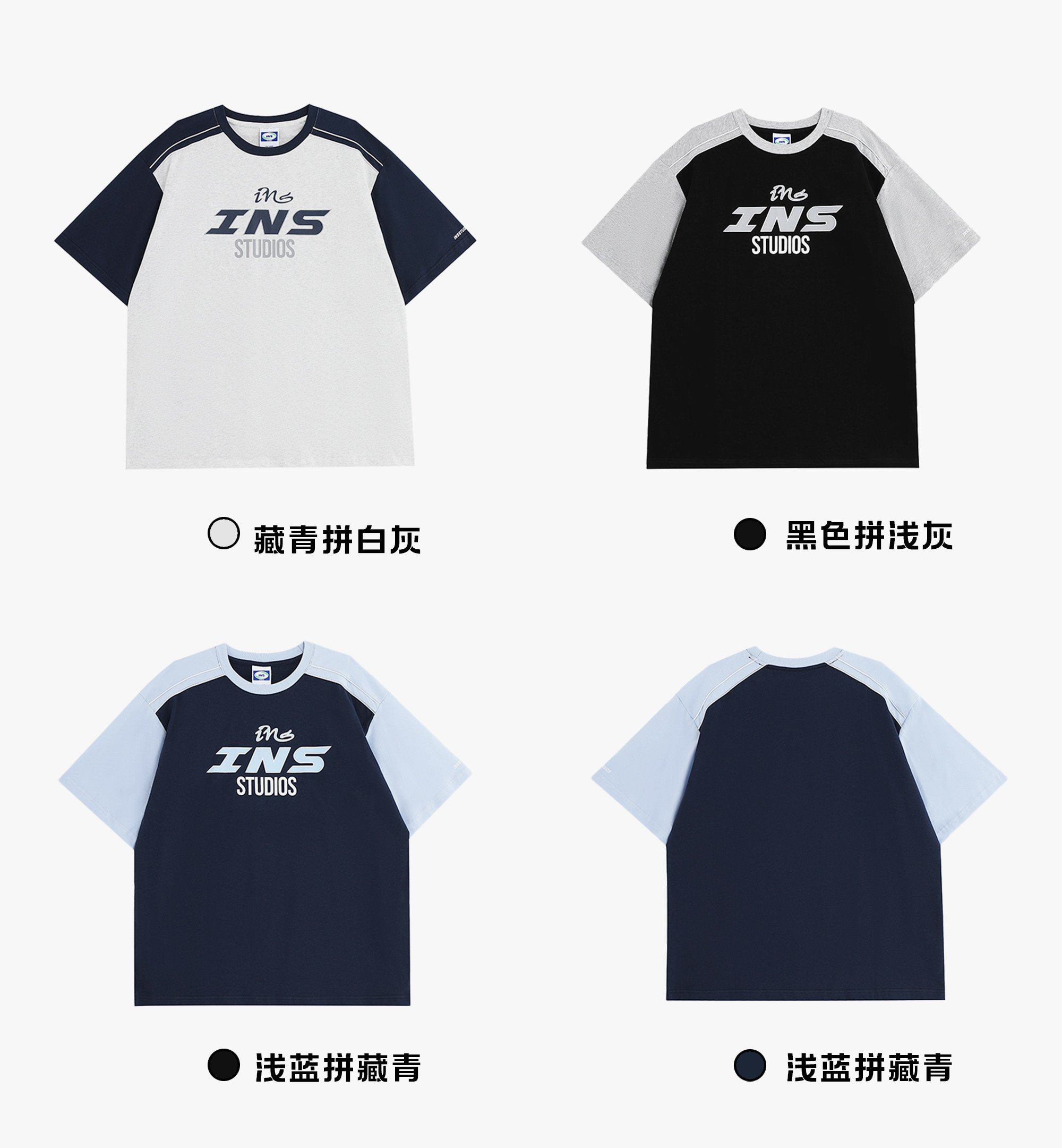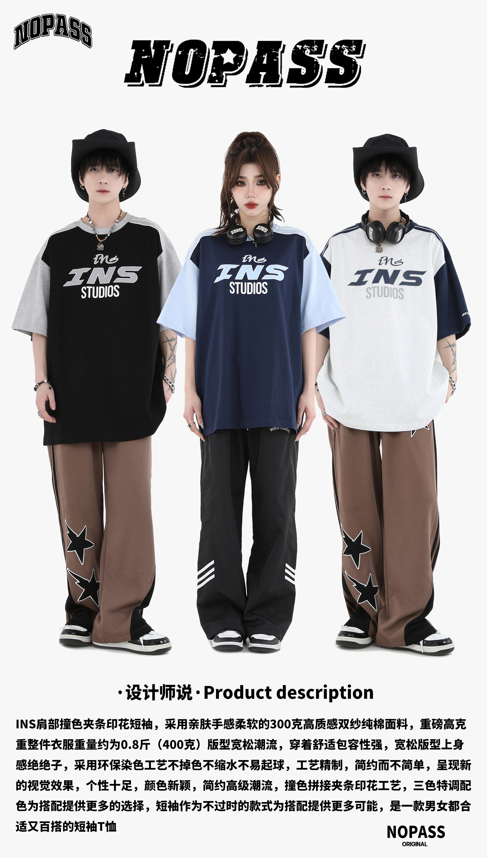 NOPASS 國潮牌情侶原創美式肩部撞色夾條印花短袖寬鬆半袖純棉T恤