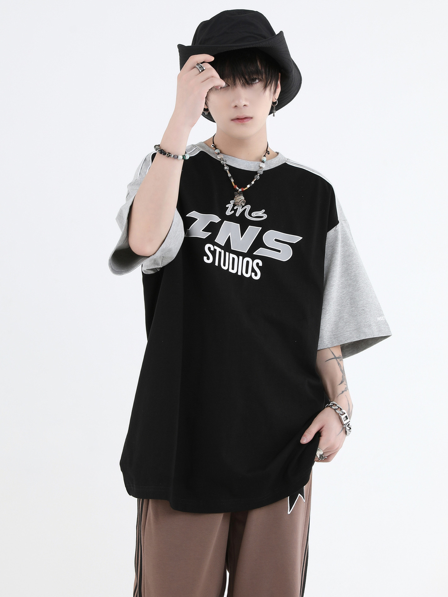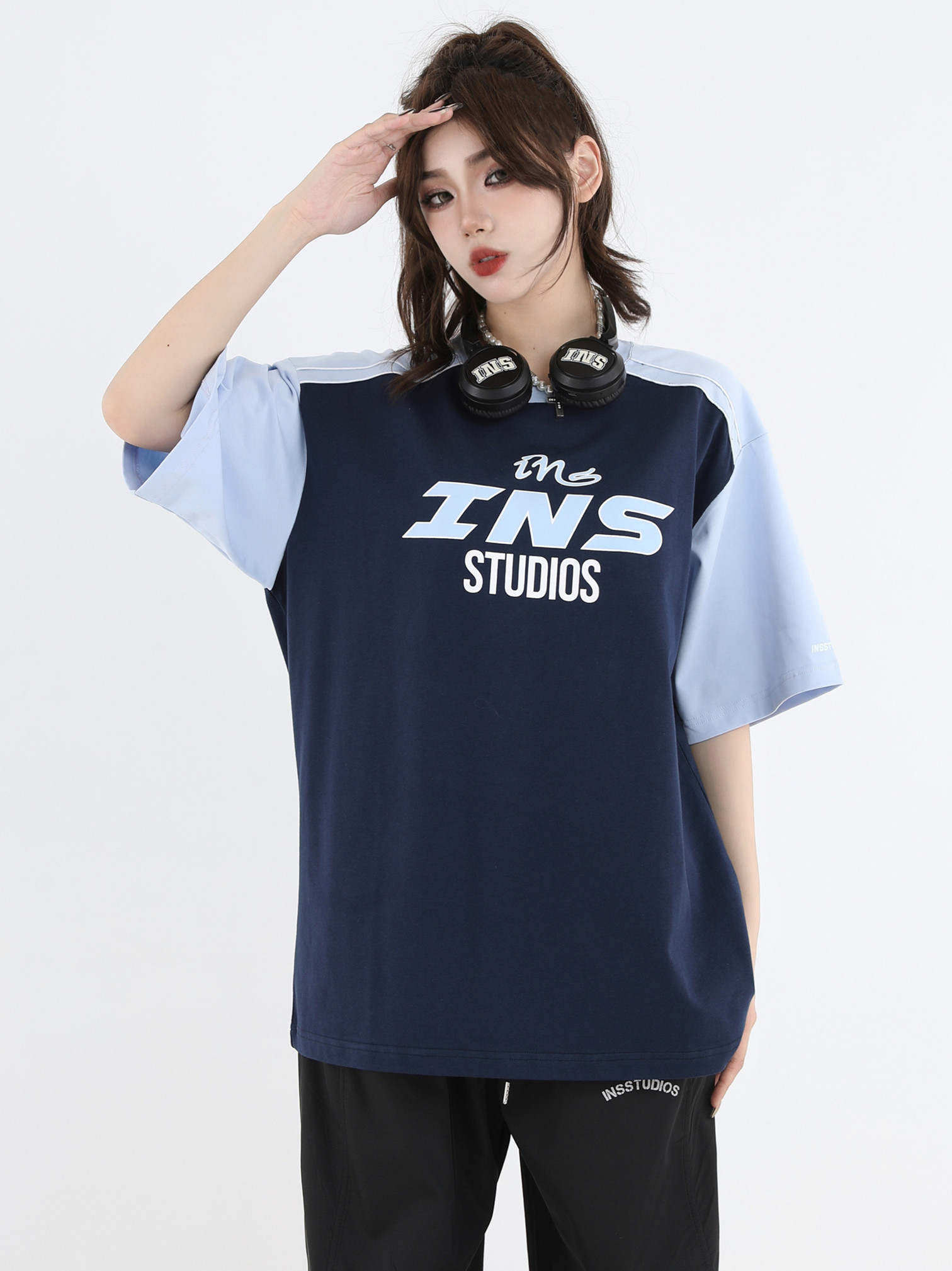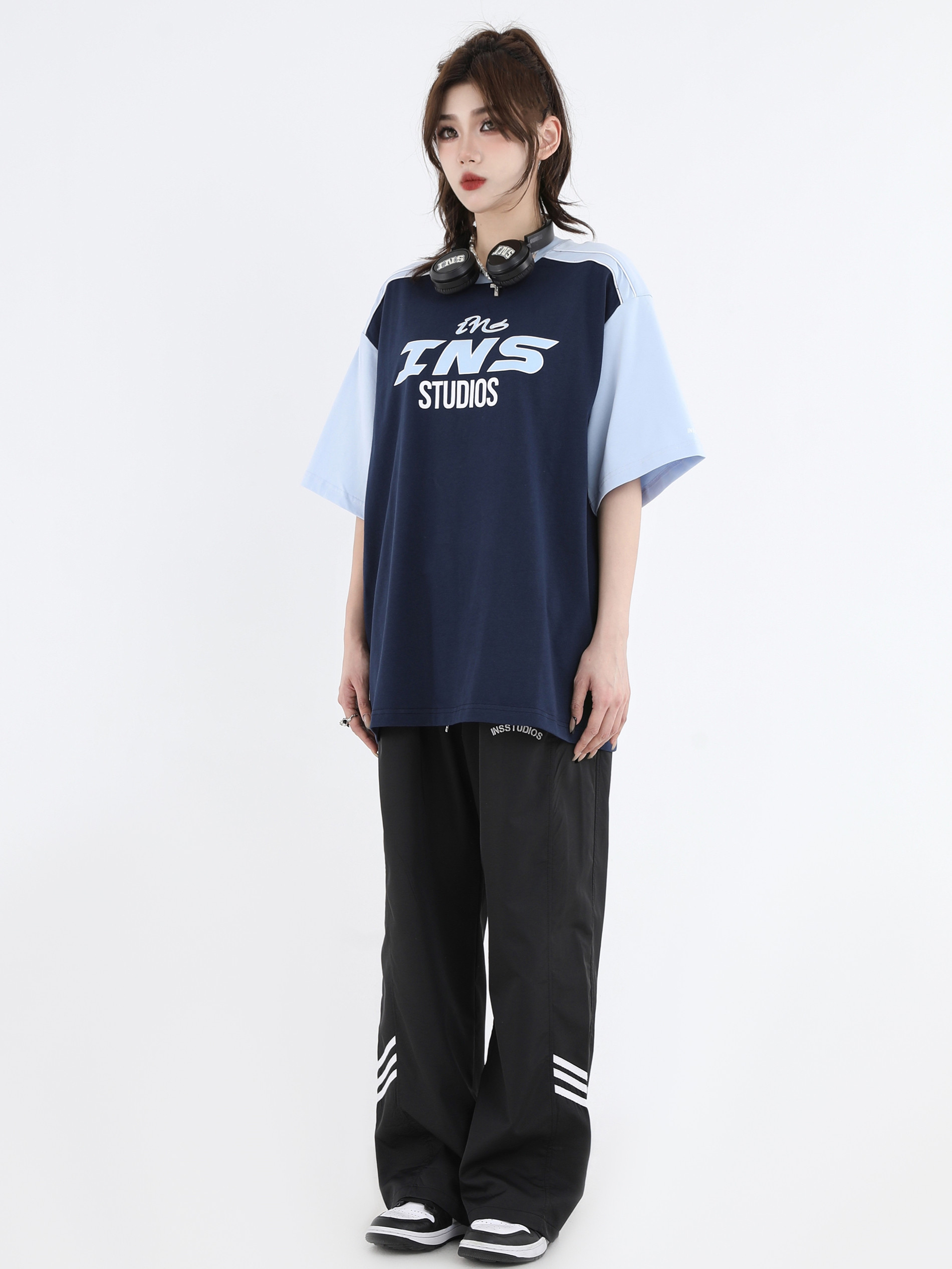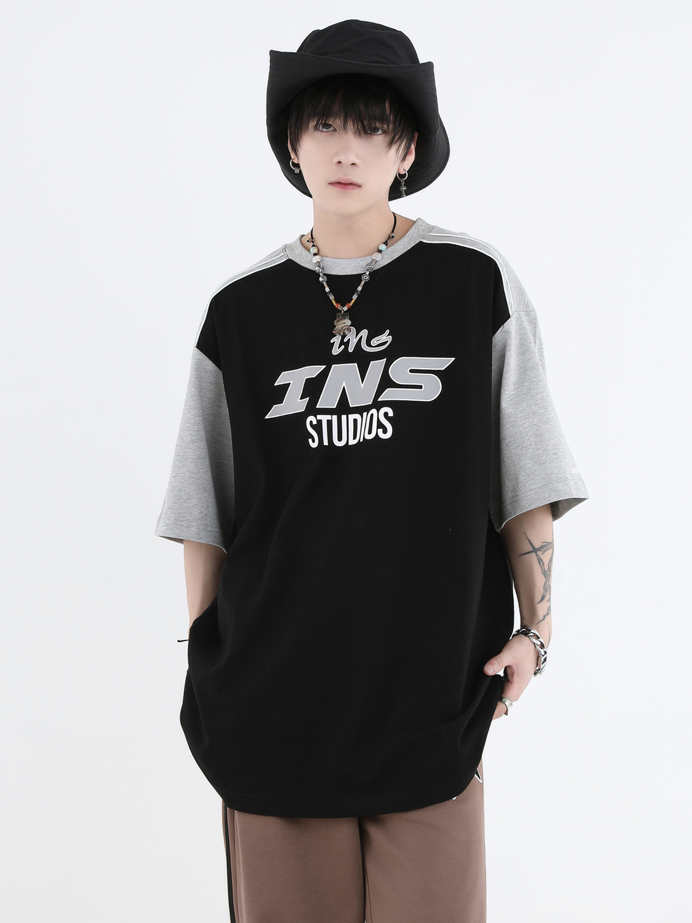 NOPASS 國潮牌情侶原創美式肩部撞色夾條印花短袖寬鬆半袖純棉T恤
