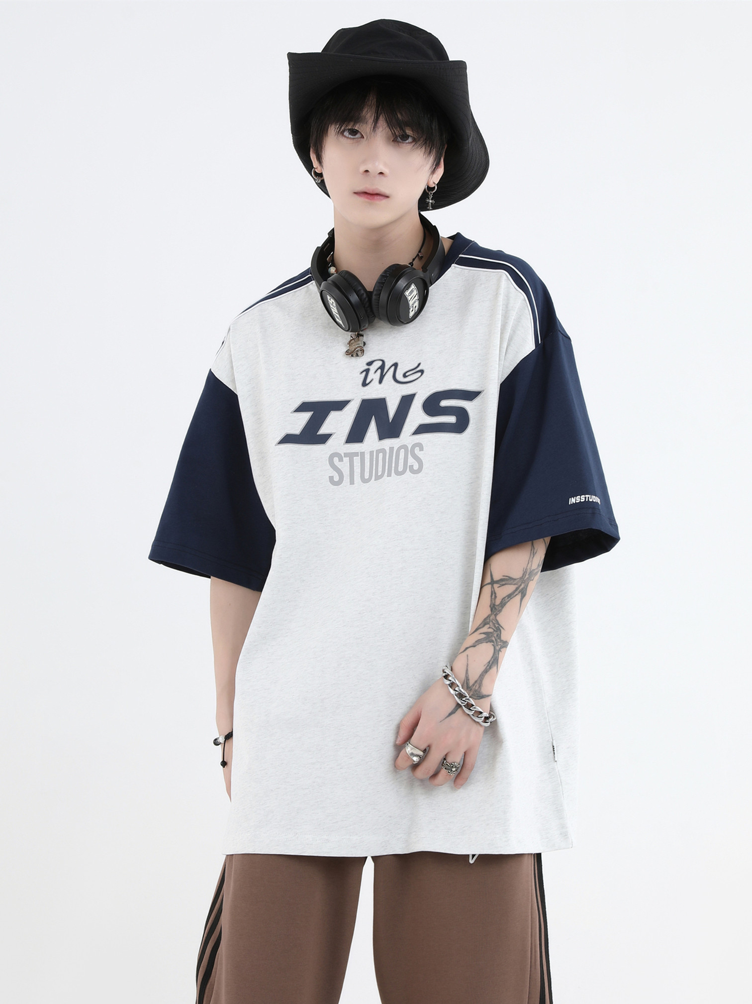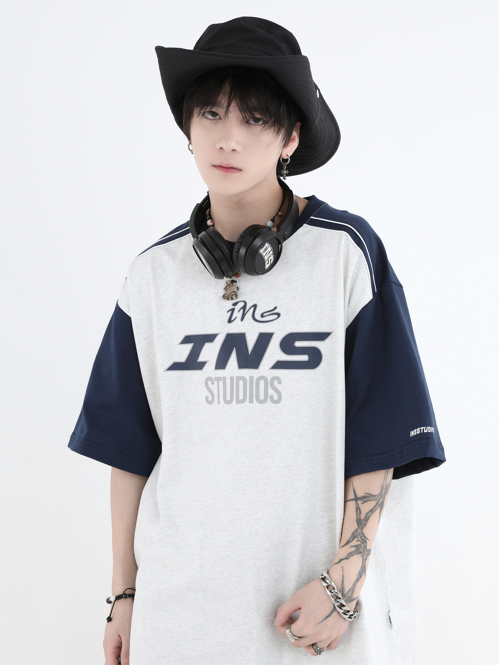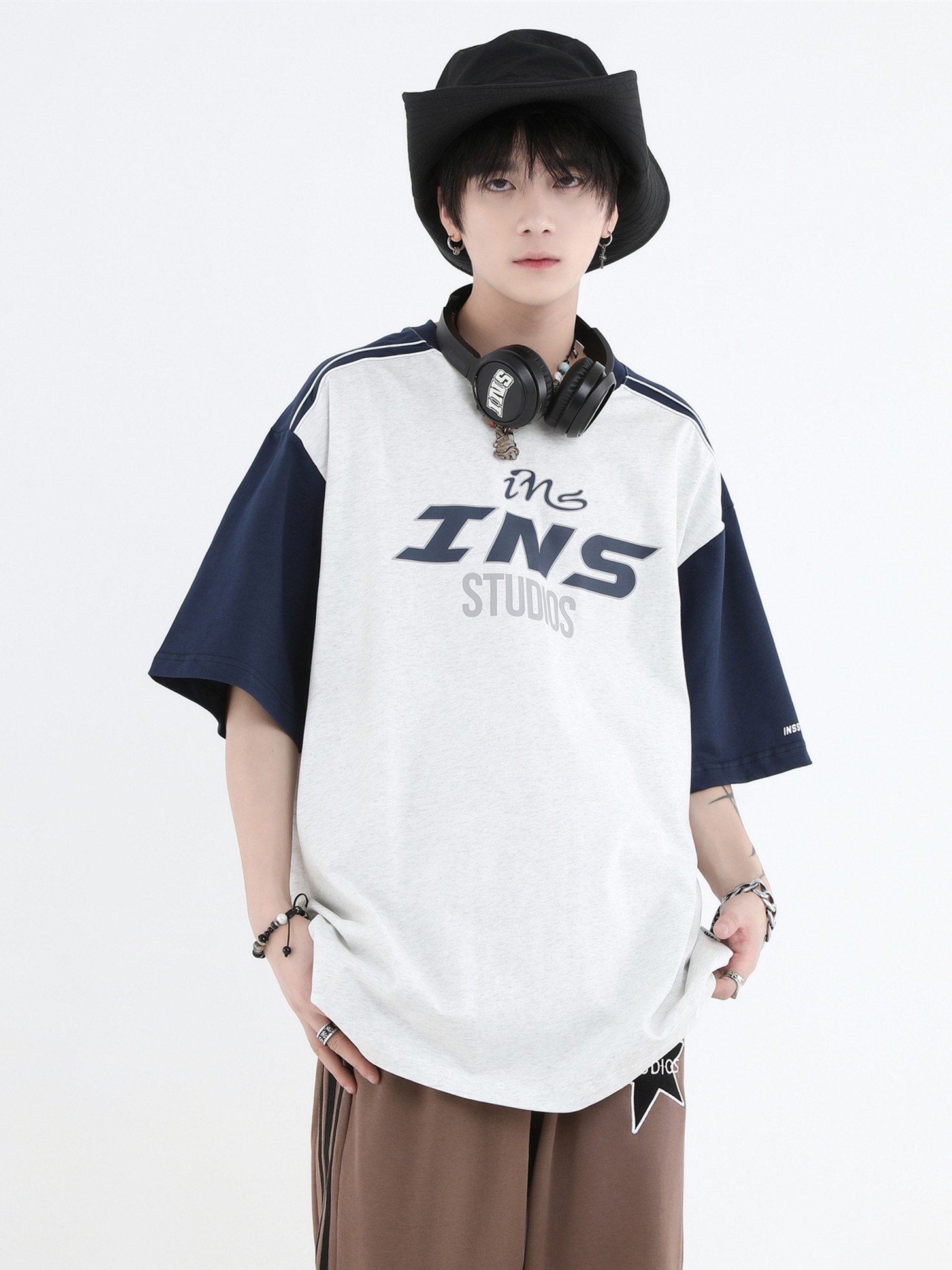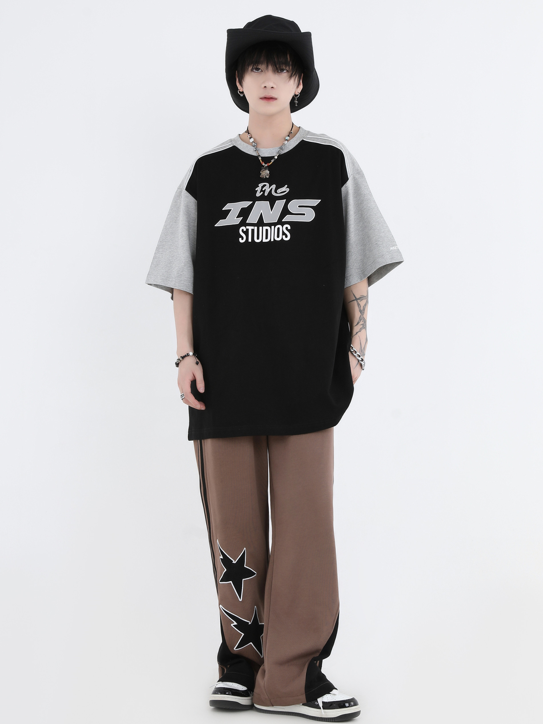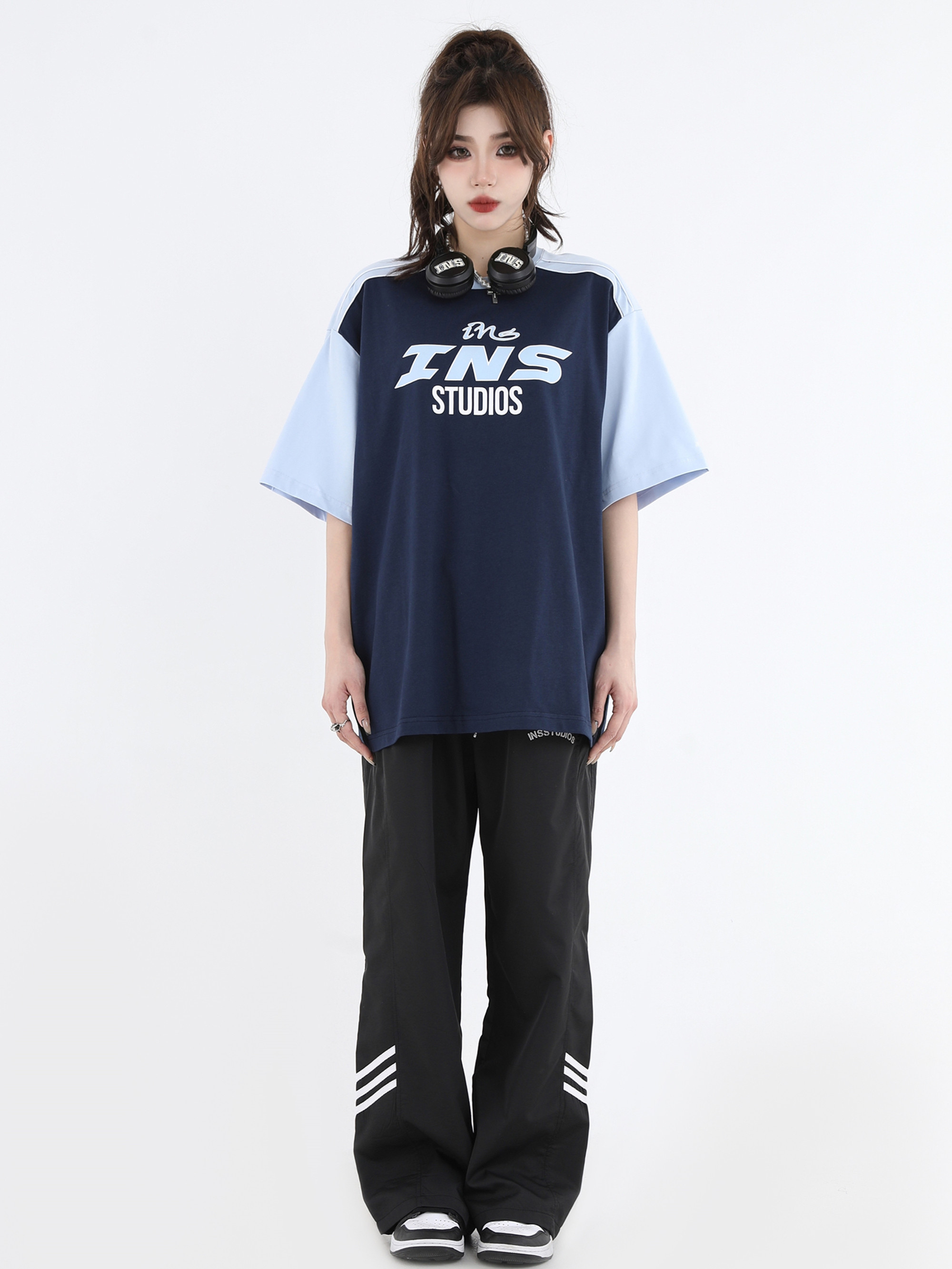 NOPASS 國潮牌情侶原創美式肩部撞色夾條印花短袖寬鬆半袖純棉T恤