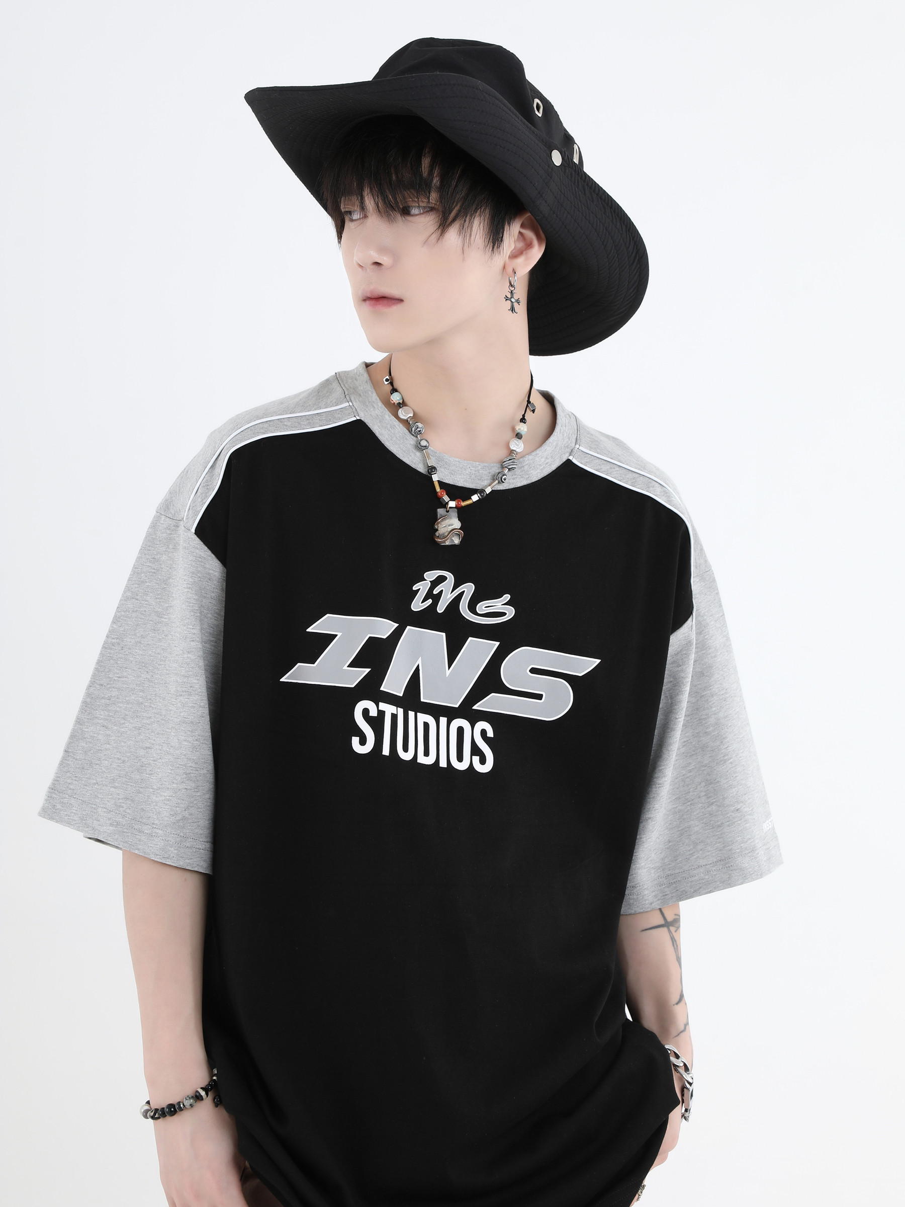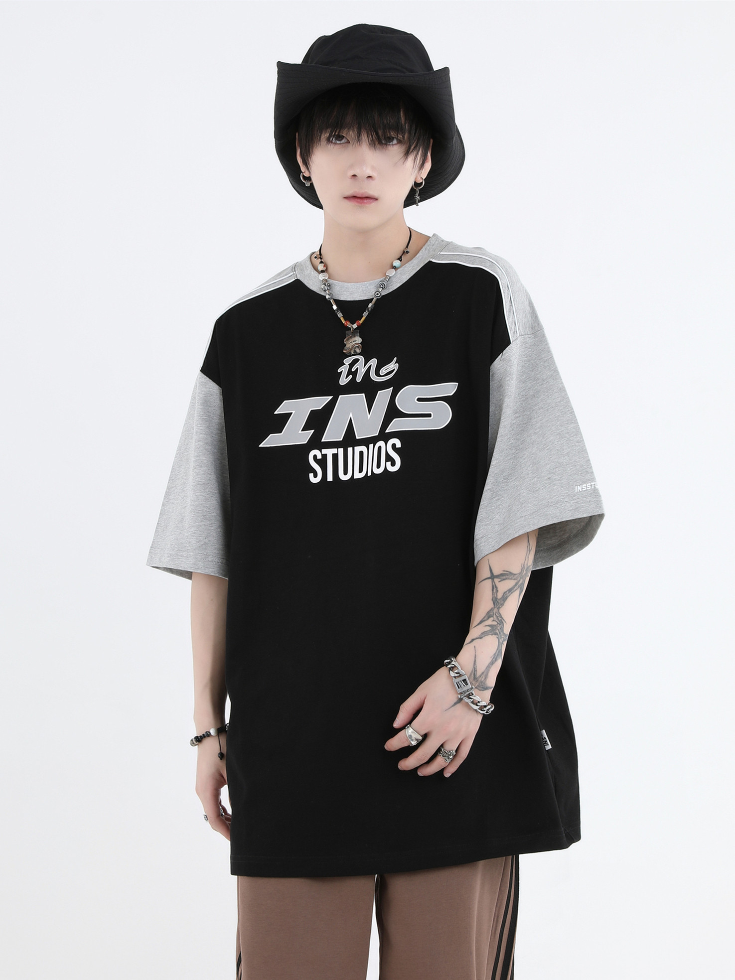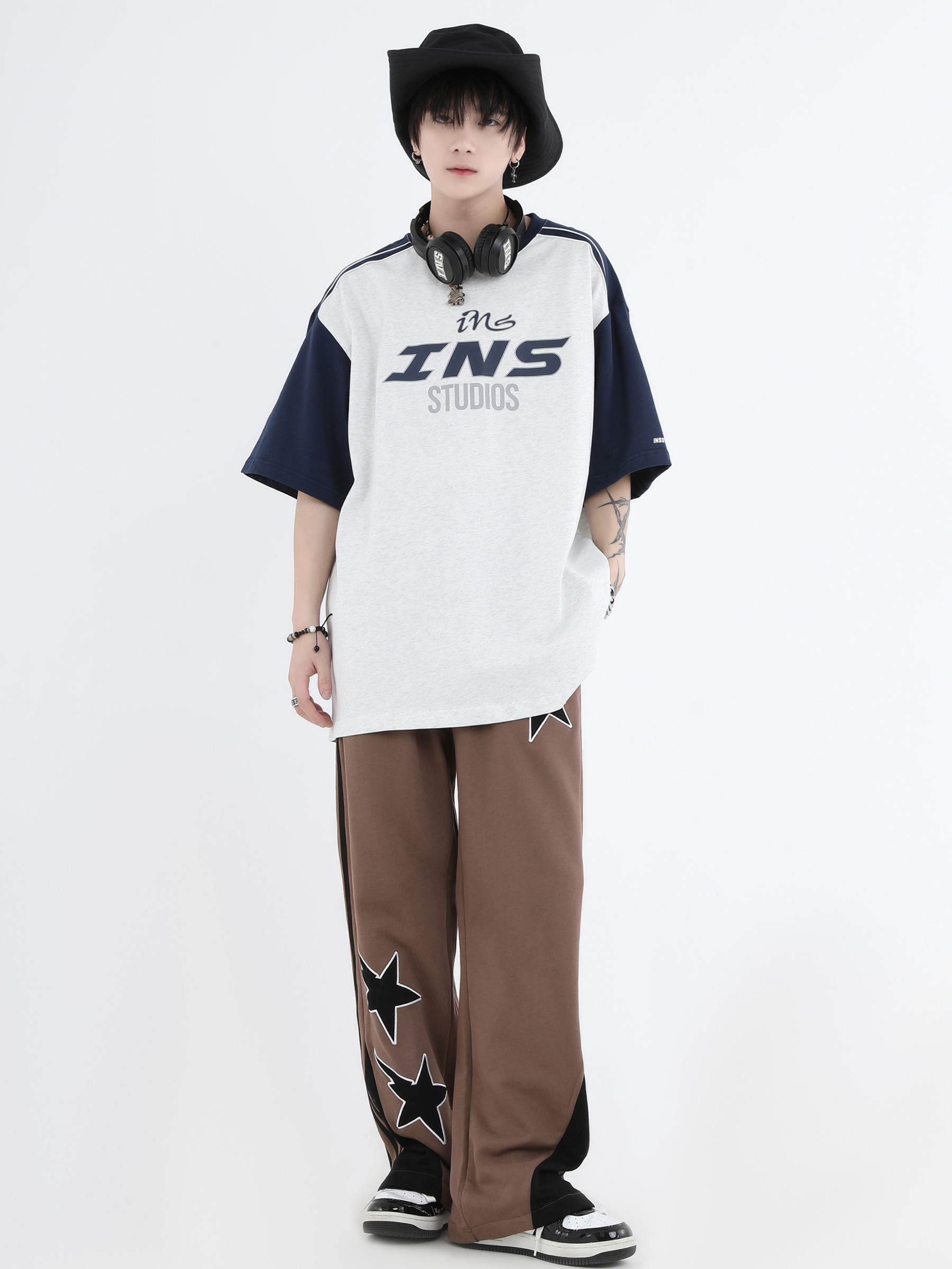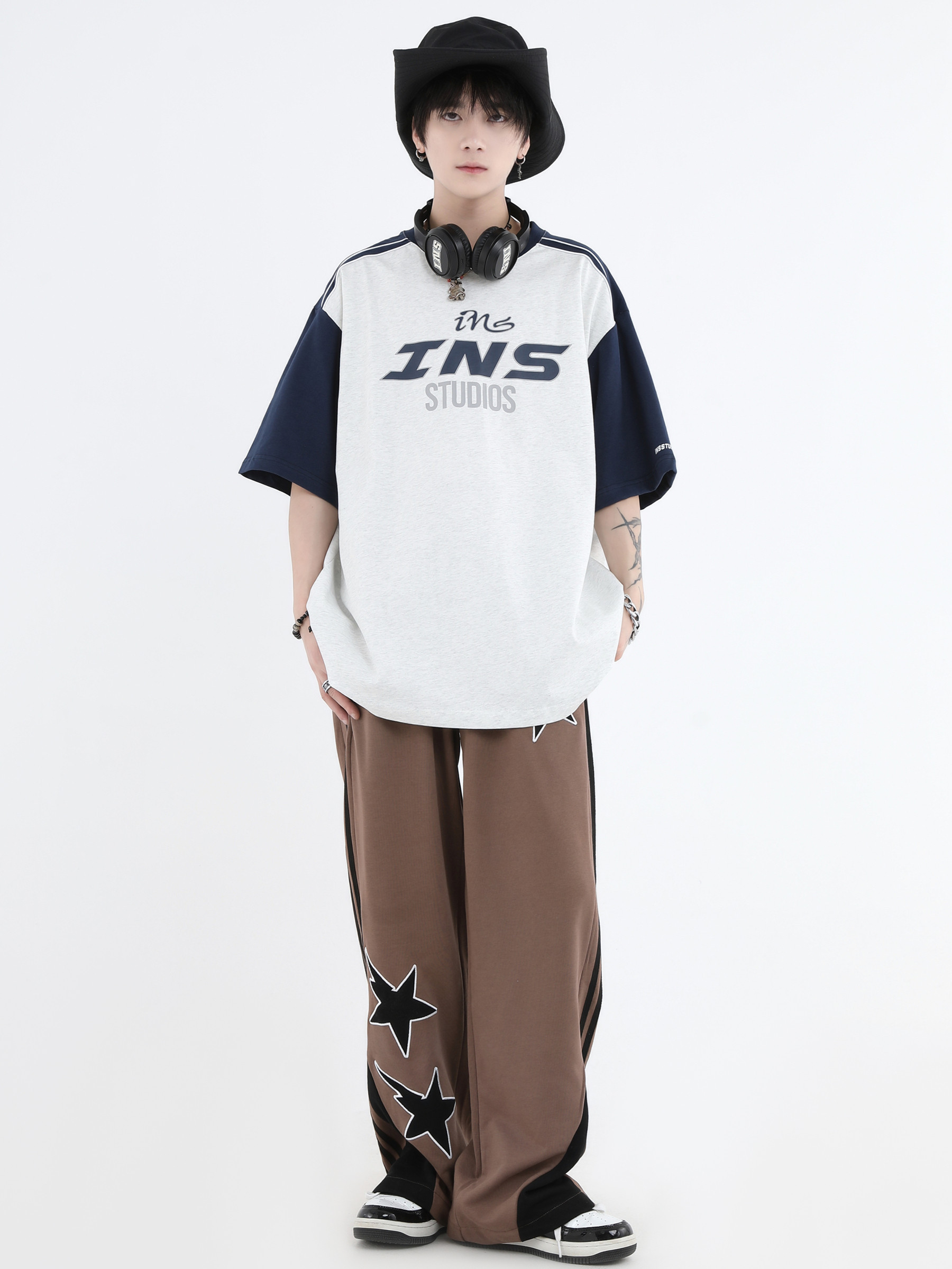 NOPASS 國潮牌情侶原創美式肩部撞色夾條印花短袖寬鬆半袖純棉T恤